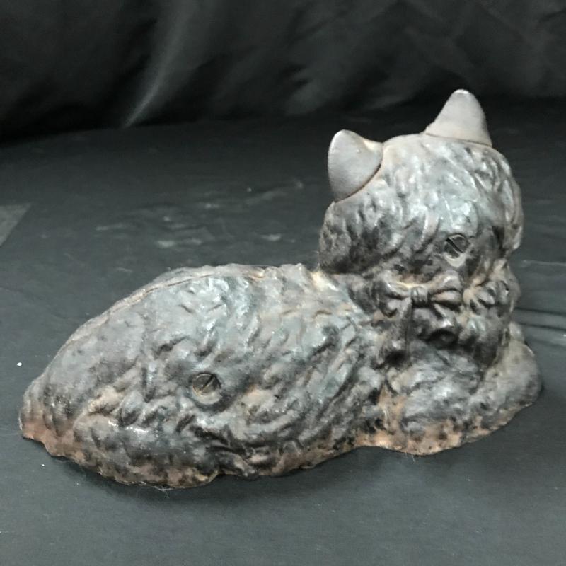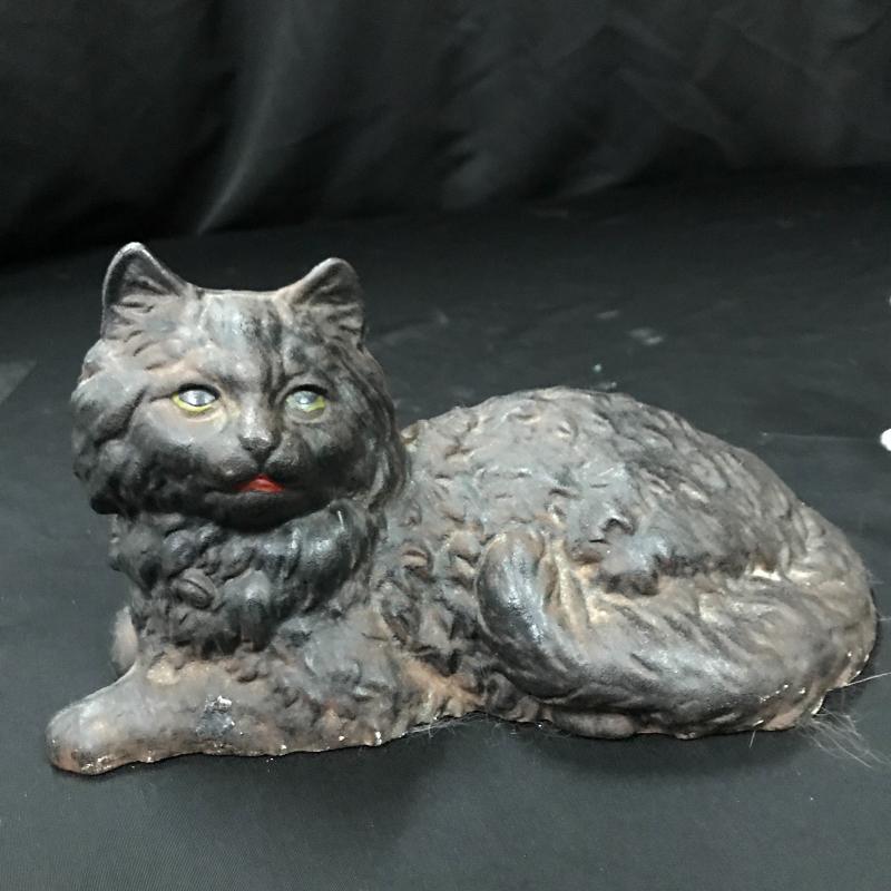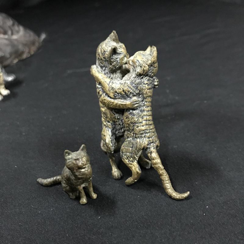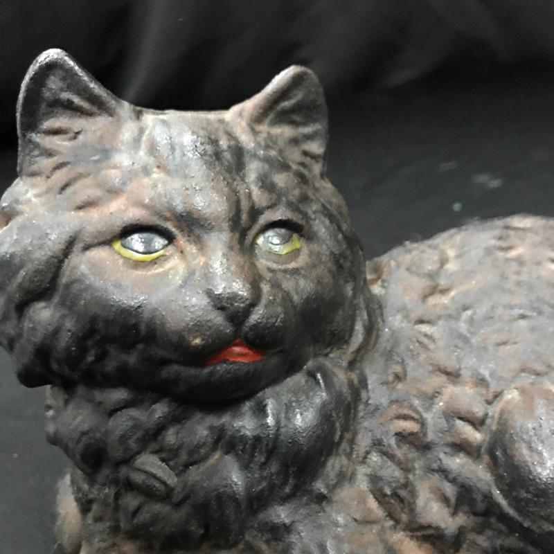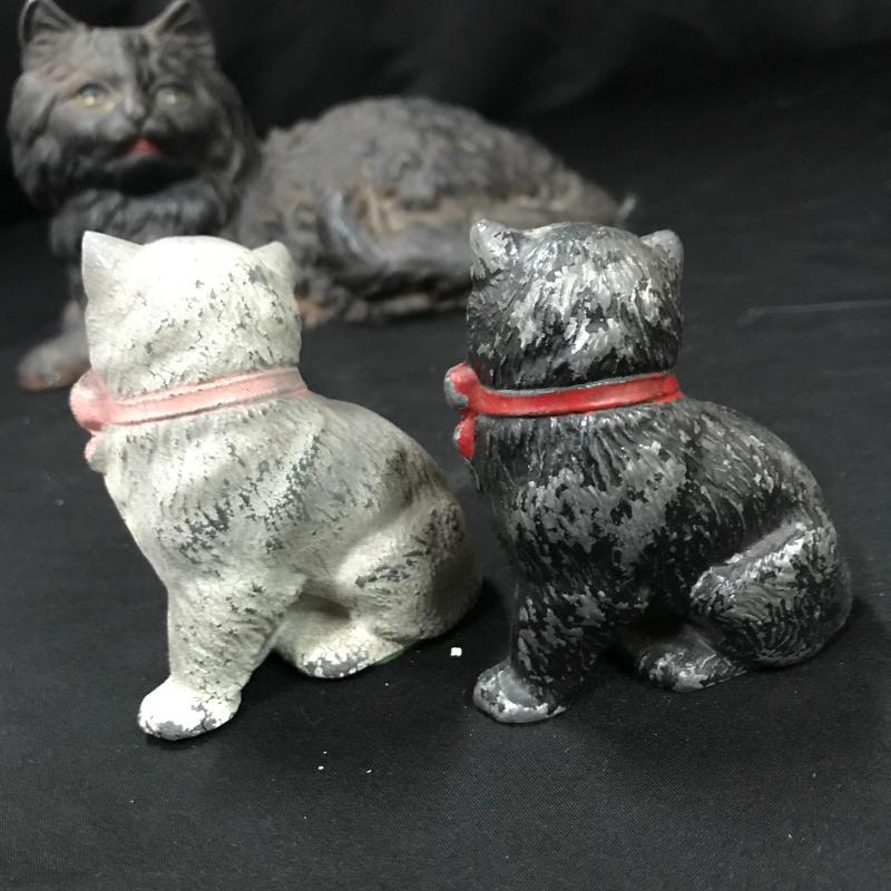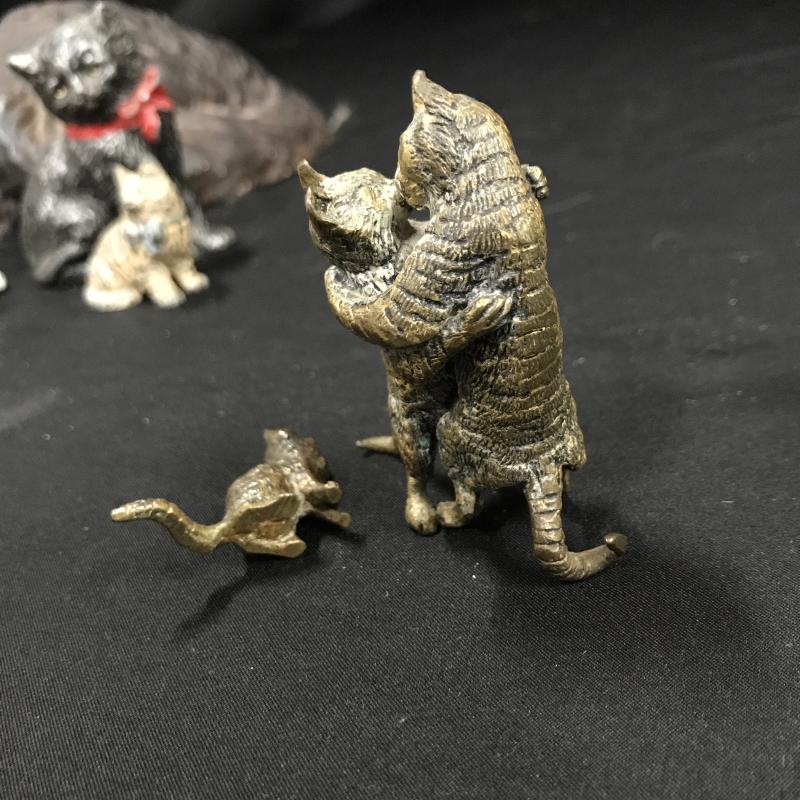 Collectible cats mostly in cast iron. Includes large doorstop and kissing bronze family. See photo of ruler for approximate sizes and details. One cat seems to be missing a peice that it should be holding. Shipping or local pick up in Asheville