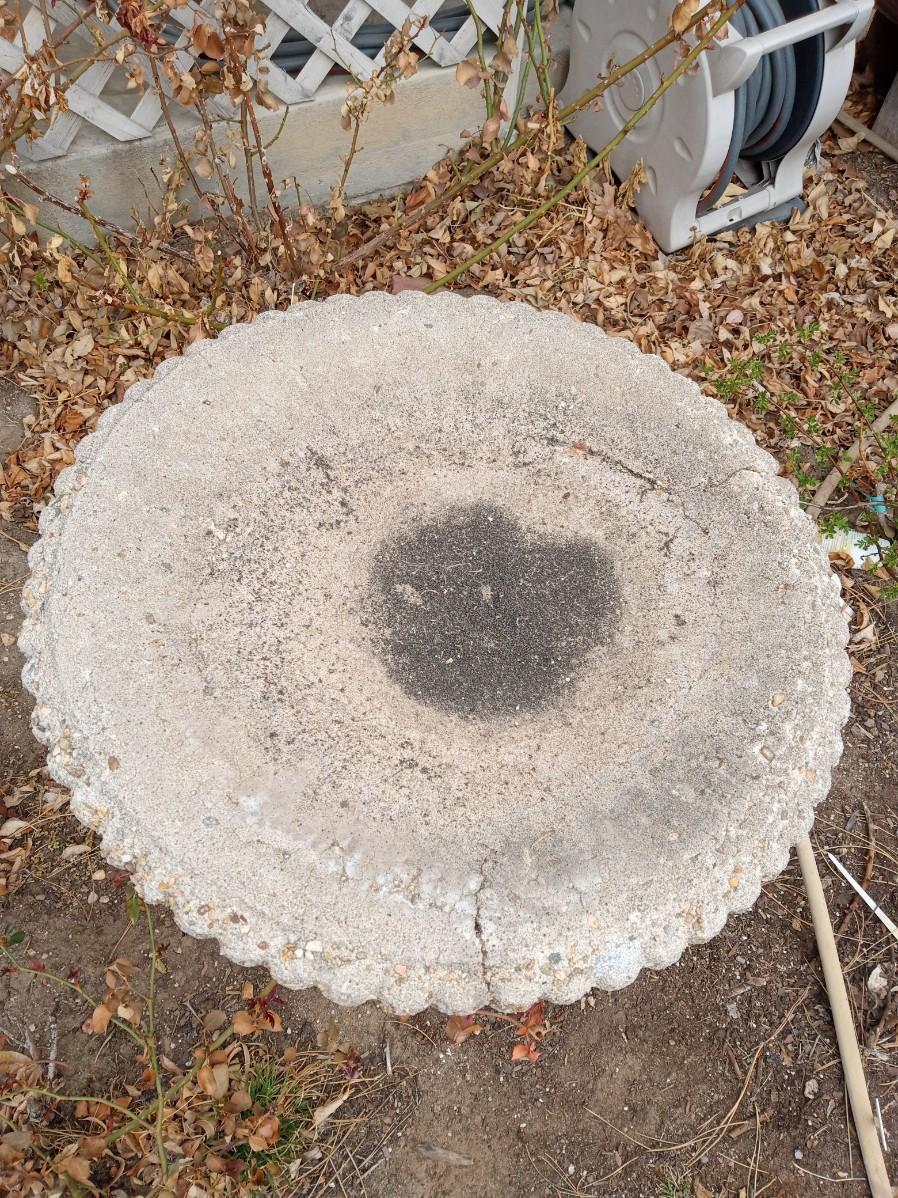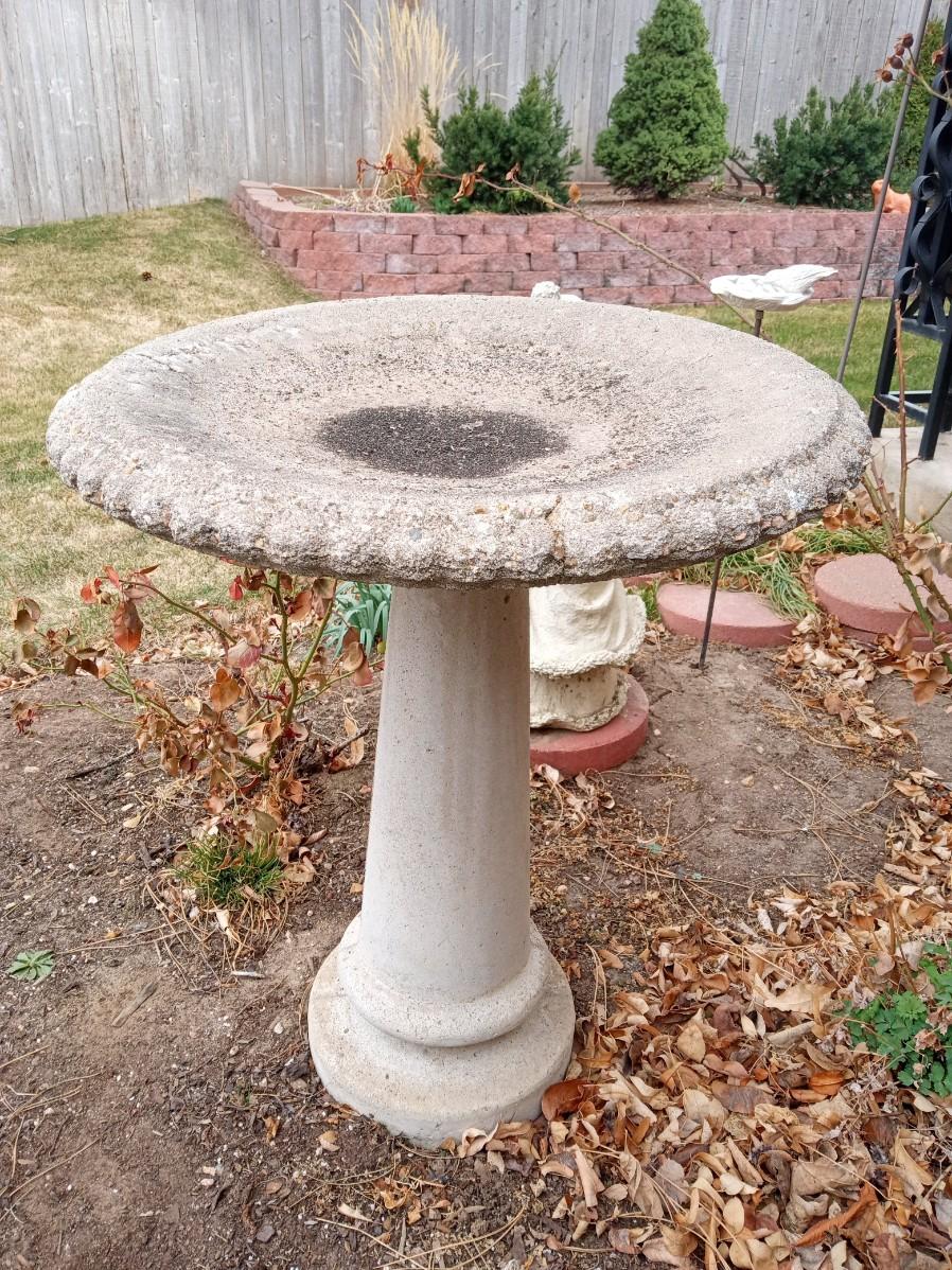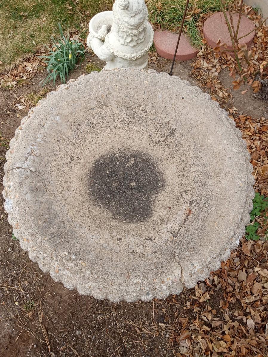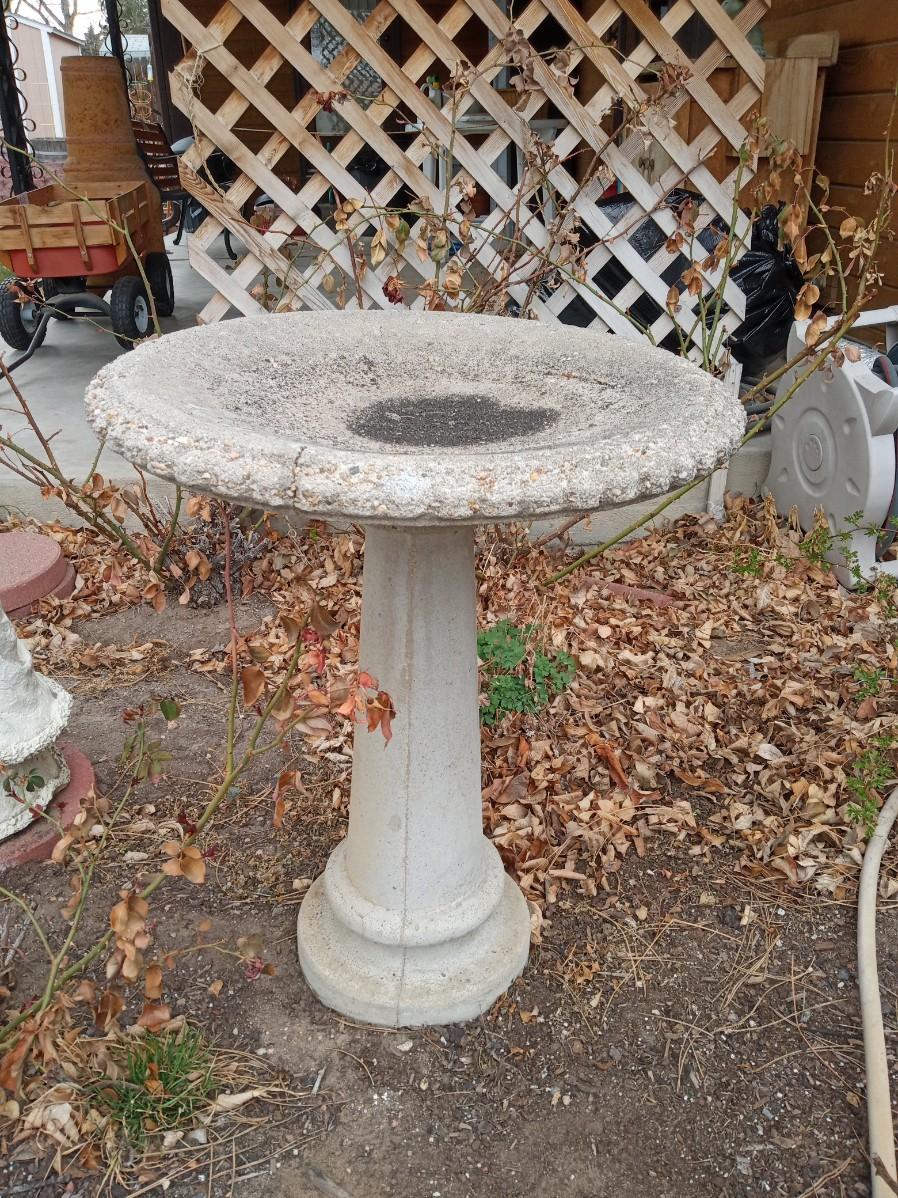 2 PIECE CONCRETE BIRDBATH 26" X 22". THE TOP HAS A FEW CRACKS THAT ARE NOT ALL THE WAY THROUGH