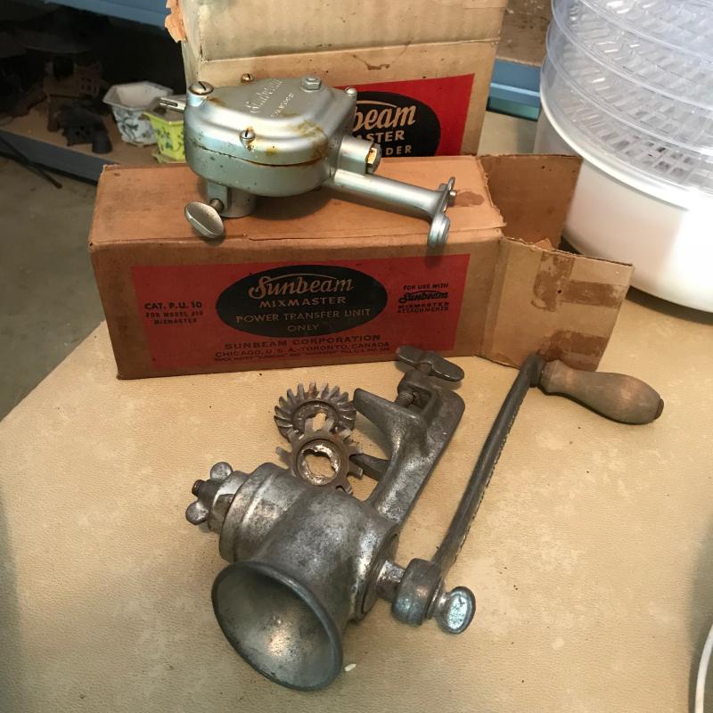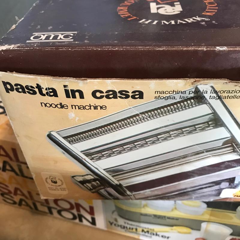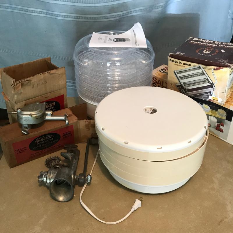 This lot includes two dehydrators that look like they have never been used. Also includes a pasta noodle maker, yogurt maker and a vintage Sunbeam Meat grinder with parts. No shipping. Local pick up only.