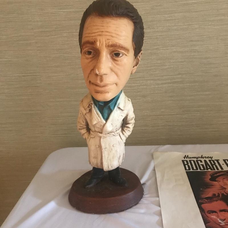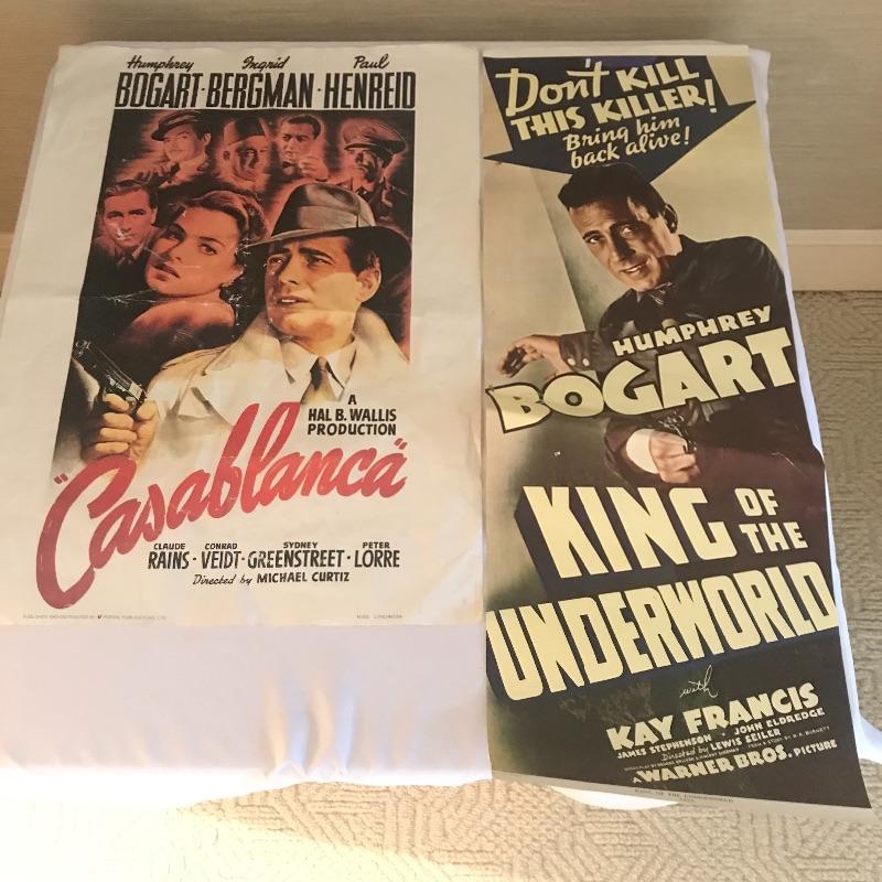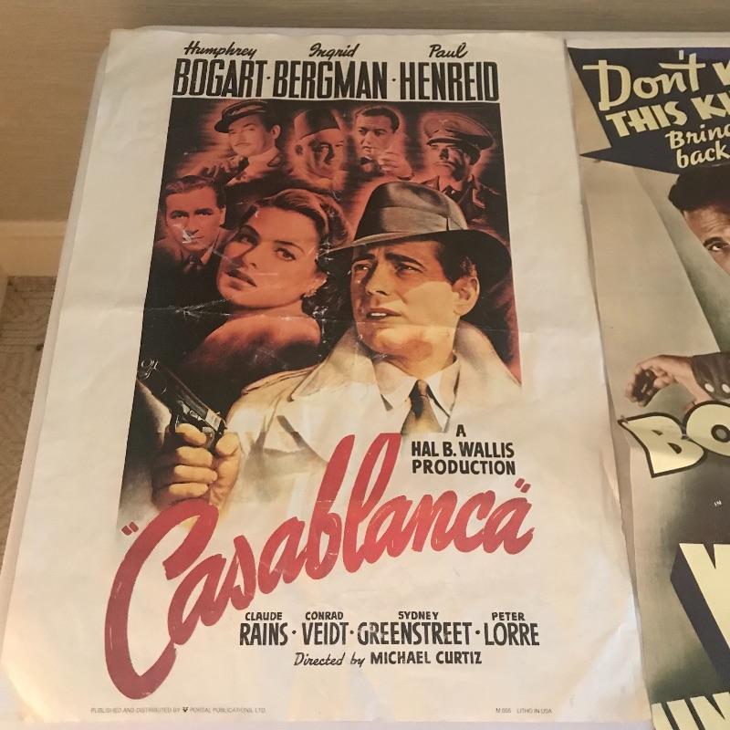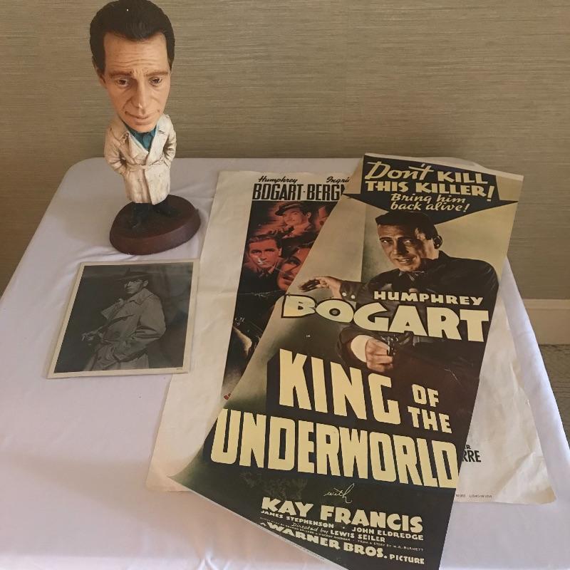 Humphrey Bogart fans will love this collection of a colorful Esco statue that stands 15” tall, 8” x 10” photo is wrapped in plastic on cardboard and a couple of movie posters with the long slender one measuring 36” x13”. Items in this lot are in fair to very good condition. Shipping available.