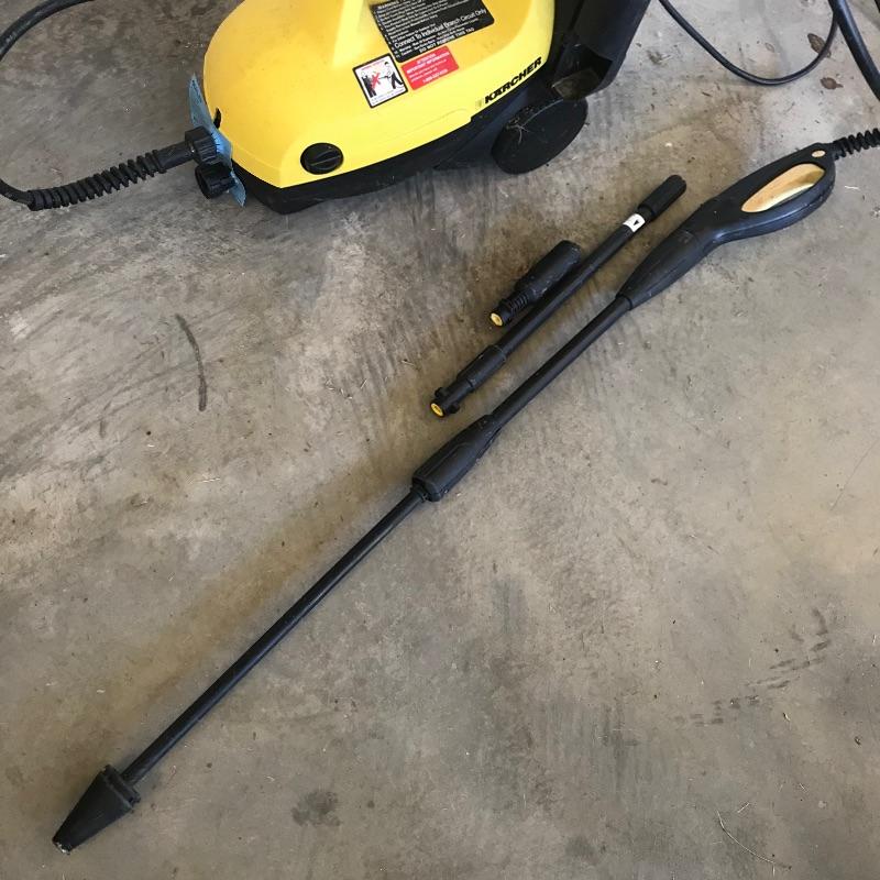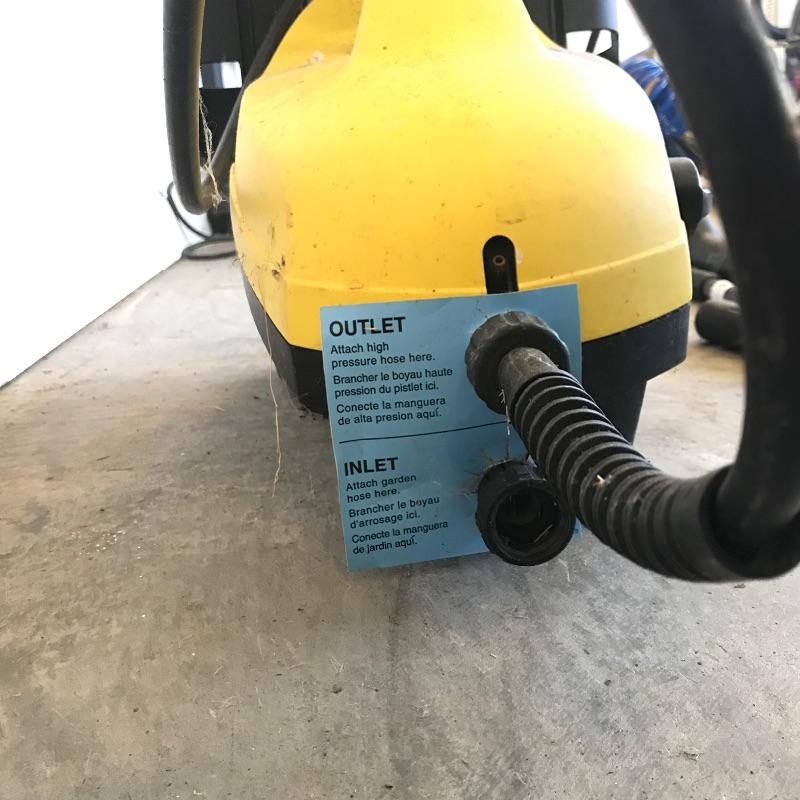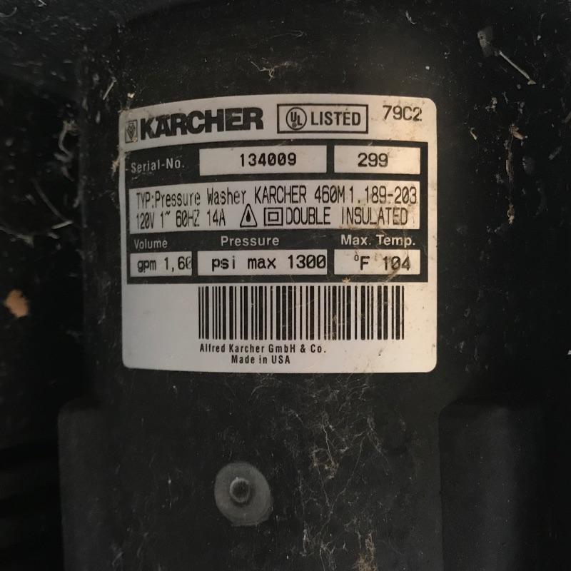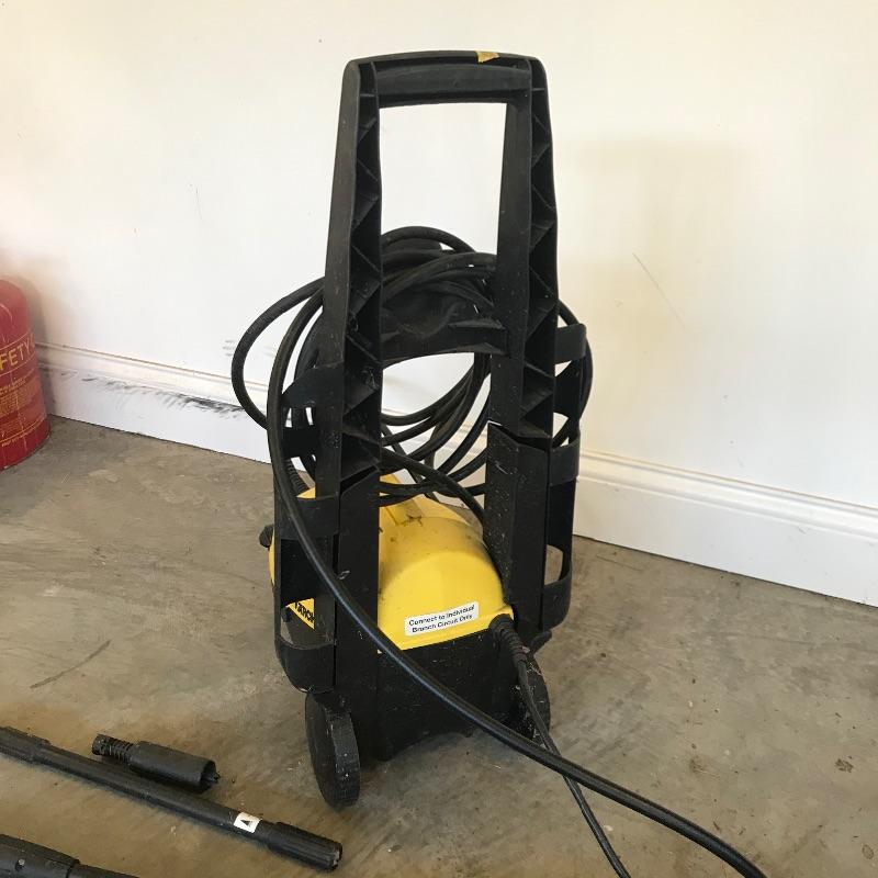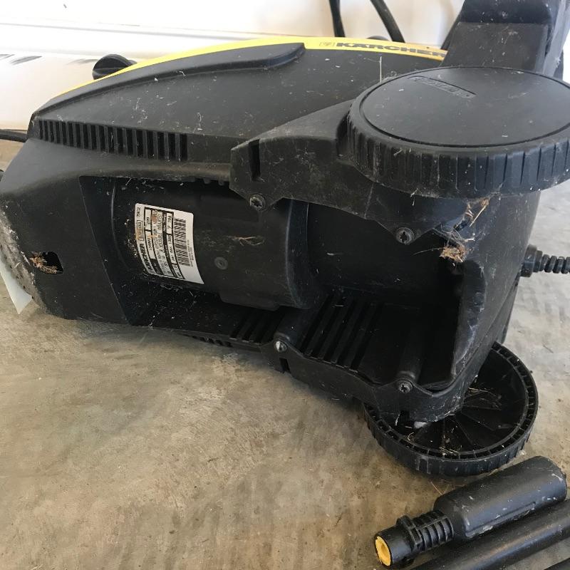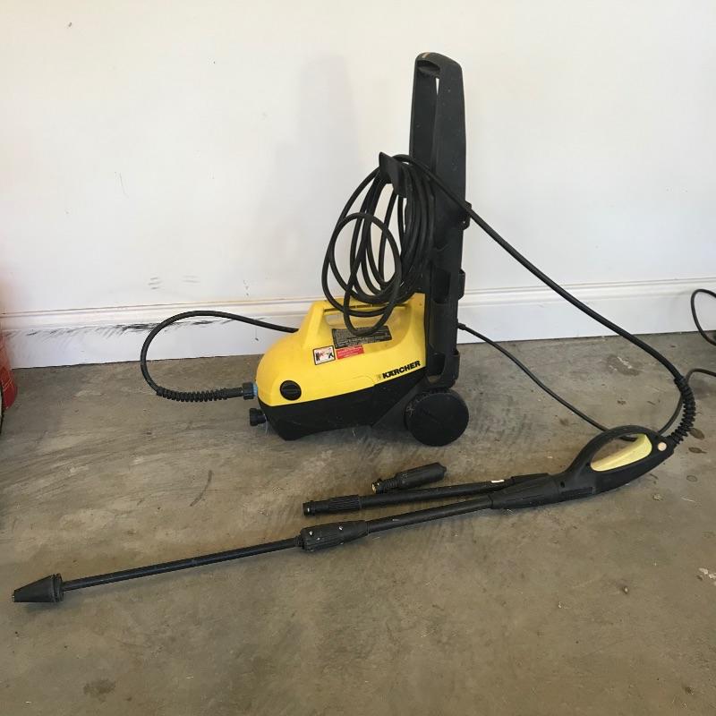 Karcher 460M lightweight pressure washer for your home! This machine is ideal for occasional use or a second washer. Hose is 4 meters long and comes with two extra attachments. Machine turns on when plugged in, but we did not test is for efficiency. See photos. No shipping.