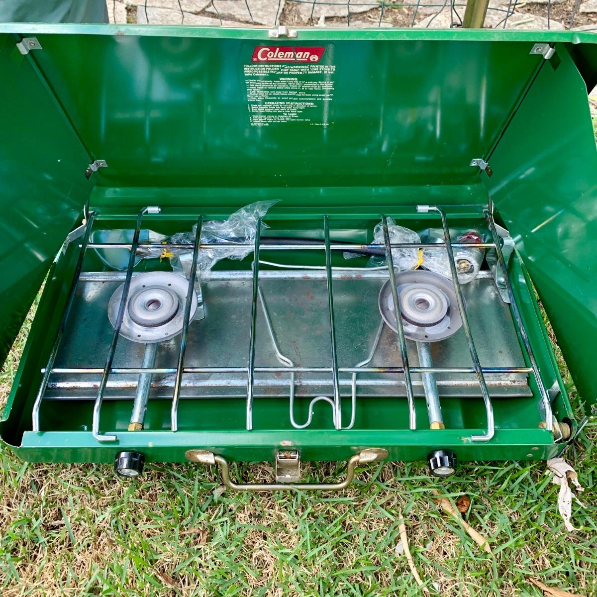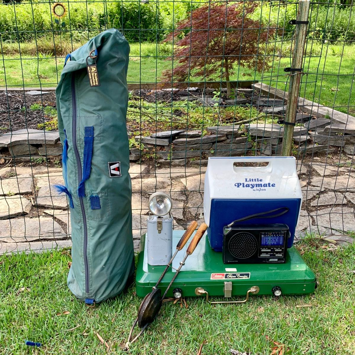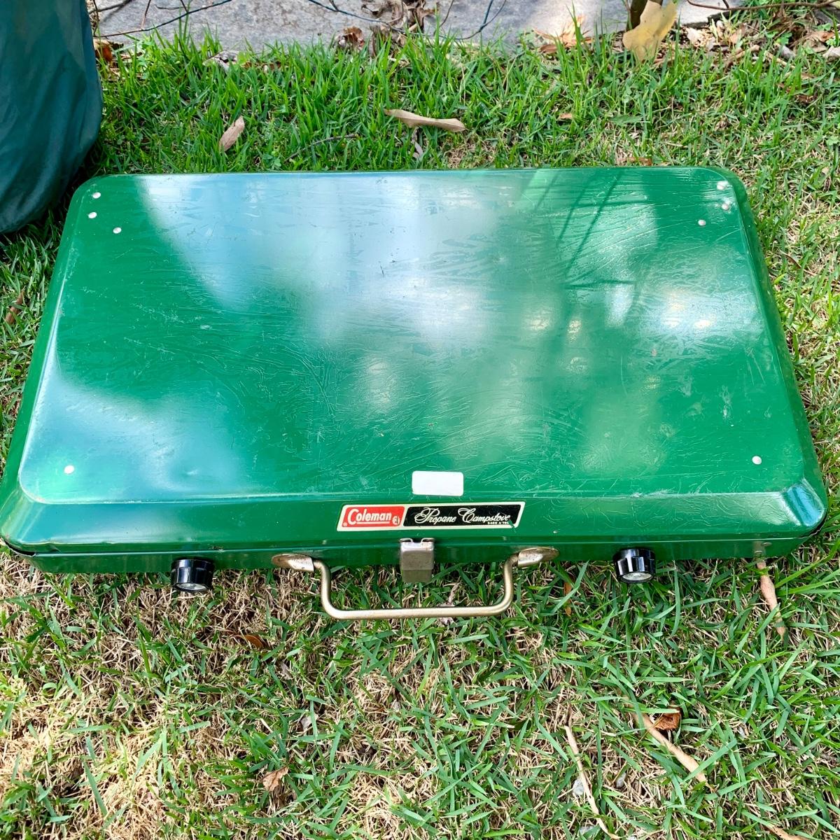 LOT 221 L: Vintage Camping Collection: Coleman Propane Campstove, Sanyo Radio Model #RP8900, Light-Stick Model #2105-4, Academy Broadway Tent, & More