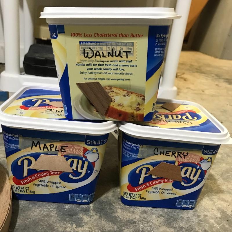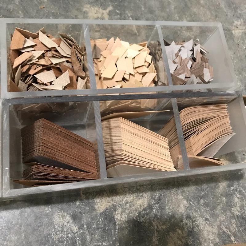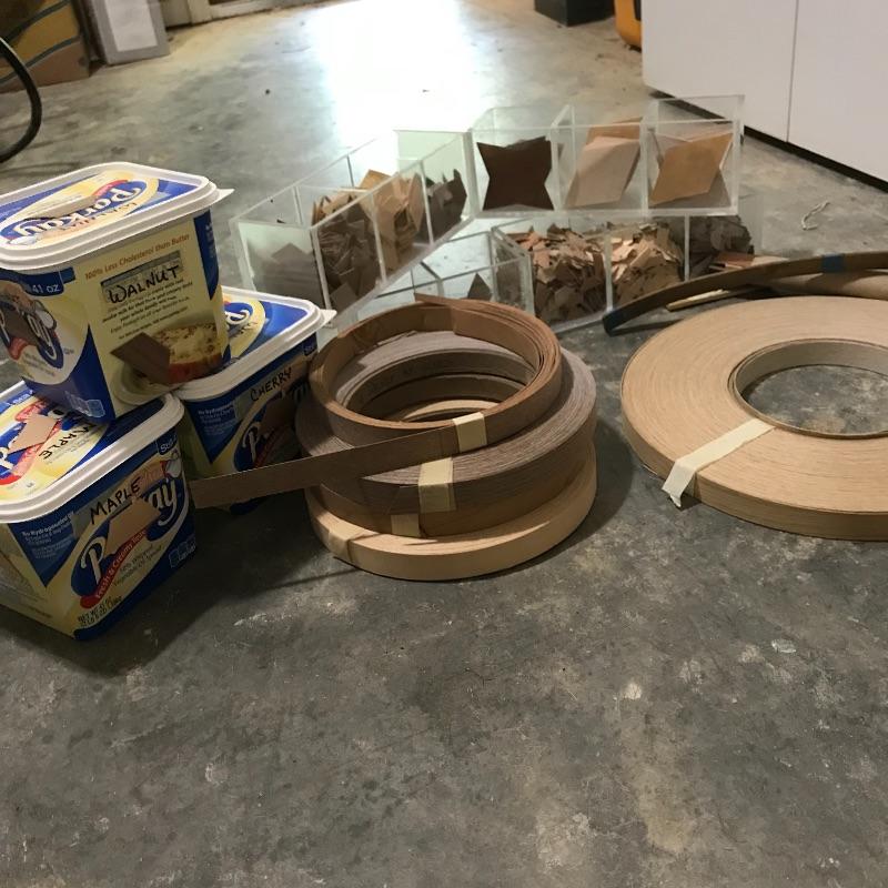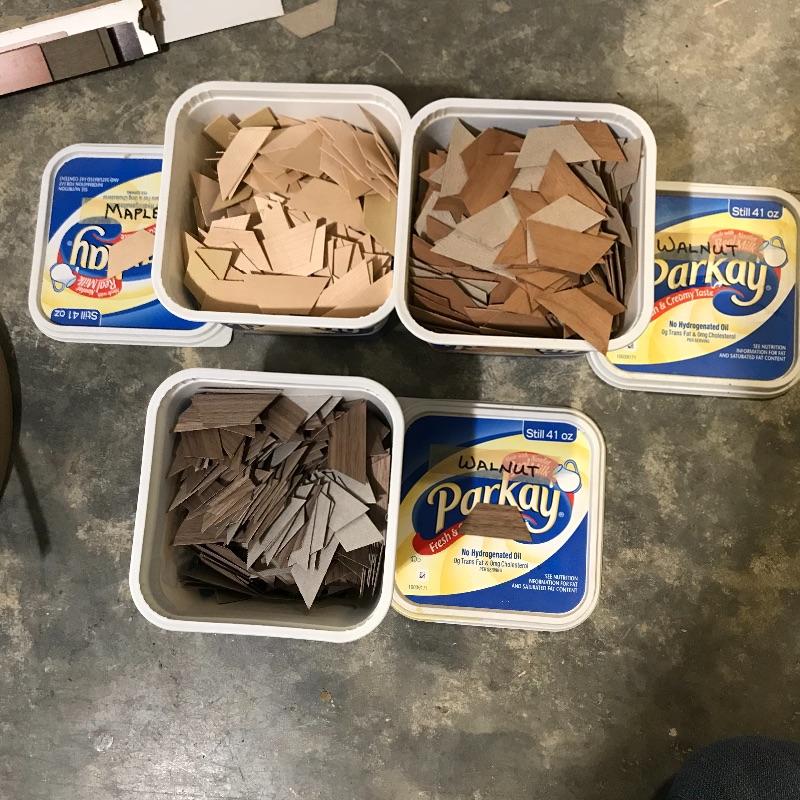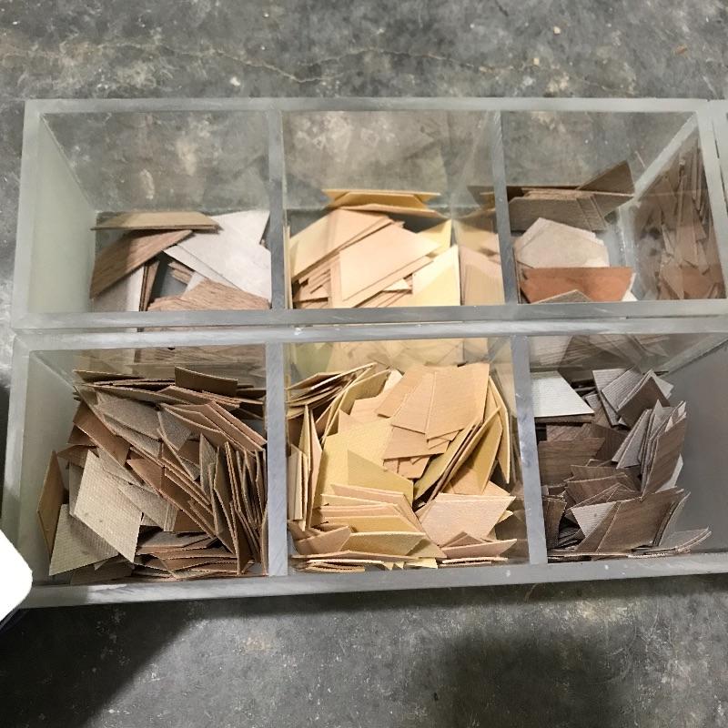 Large lot of small detail pieces of maple and walnut labeled laminate. Four clear 3-compartment boxes each measuring 10” x 3.5” x 3.5”. Lot also includes smaller labeled and unlabeled rolls. One Parkay tub’s top is labeled maple, but sides with corresponding sample piece states cherry. See photos. No shipping.