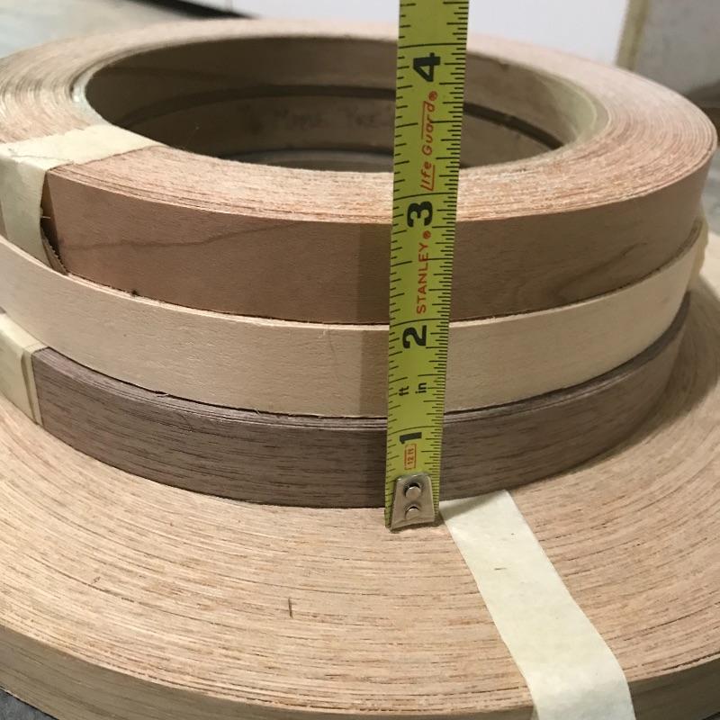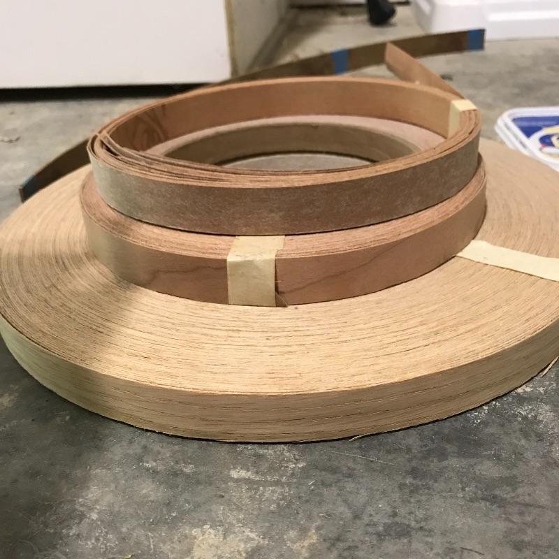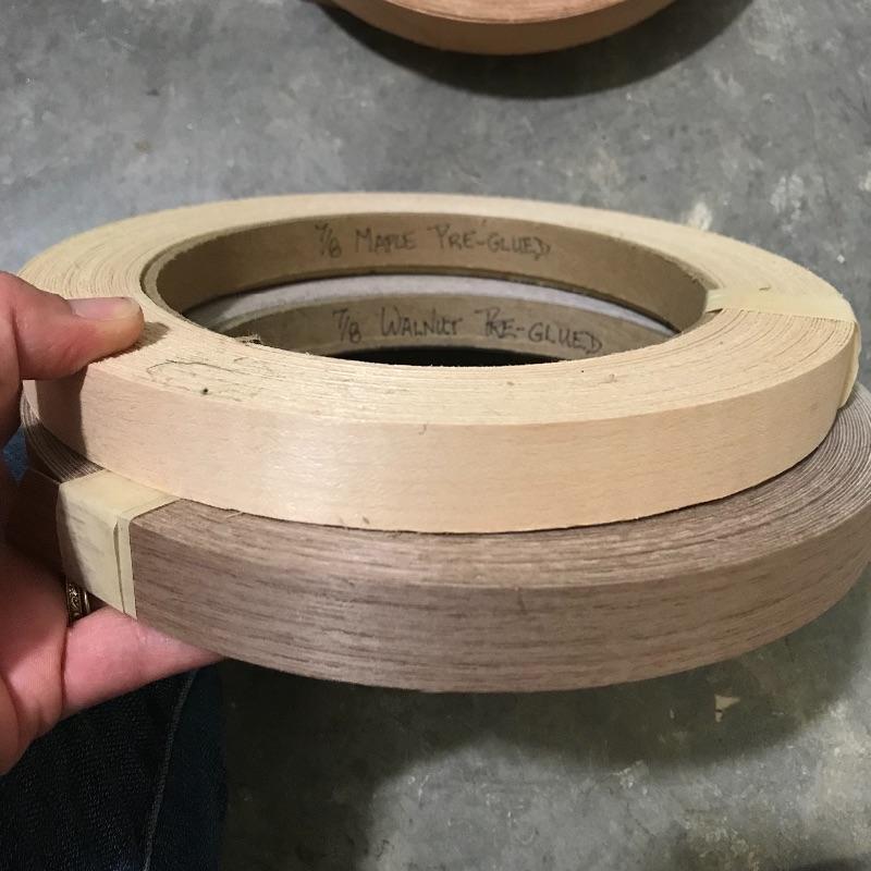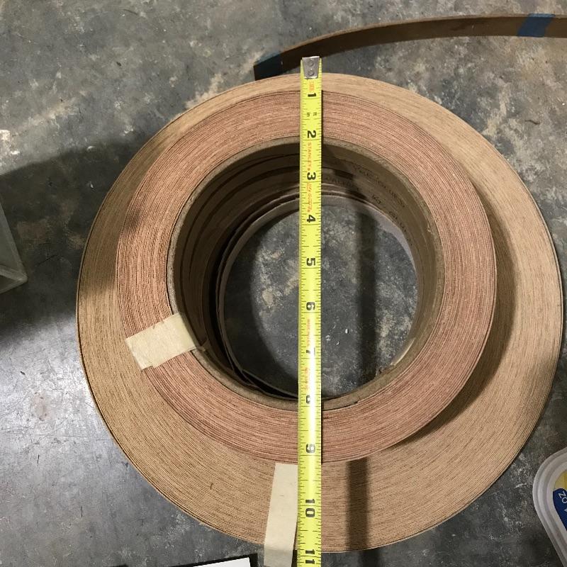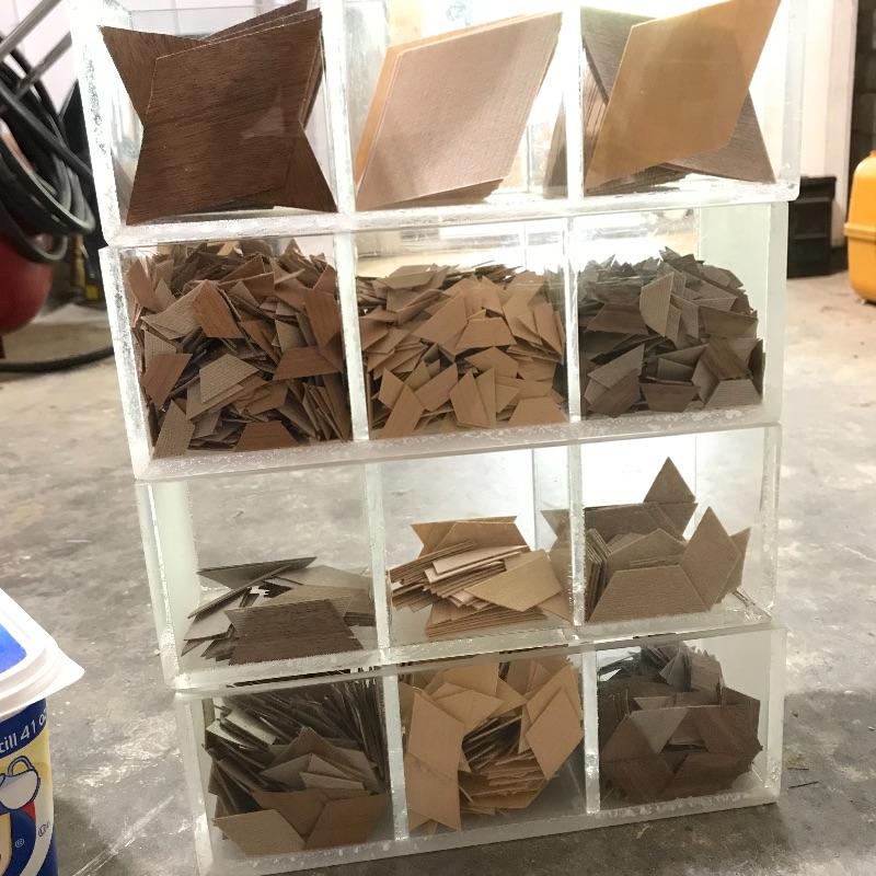 Large lot of small detail pieces of maple and walnut labeled laminate. Four clear 3-compartment boxes each measuring 10” x 3.5” x 3.5”. Lot also includes smaller labeled and unlabeled rolls. One Parkay tub’s top is labeled maple, but sides with corresponding sample piece states cherry. See photos. No shipping.