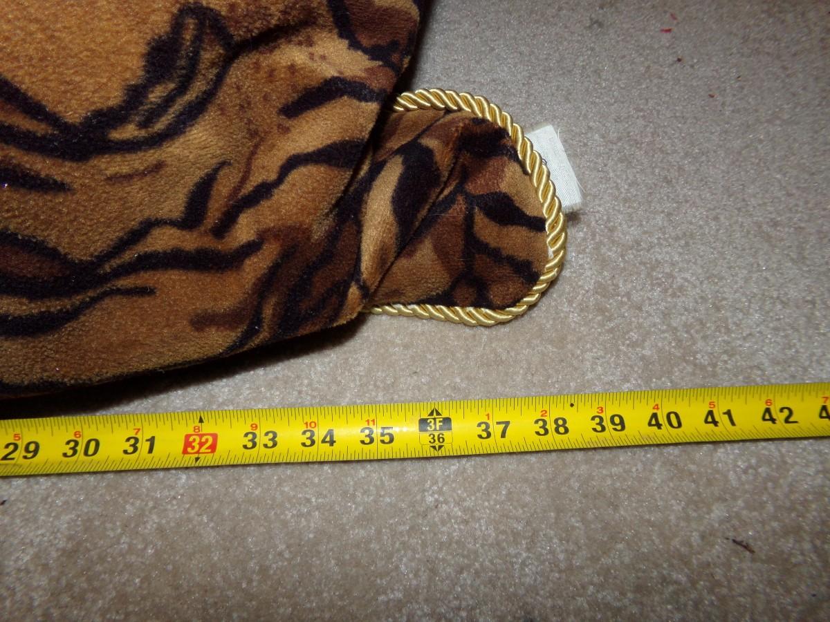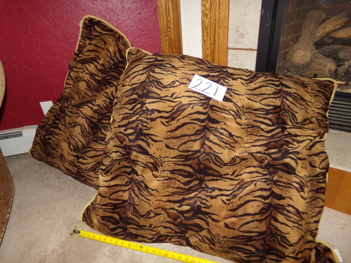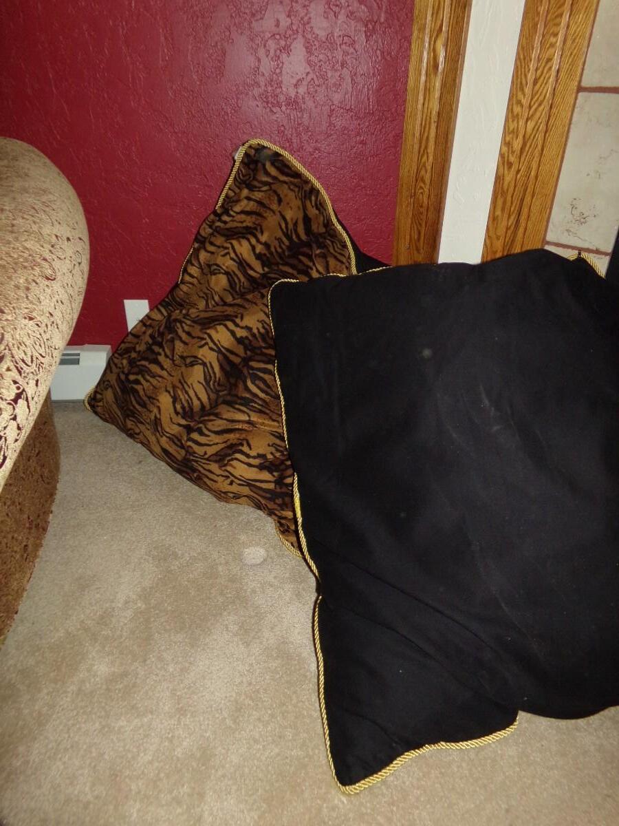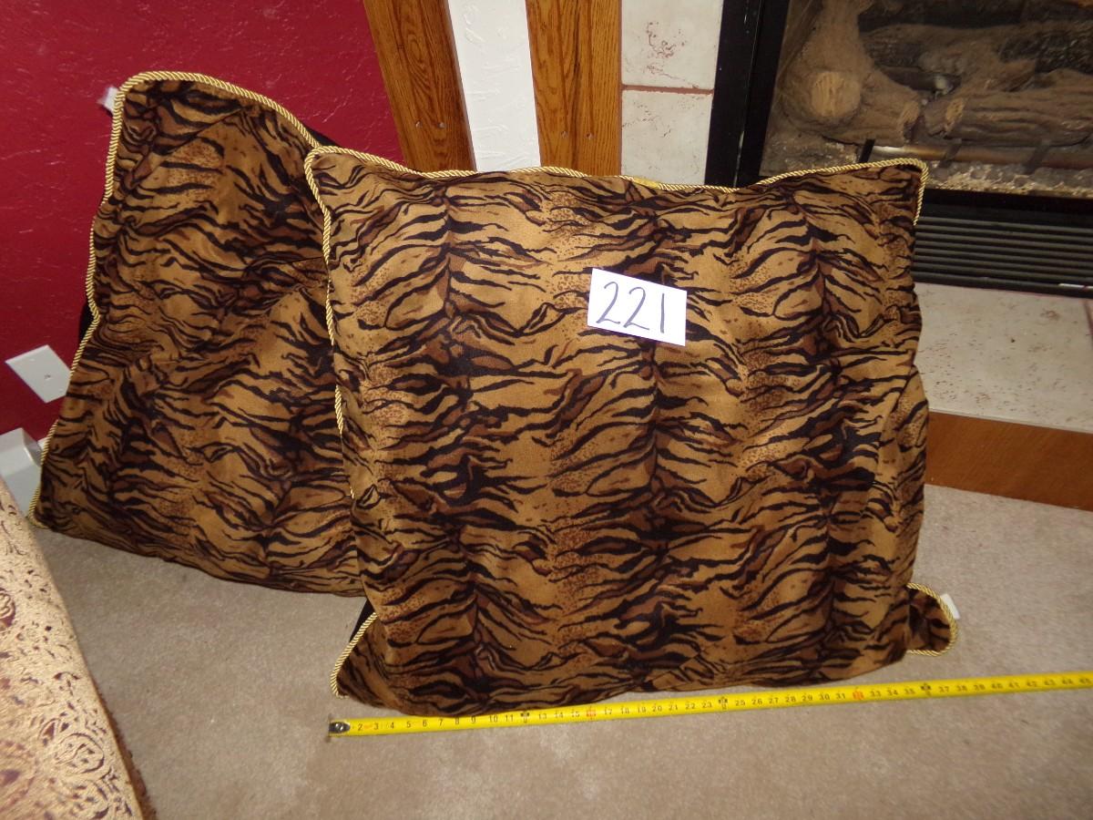 2 LARGE ACCENT PILLOWS. MEASURES 39 ". ONE SIDE IS SOLID BLACK AND THE OTHER SIDE IS TIGER COLORED.