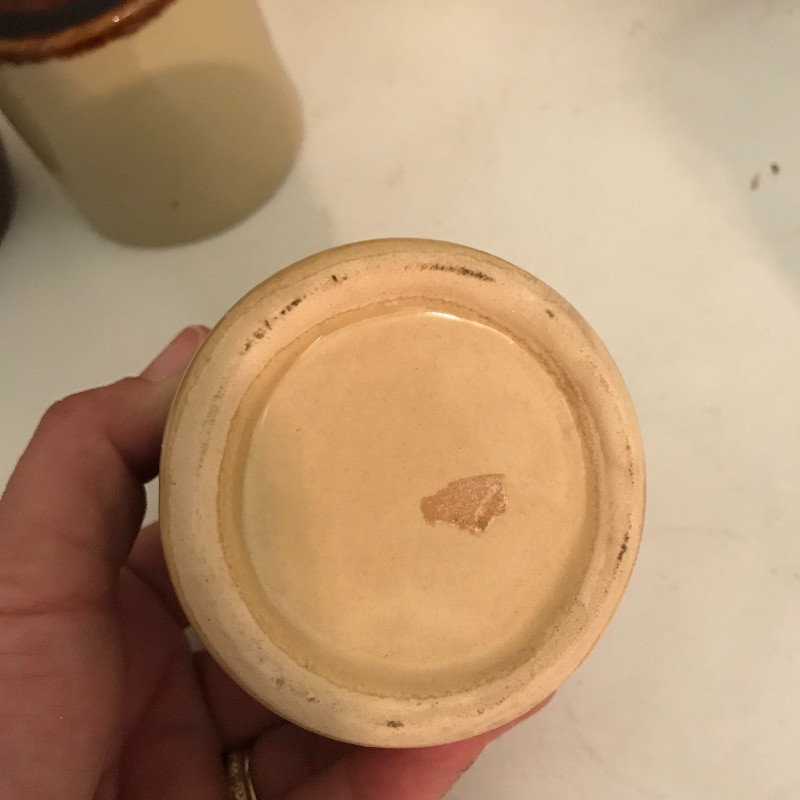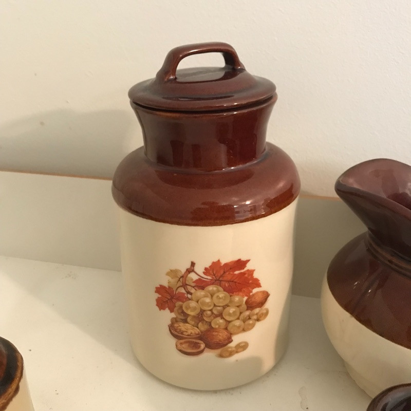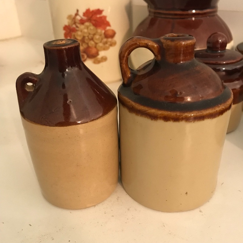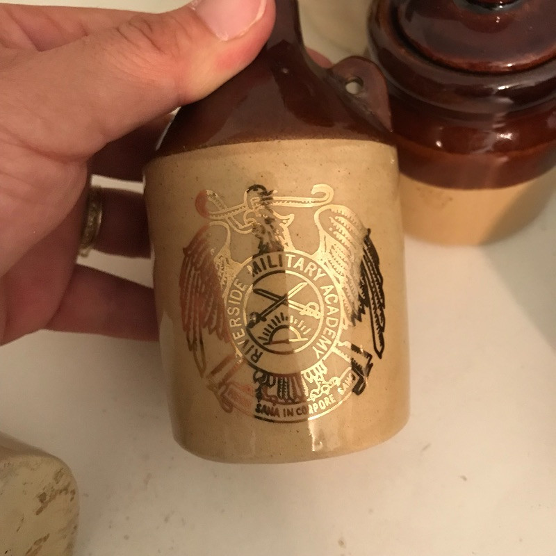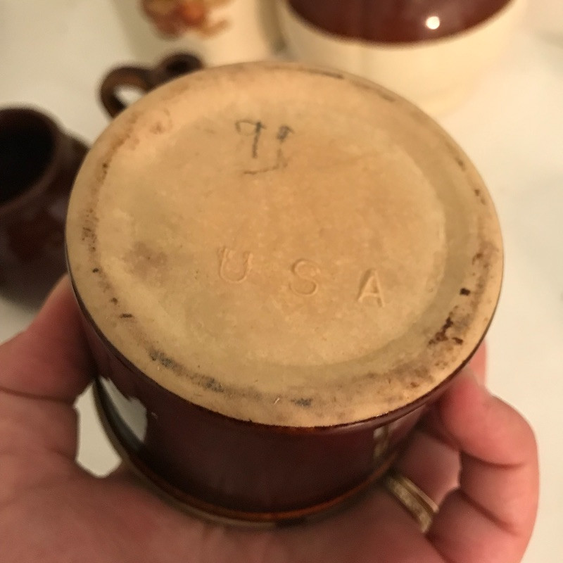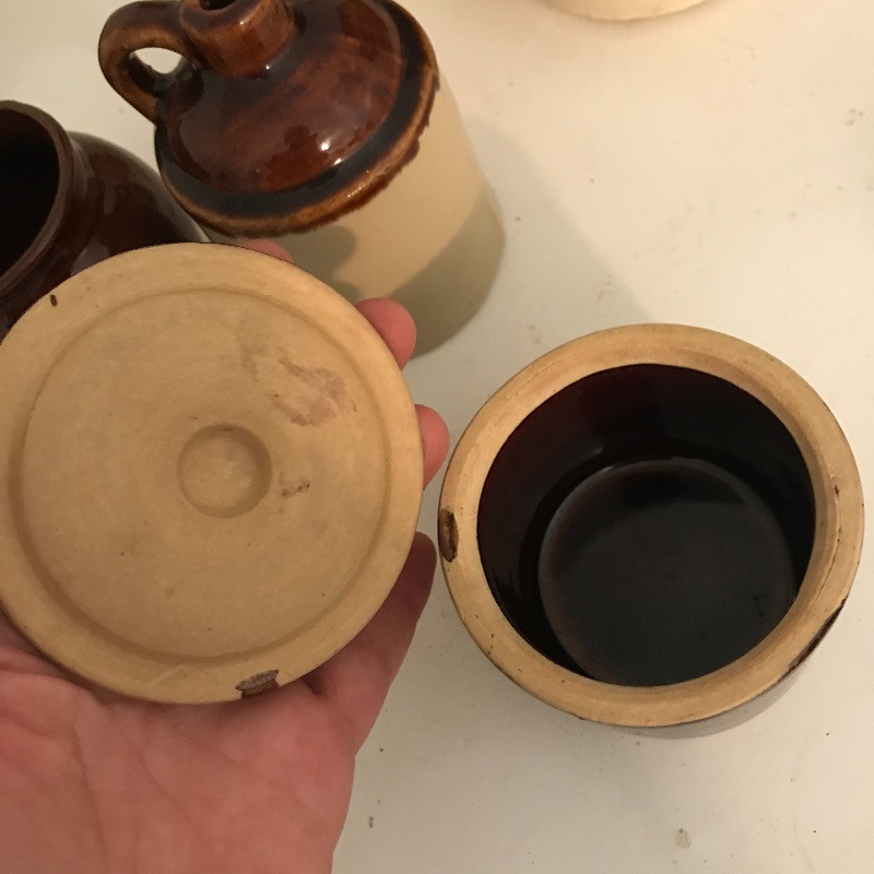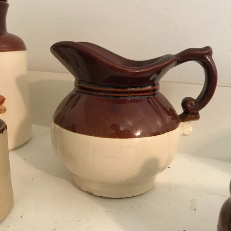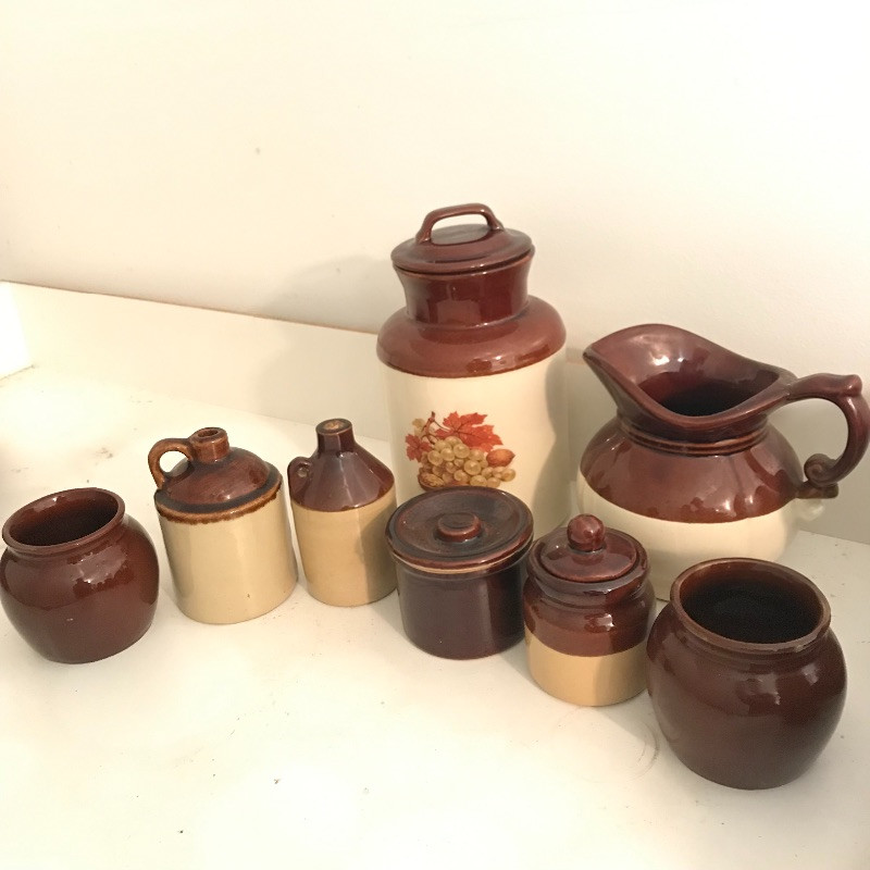 McCoy pitcher and canister along with similar looking colored stoneware dishes. The canister is 4.5”d x 9” with the lid on. Lovely pitchers perfect for the accompaniments in your next meal that offer a feeling of earlier days. One pitcher with a cork fix in its opening has a shiny gold Military Academy face, see images. Local Pickup Only.
