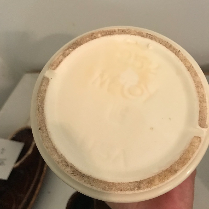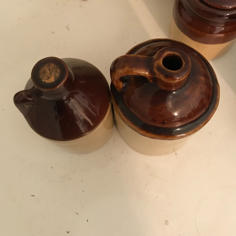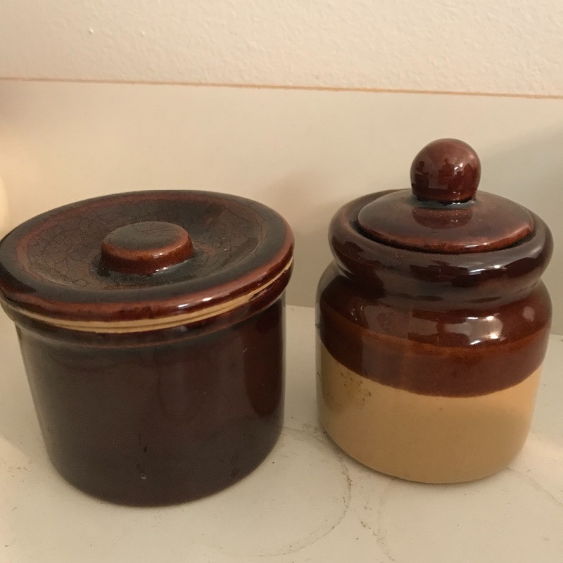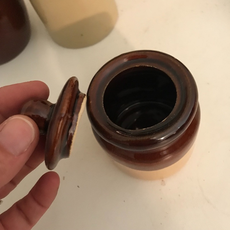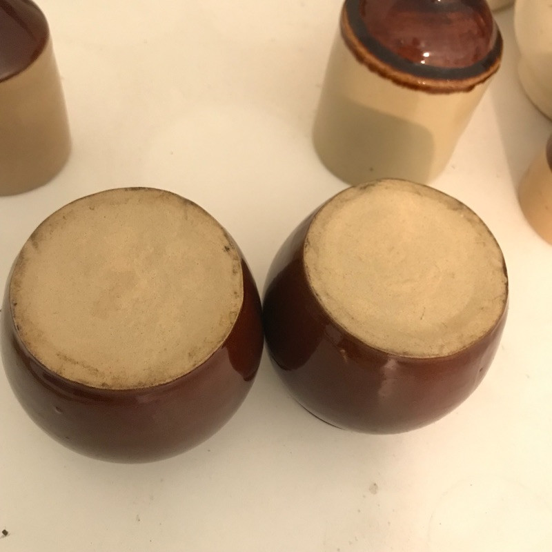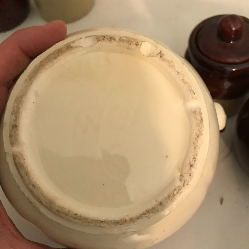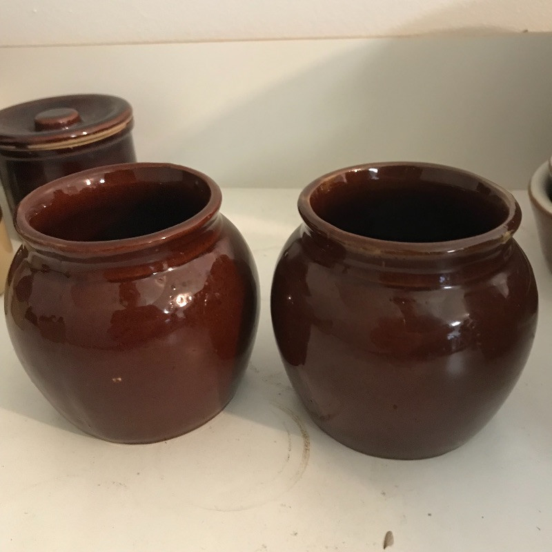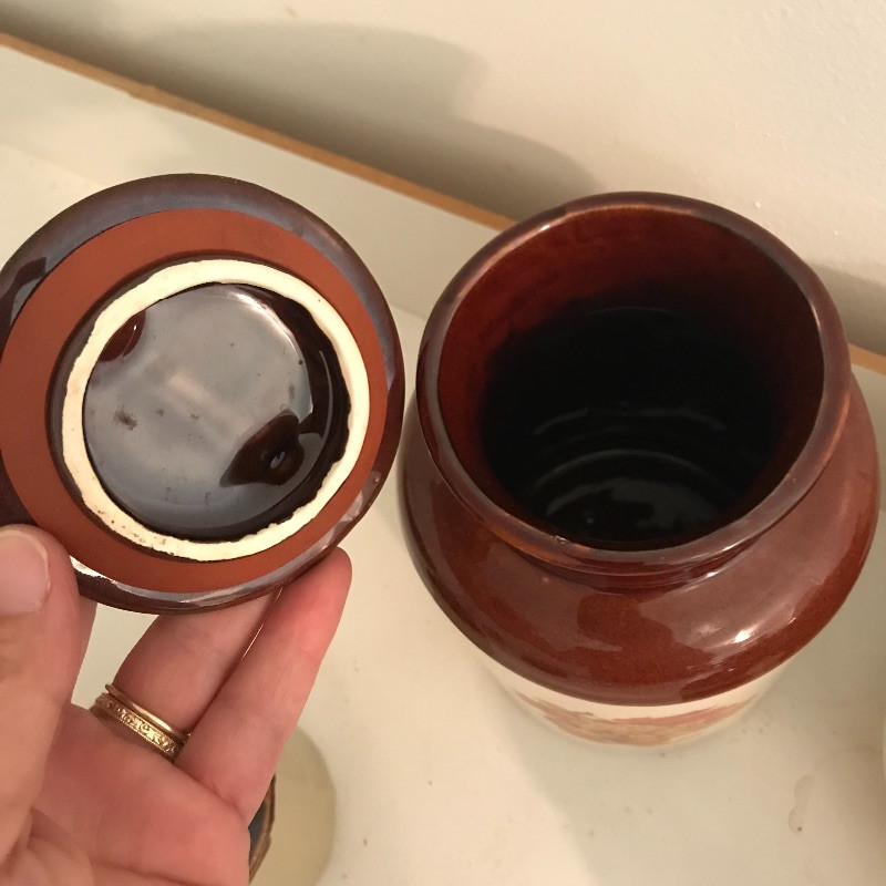 McCoy pitcher and canister along with similar looking colored stoneware dishes. The canister is 4.5”d x 9” with the lid on. Lovely pitchers perfect for the accompaniments in your next meal that offer a feeling of earlier days. One pitcher with a cork fix in its opening has a shiny gold Military Academy face, see images. Local Pickup Only.