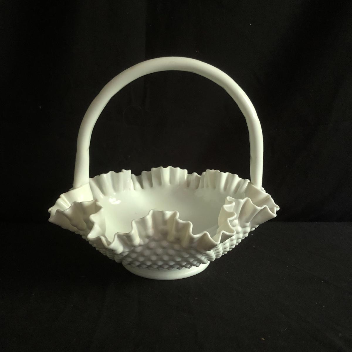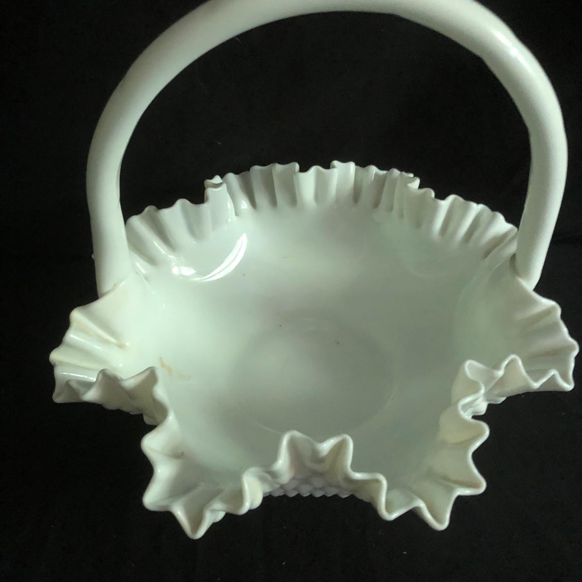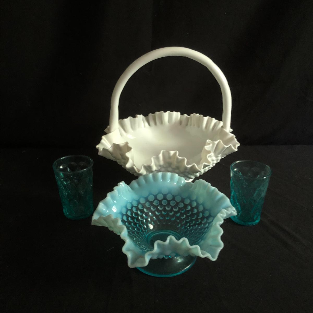 This unique milk bowl basket will make a great centerpiece! This lot also includes one footed blue bowl with two small blue glasses. Basket measures 11.5”D x 11.5” tall.