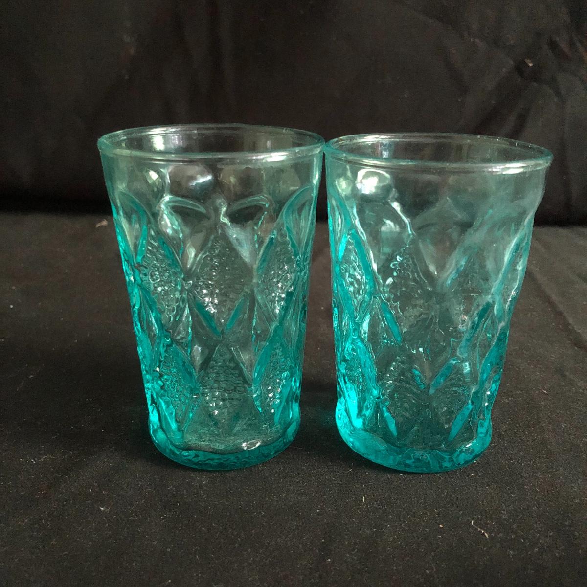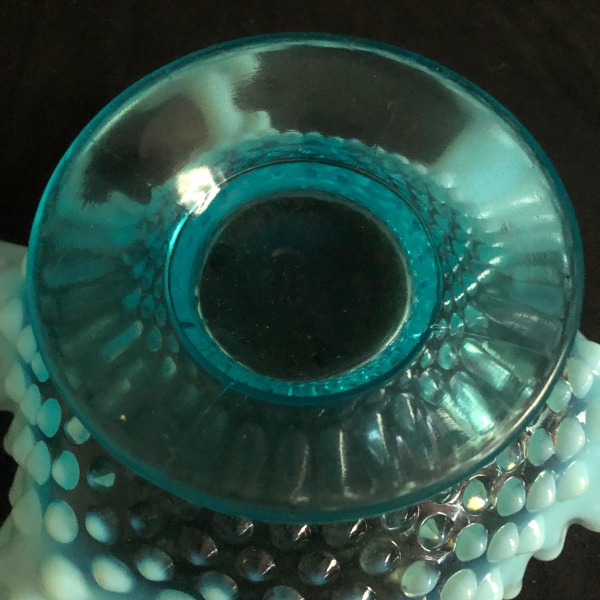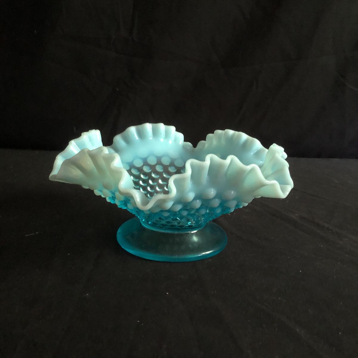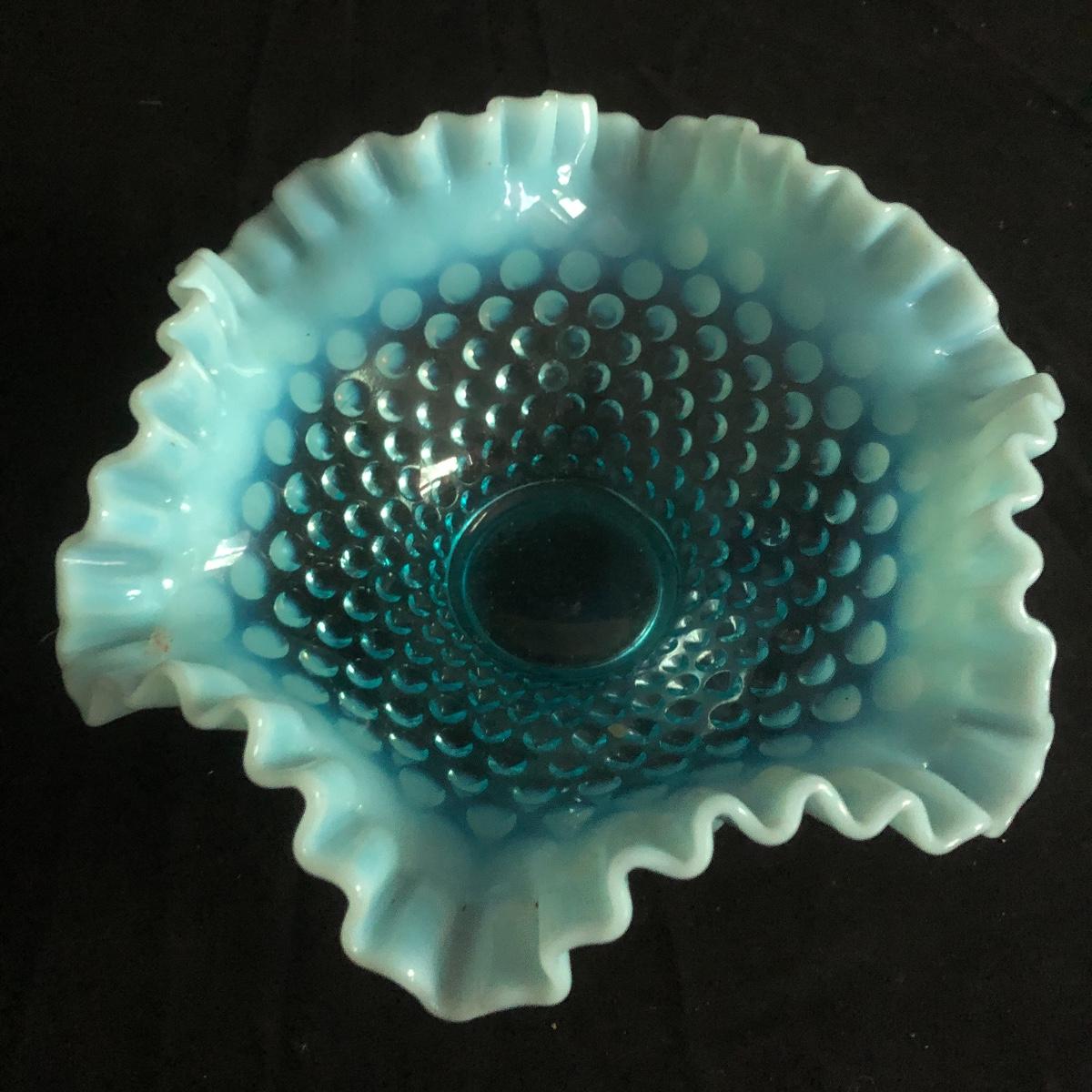 This unique milk bowl basket will make a great centerpiece! This lot also includes one footed blue bowl with two small blue glasses. Basket measures 11.5”D x 11.5” tall.