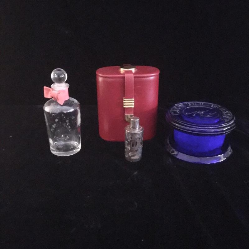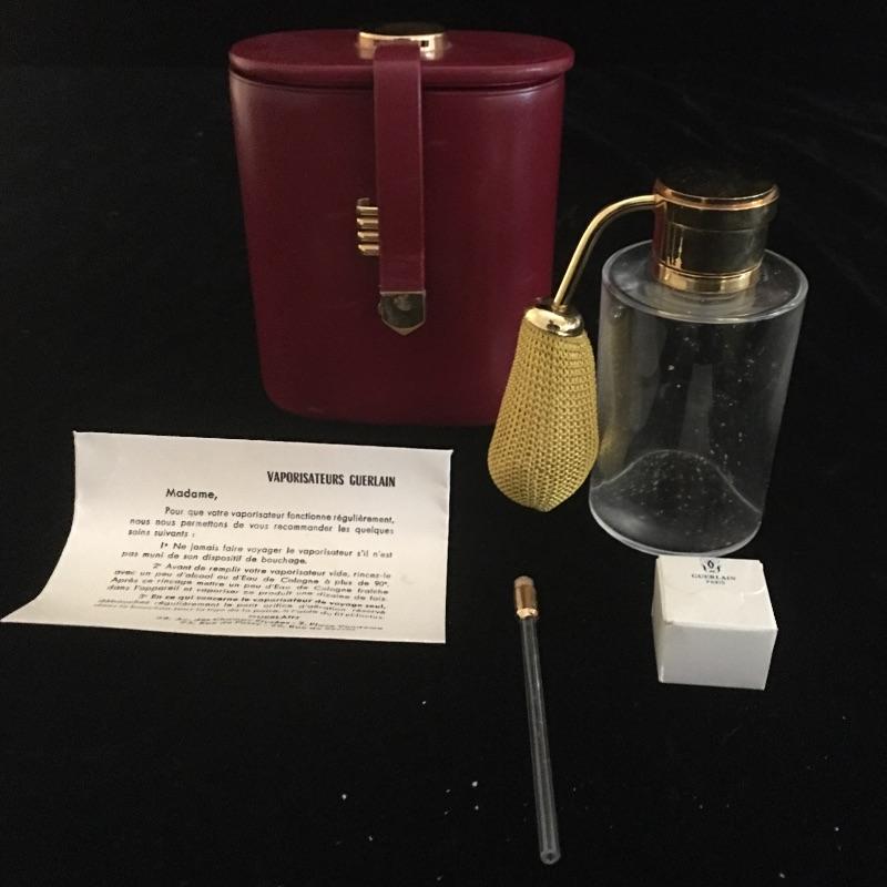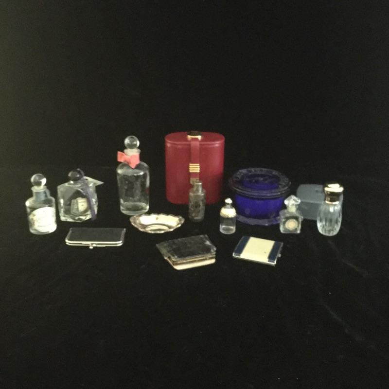 Perfume vaporizer comes with case and accessories, also includes empty makeup and perfume bottles and jars. Vaporizer case measures 2.5” x 4” x 4.5”.