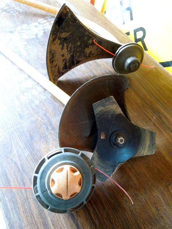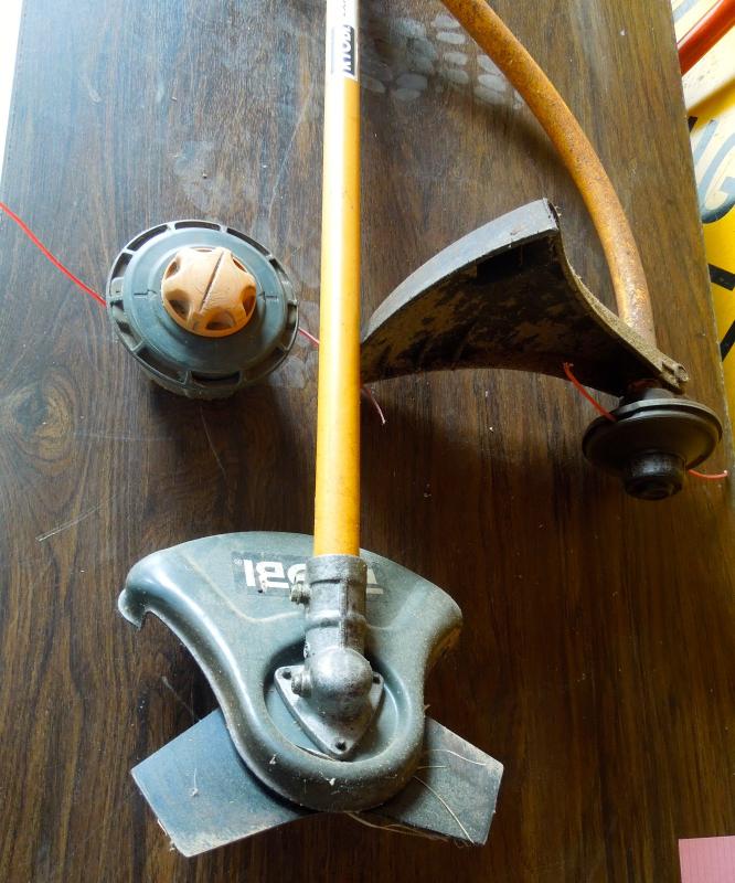 Two ryobi trimming tools (attachments only). Curved shaft and straight. These need cleaning. Includes a spool with some trimming line on it.
