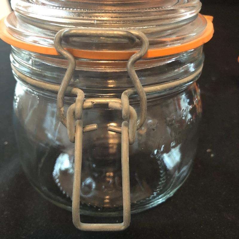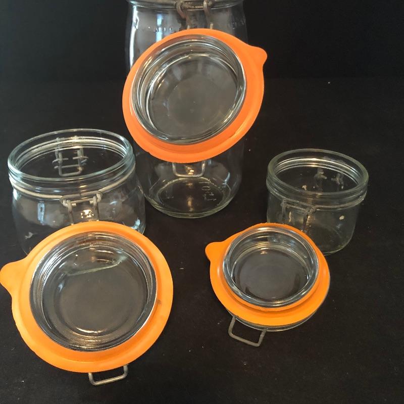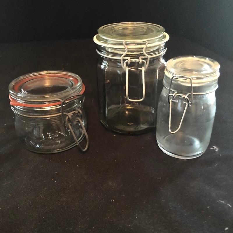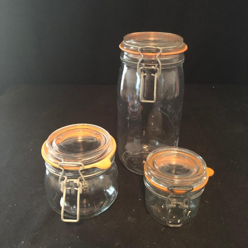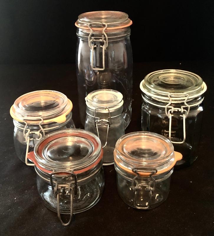 From 3” to 9” jars, this assortment will add nicely to your pantry needs. Three of the jars are Le Parfait, the rest unmarked. All appear to be in good shape and have spring loaded hinges.
