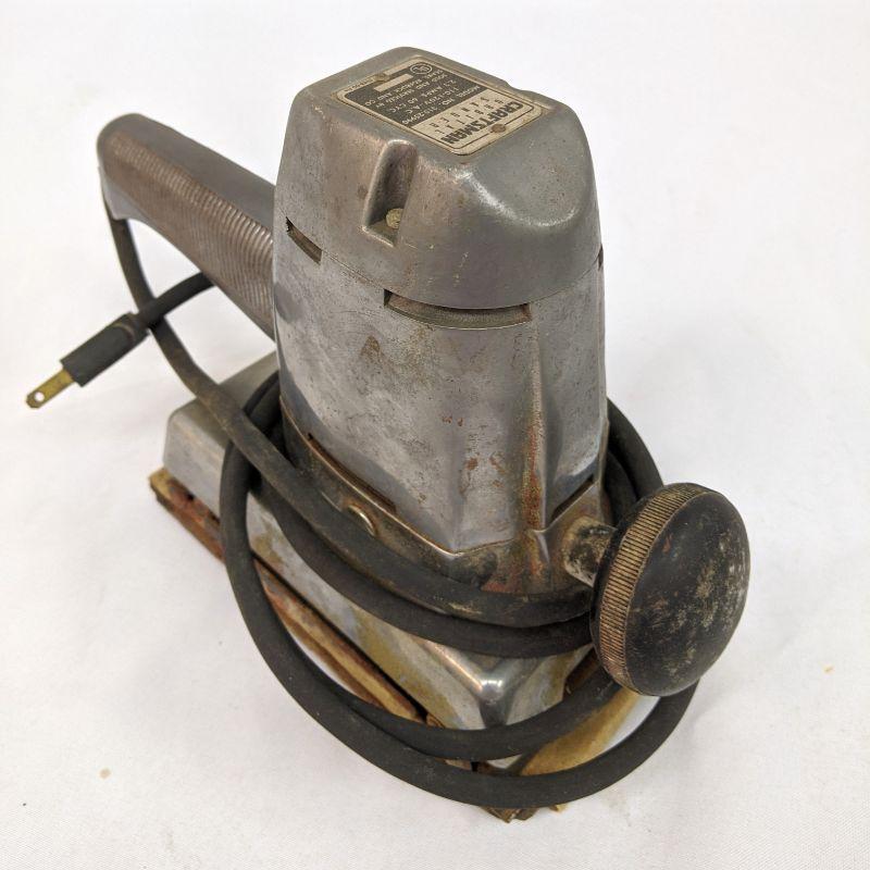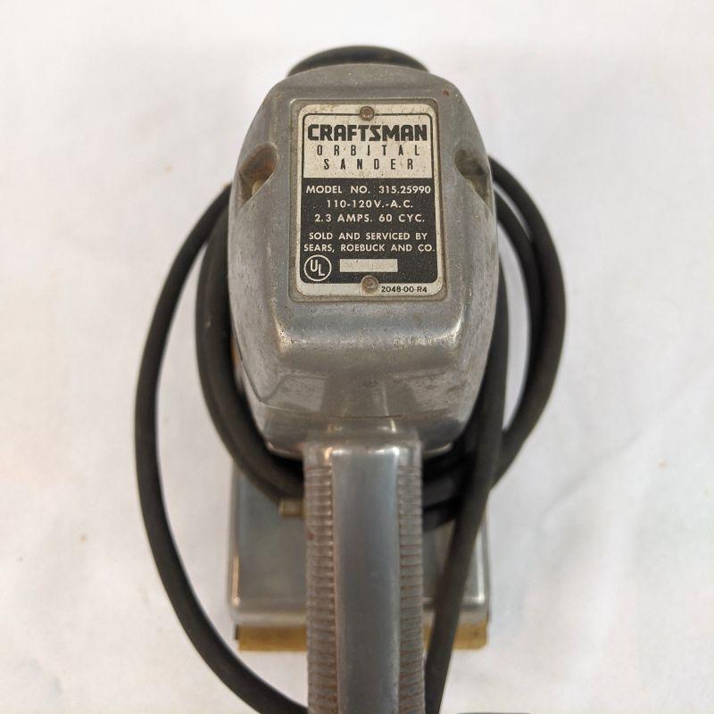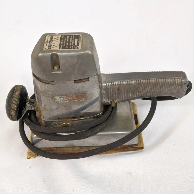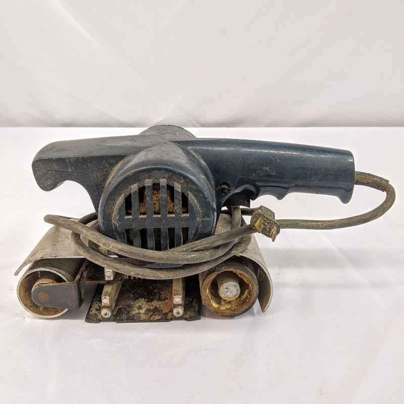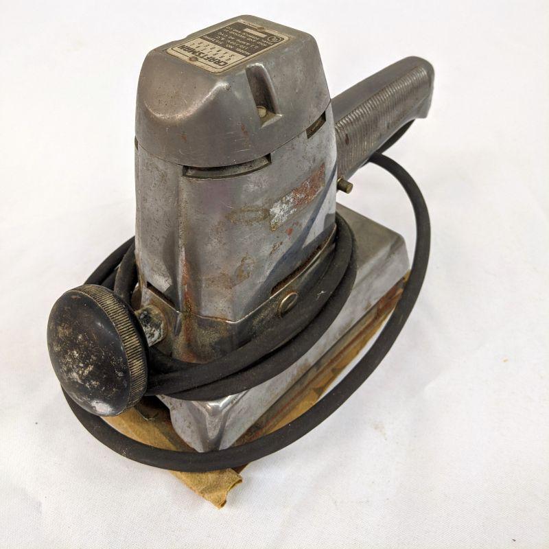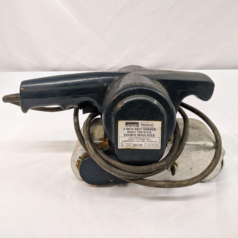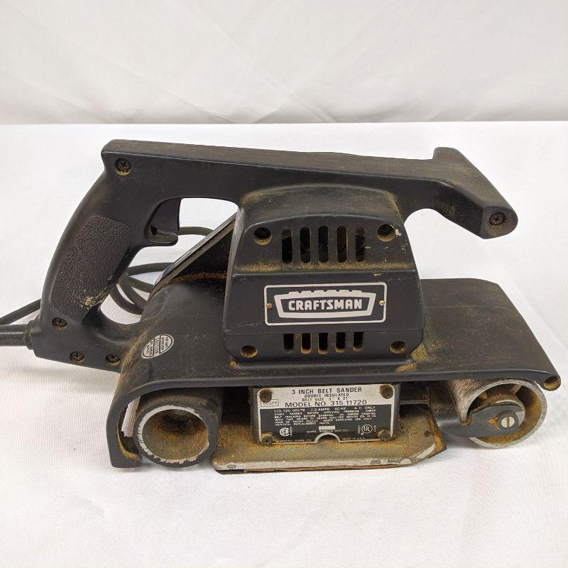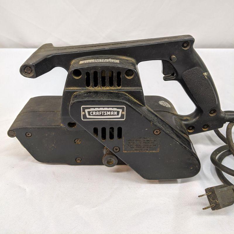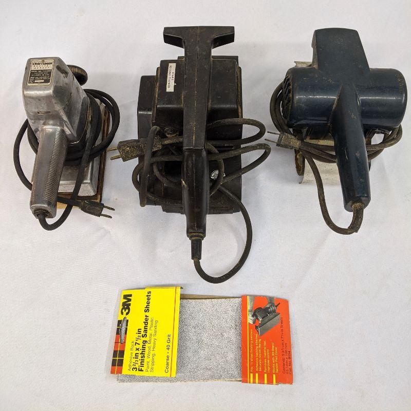 This lot includes two handheld belt sanders and one orbital sander, plus some sheets of 40 grit sandpaper. The orbital sander is made by Craftsman and is in good working order. The smaller, blue belt sander is made by PowrKraft Ward and worked when tested. The large black belt sander is made by Craftsman and does not appear to be working currently, but it could be an easy fix.
