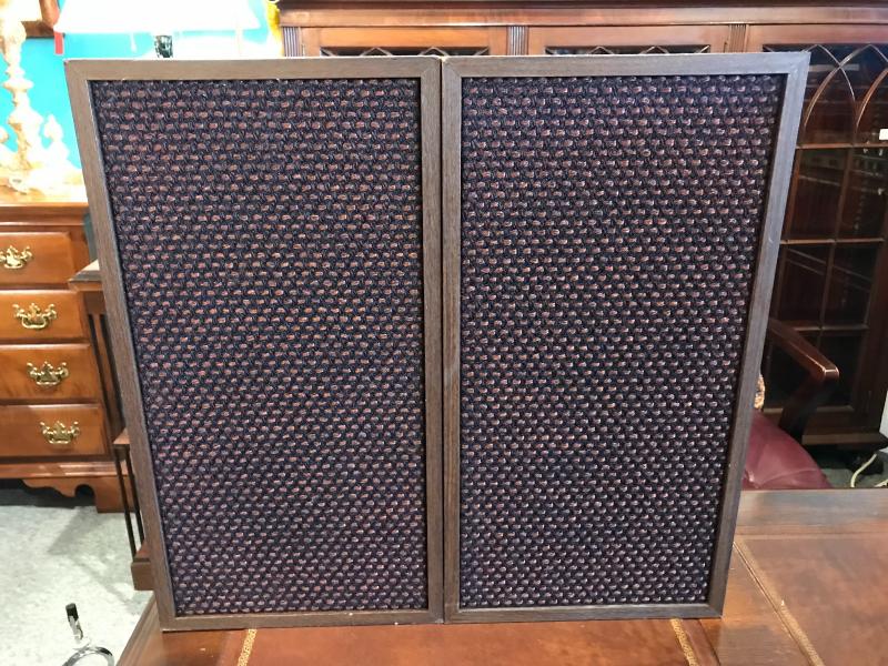 Nice vintage set of Heath speakers. Model 48-1042. Walnut case with brown and black dust covers.