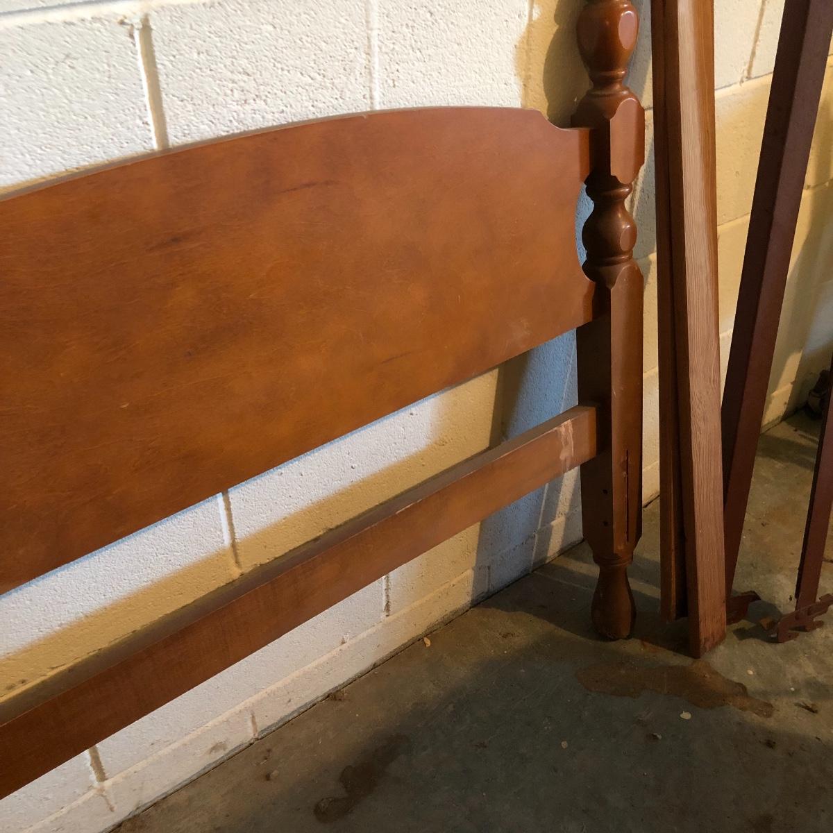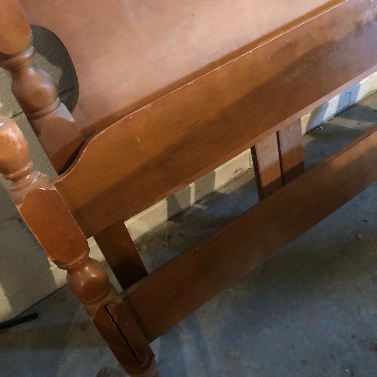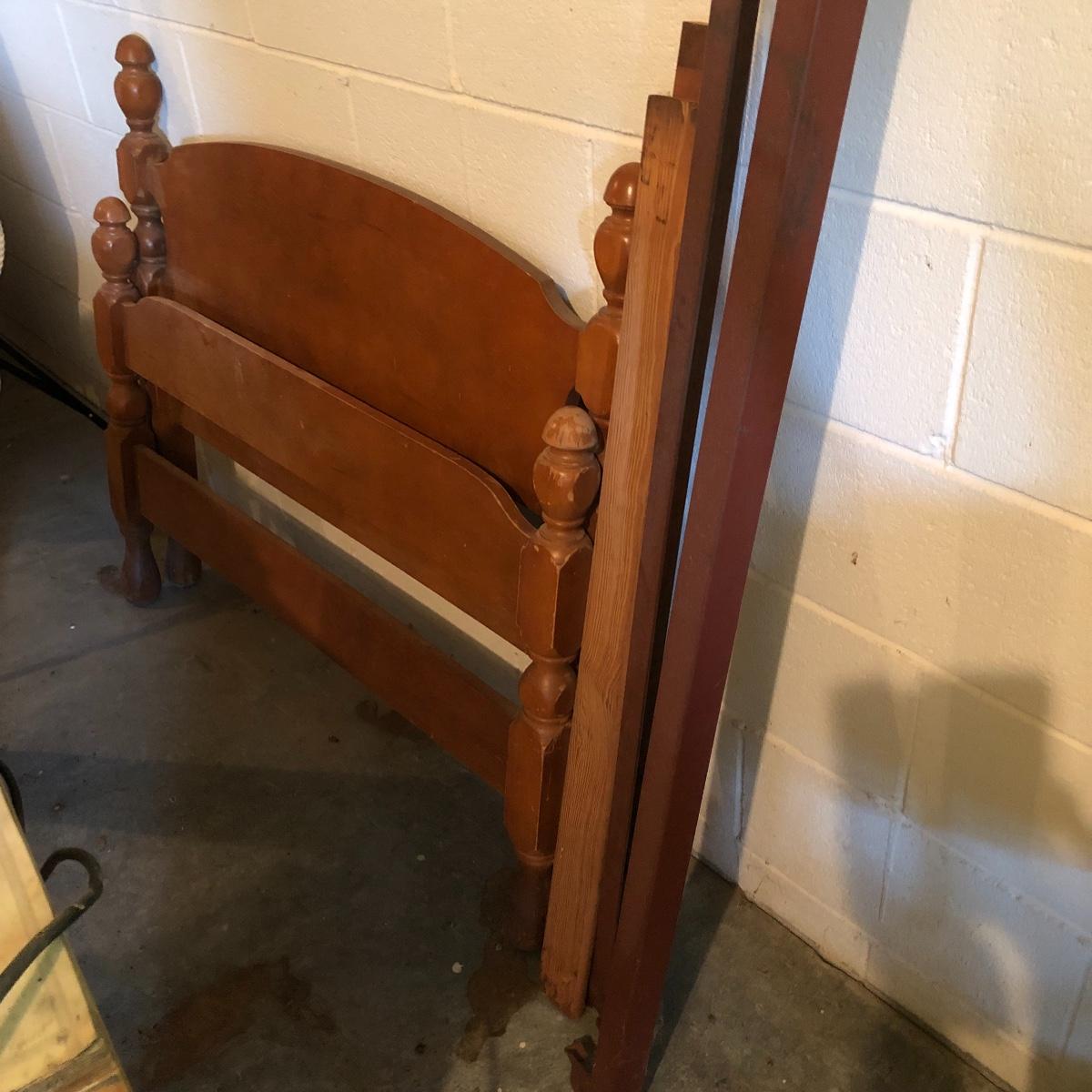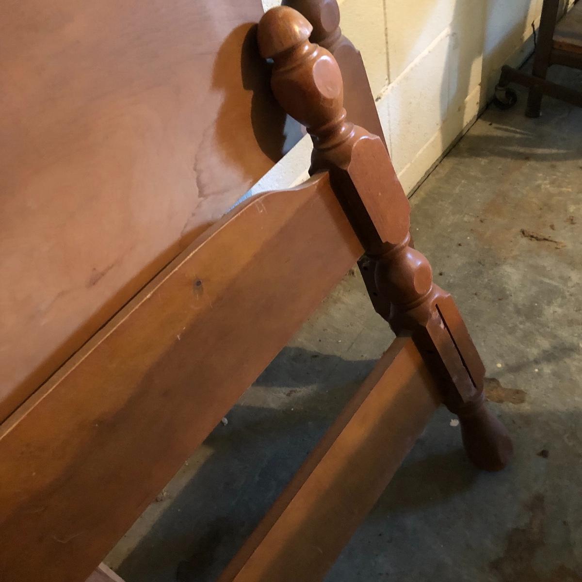 This lot contains two wooden pieces, a headboard and footboard, two wooden rails and two metal sides. The headboard and footboard measure approximately 41” x 2.5” x 36” (headboard) 27” (footboard). The metal rails are 78” long. Local pick up only.