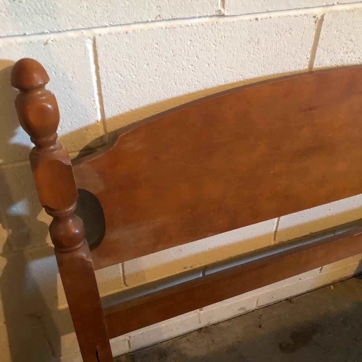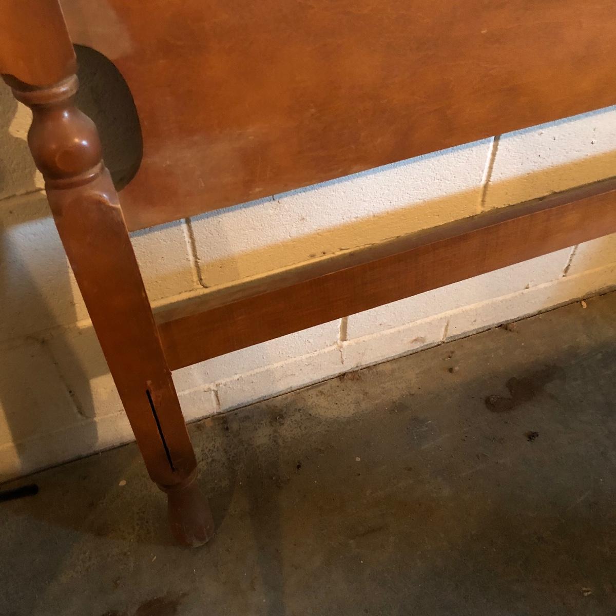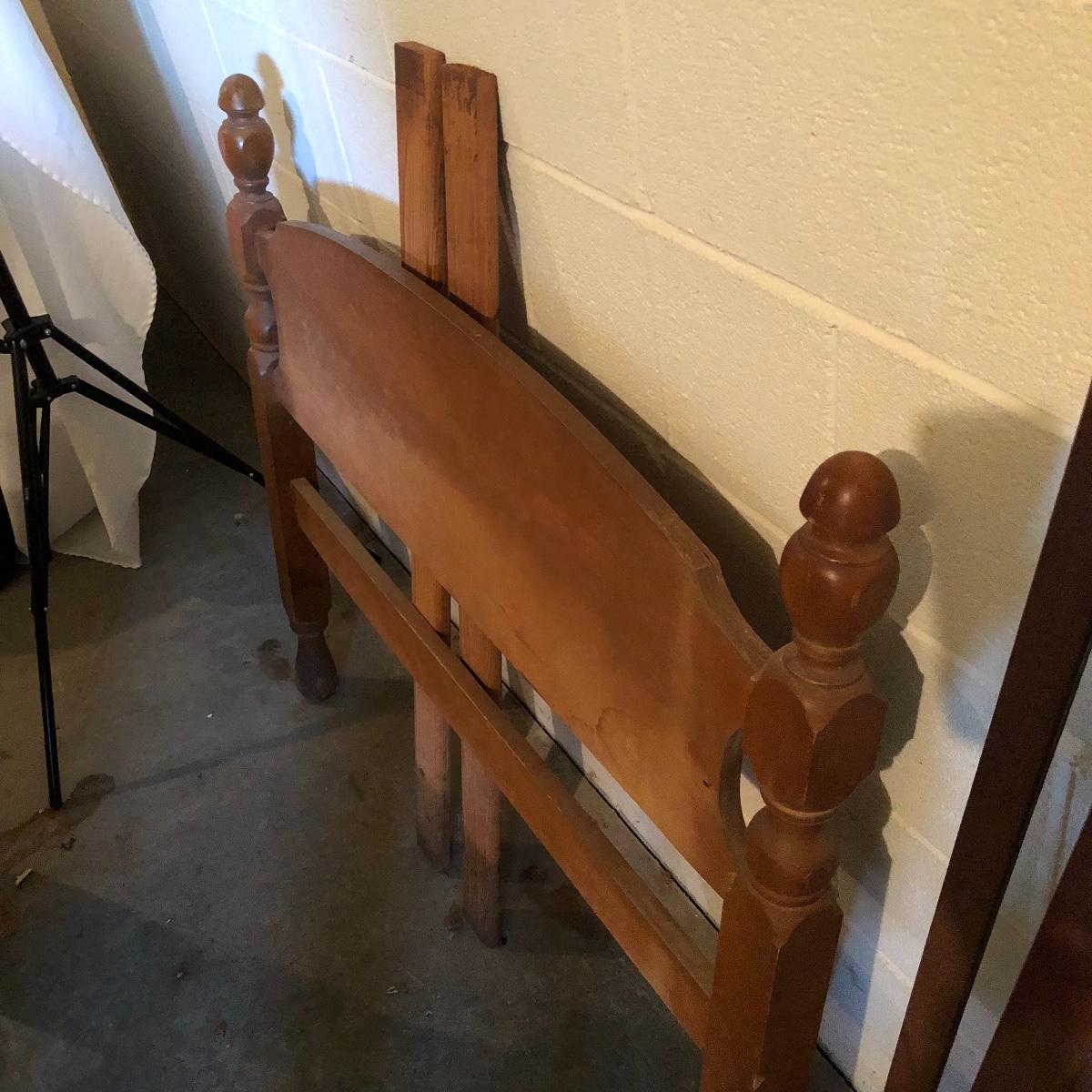 This lot contains two wooden pieces, a headboard and footboard, two wooden rails and two metal sides. The headboard and footboard measure approximately 41” x 2.5” x 36” (headboard) 27” (footboard). The metal rails are 78” long. Local pick up only.