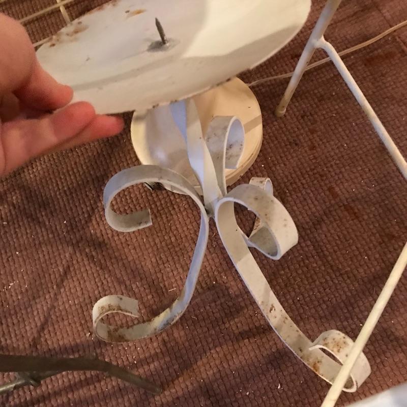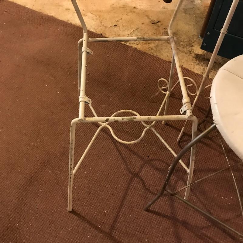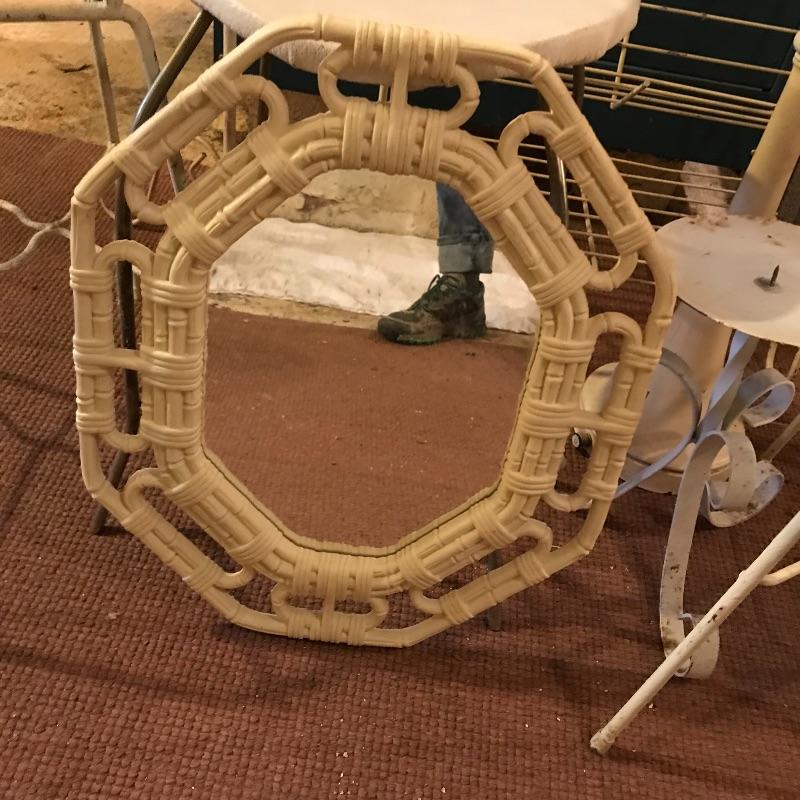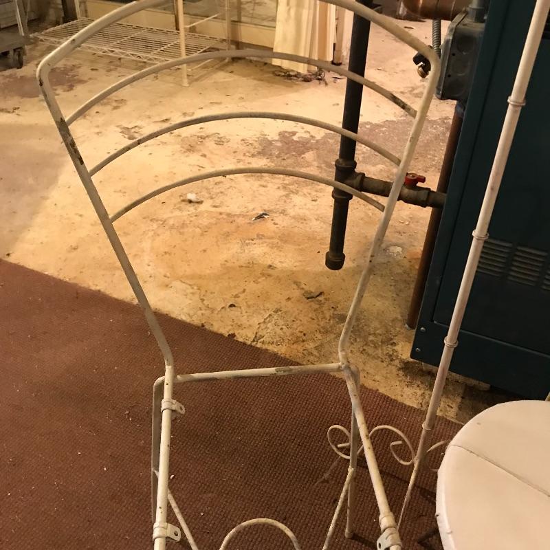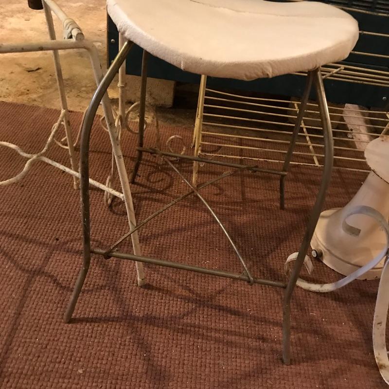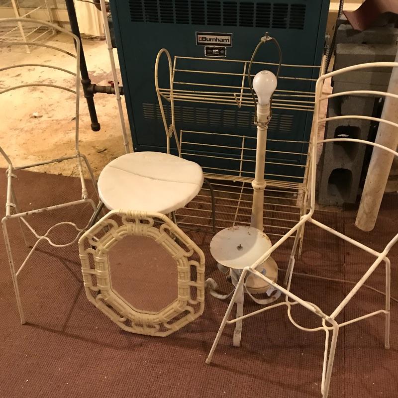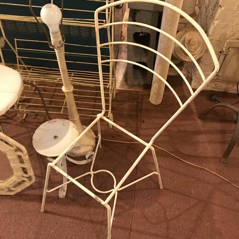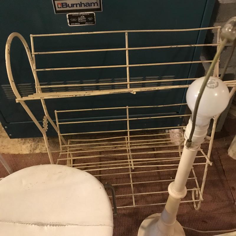 Lot contains eight white vintage pieces including mod lamp, a pair of dressing room chairs (that need seat cushions), a book rack, a mirror, two candle holders and a dressing table stool. Lamp is approx. 33” tall. Local pickup only.