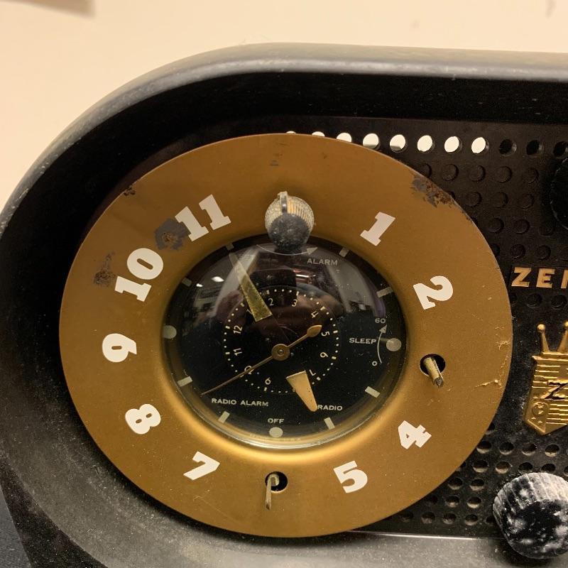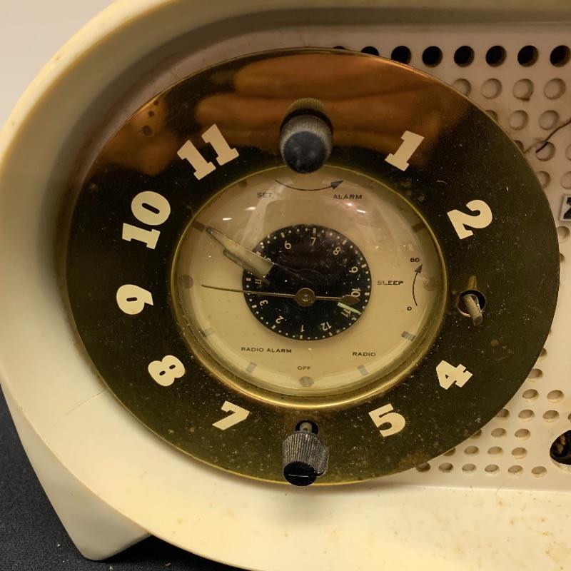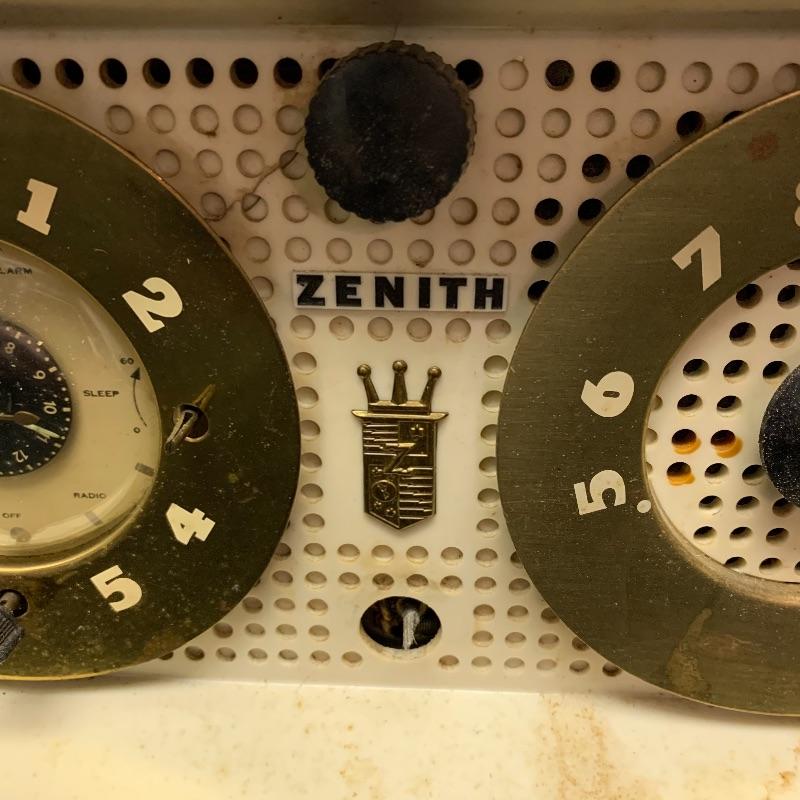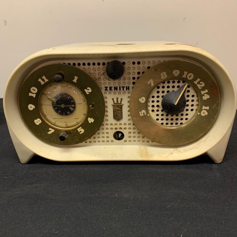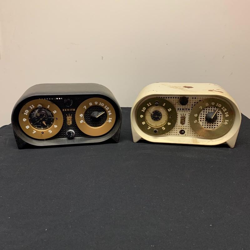 Two Zenith oval clock radios with tubes. One white and one black. Both appear to be the same model. Clocks turned on when tested. Number S-16776.