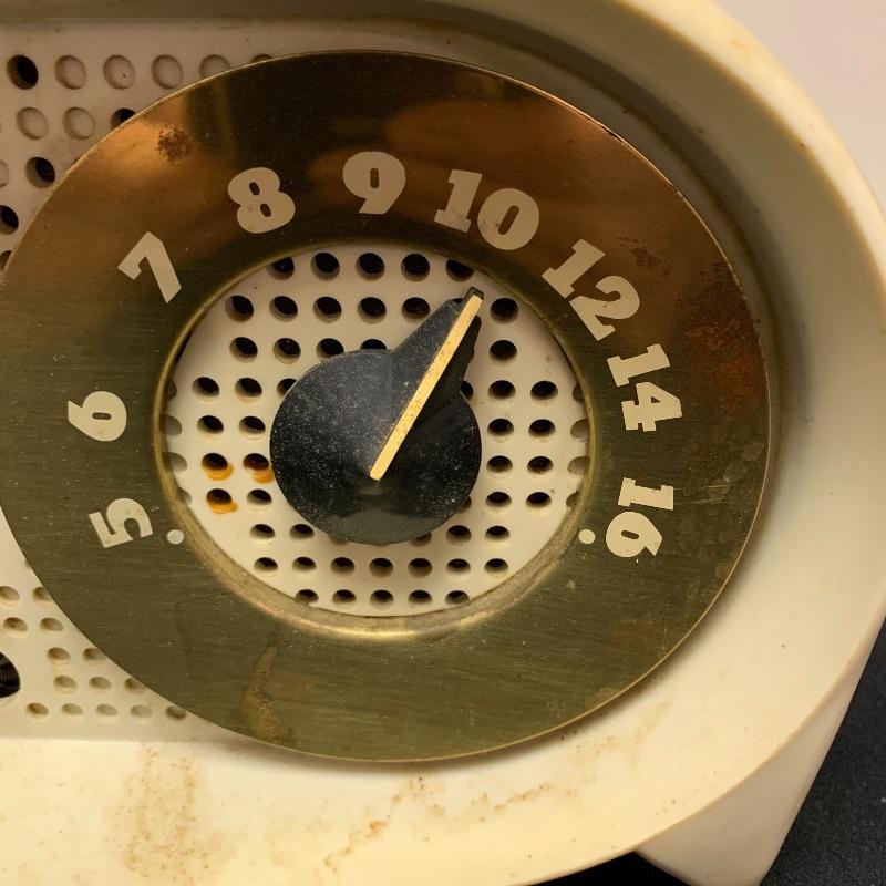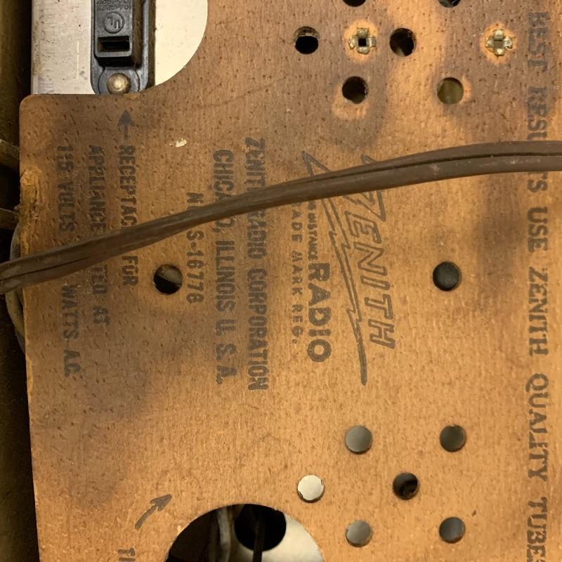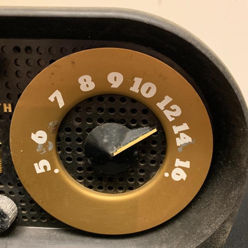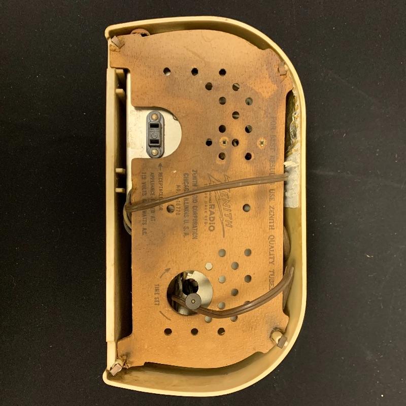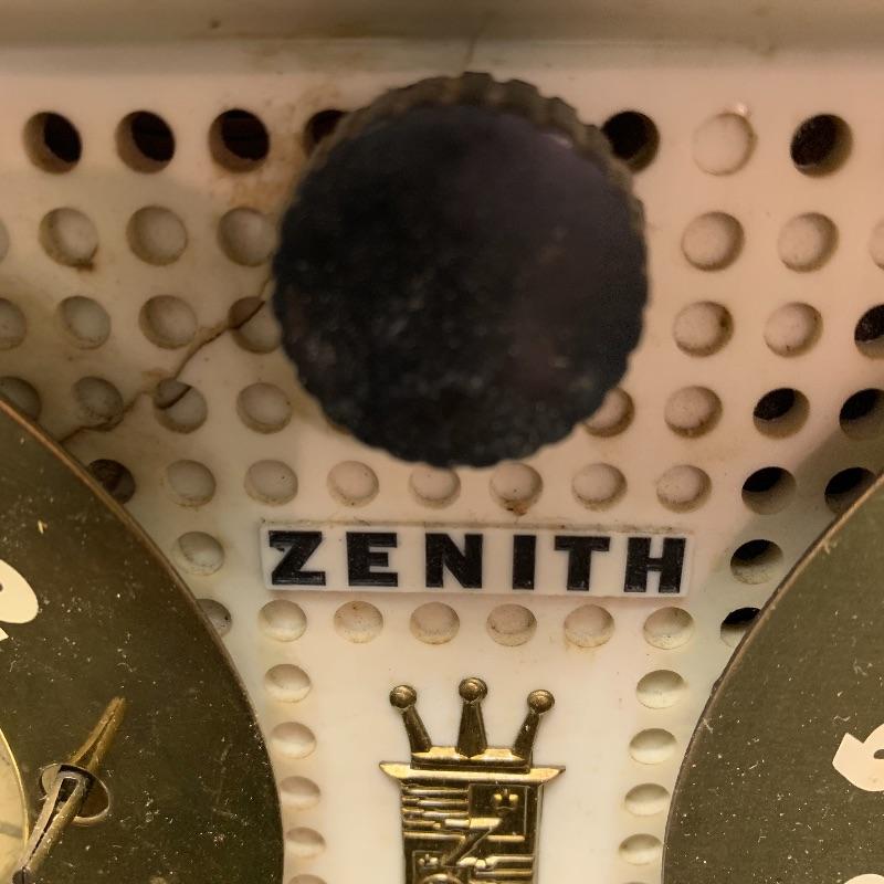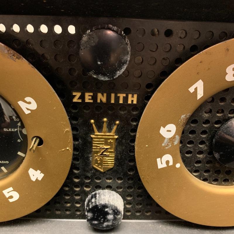 Two Zenith oval clock radios with tubes. One white and one black. Both appear to be the same model. Clocks turned on when tested. Number S-16776.