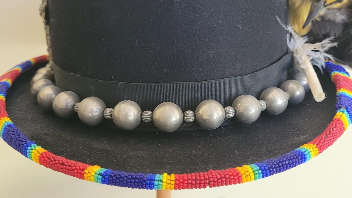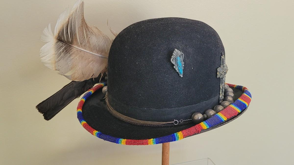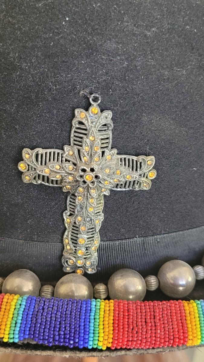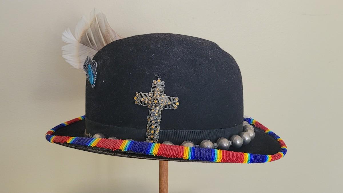 A silver beaded necklace is the band on this unique hat. It is also adorned with cross and and Turquoise pendant.