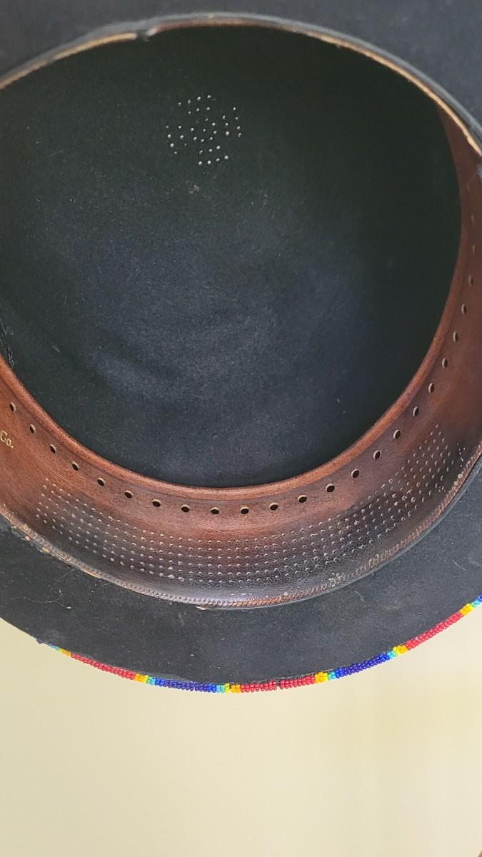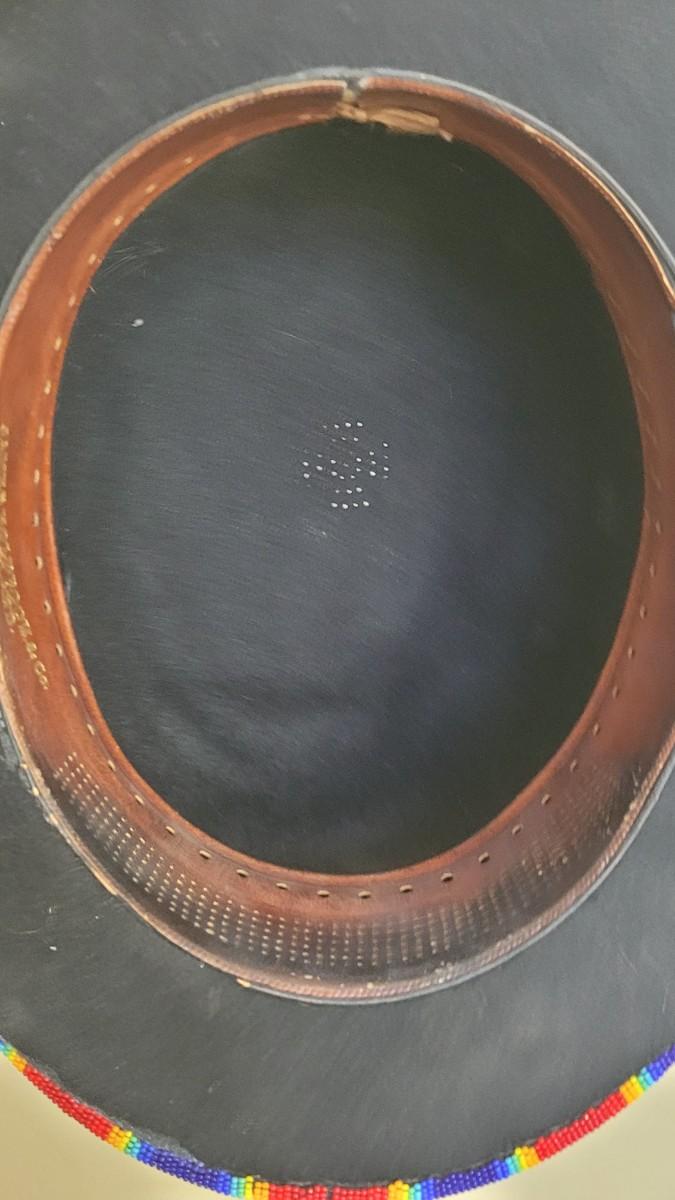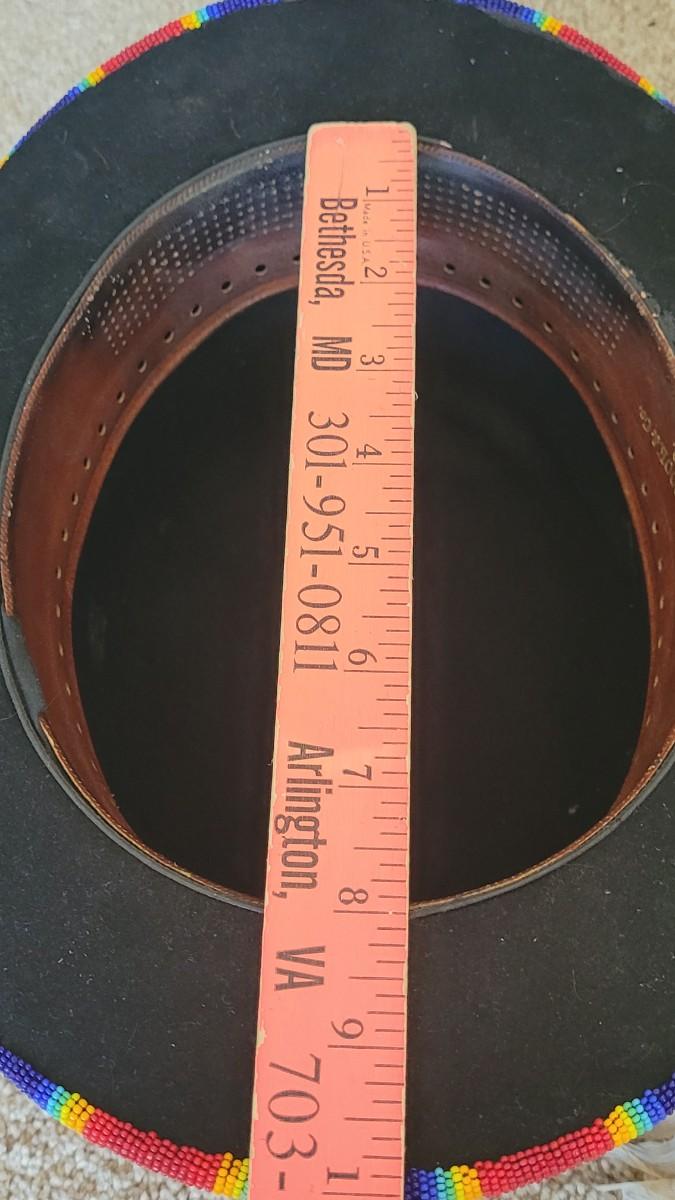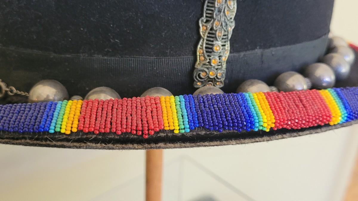 A silver beaded necklace is the band on this unique hat. It is also adorned with cross and and Turquoise pendant.