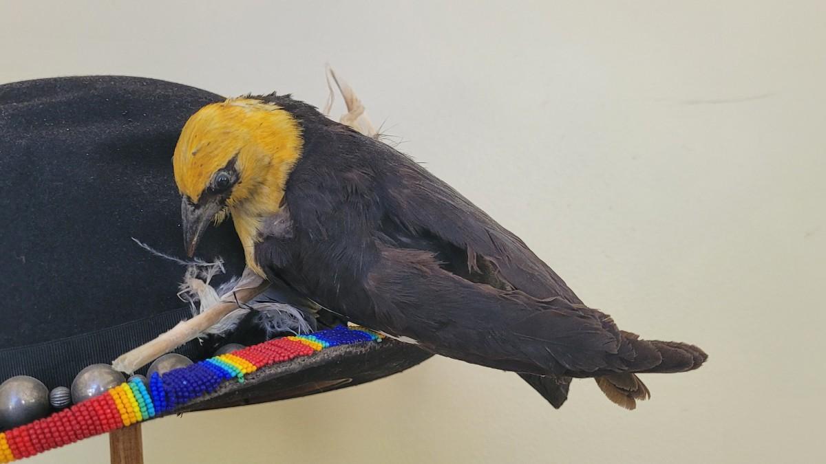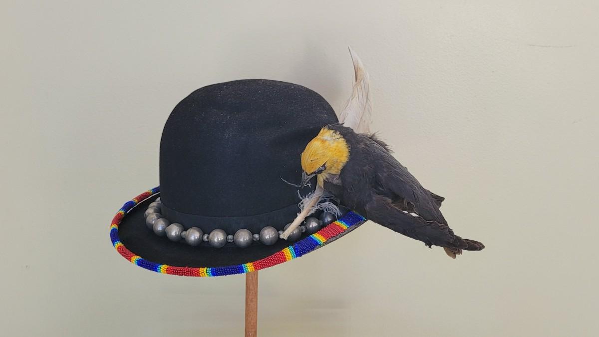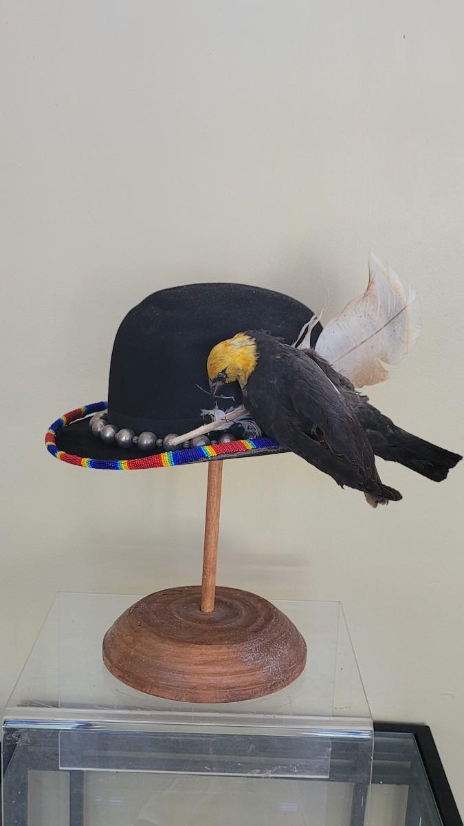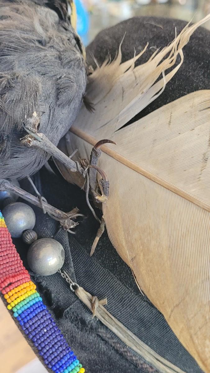 Lot 222: Antique Hat Embellished with a Beaded Rim, Large Feather and Taxidermy Bird