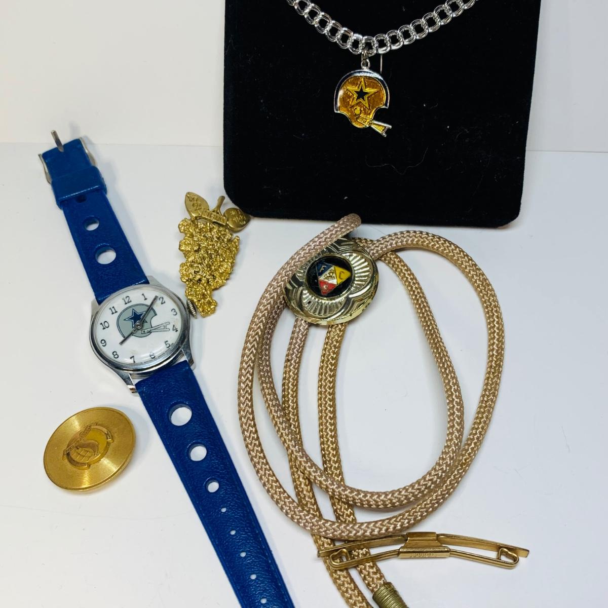Dallas Cowboys Watch and Necklace, Swank tie pin, Masonic rope necktie and gold tone pins.