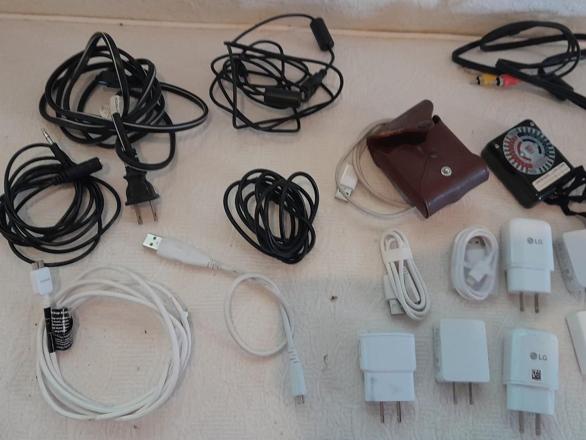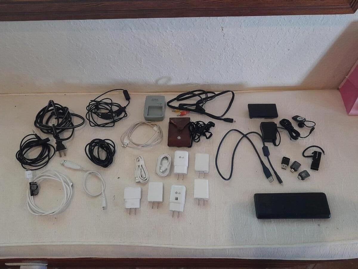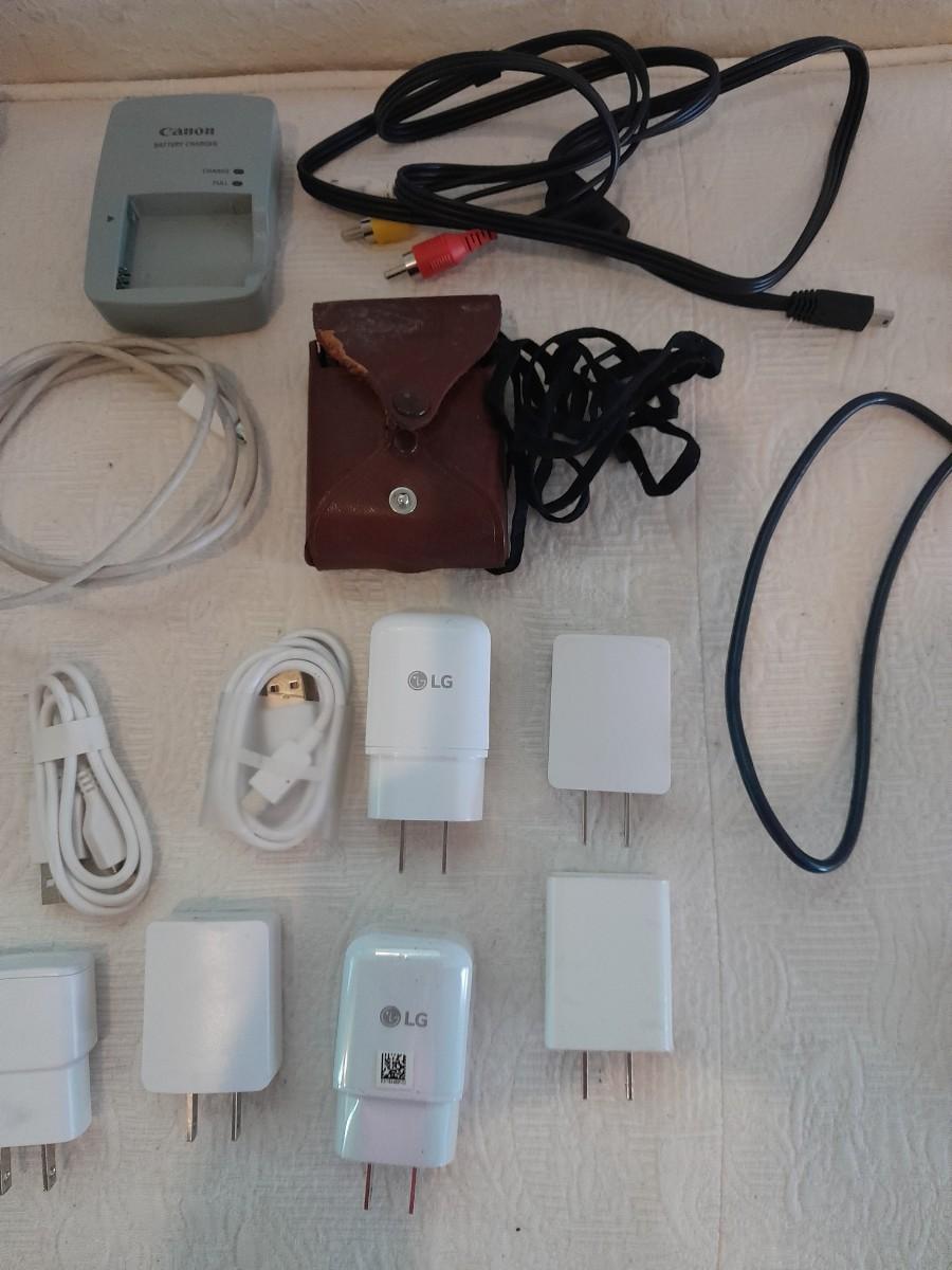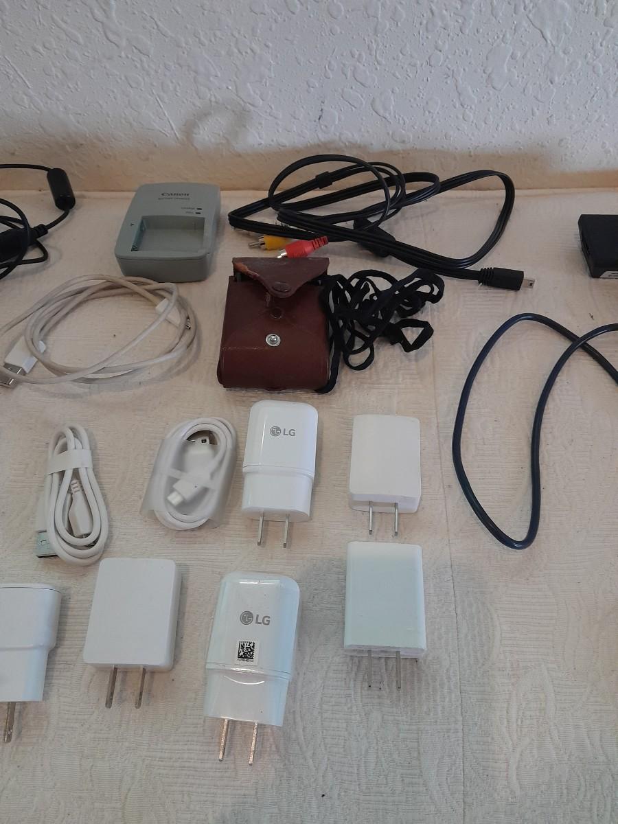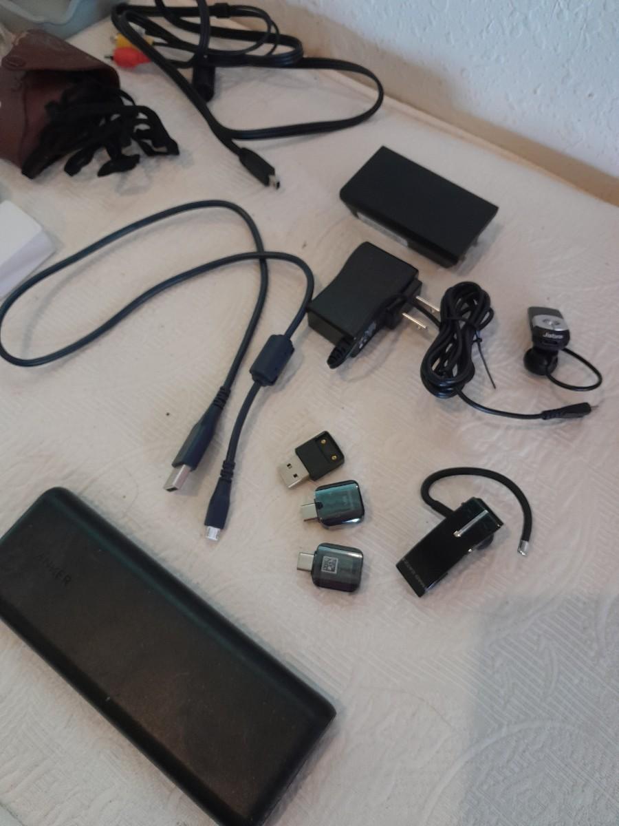 ASSORTMENT OF CHARGERS AND CAMERA ACCESSORIES AND A JABRA HEADSET