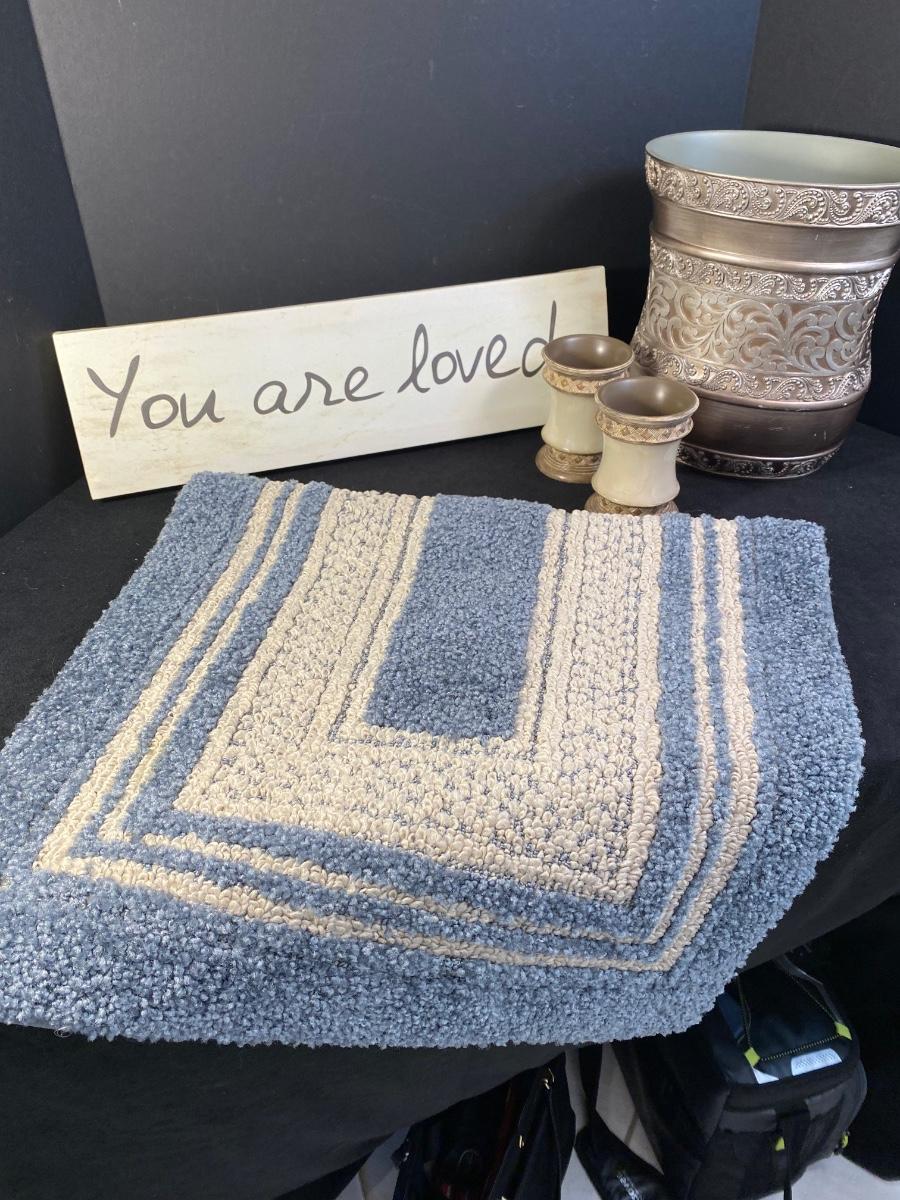 20" x 35" bath rug, resin wastebasket and two cups; wooden decorative sign