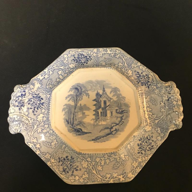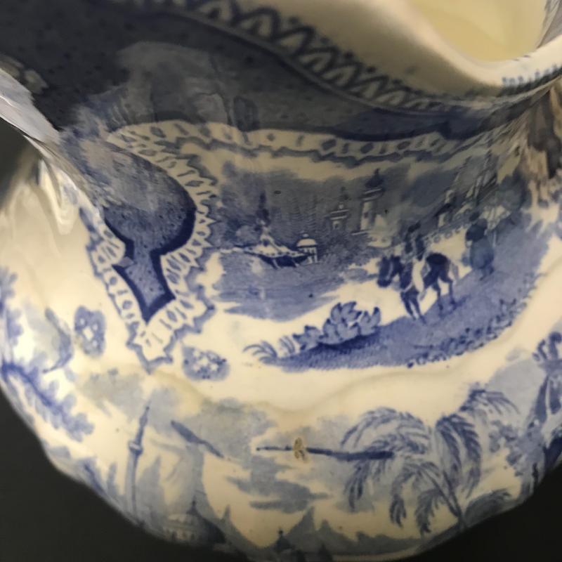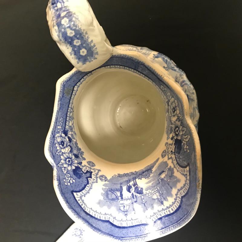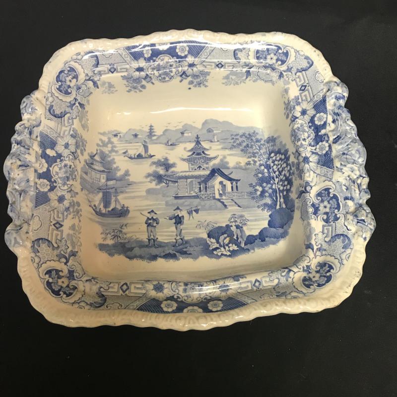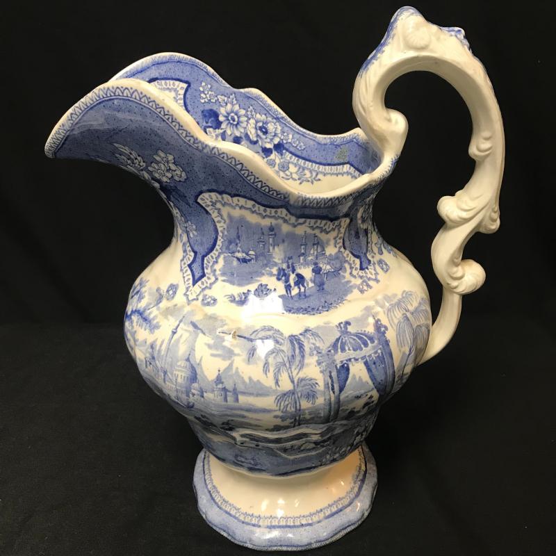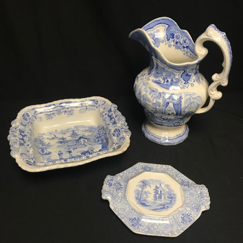 3 Pieces, the pitcher and square bowl are matching with the same marking on the bottom. A small chip on the bottom of the bowl. Pitcher stands 12” tall. Smaller stand or trivet piece has same coloring and British/Asian theme. Shipping available.