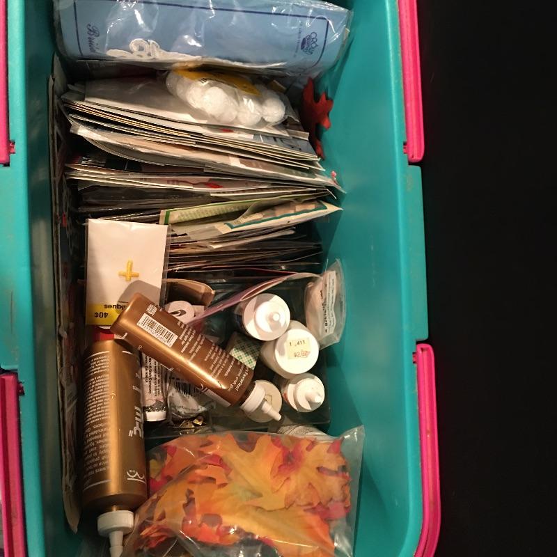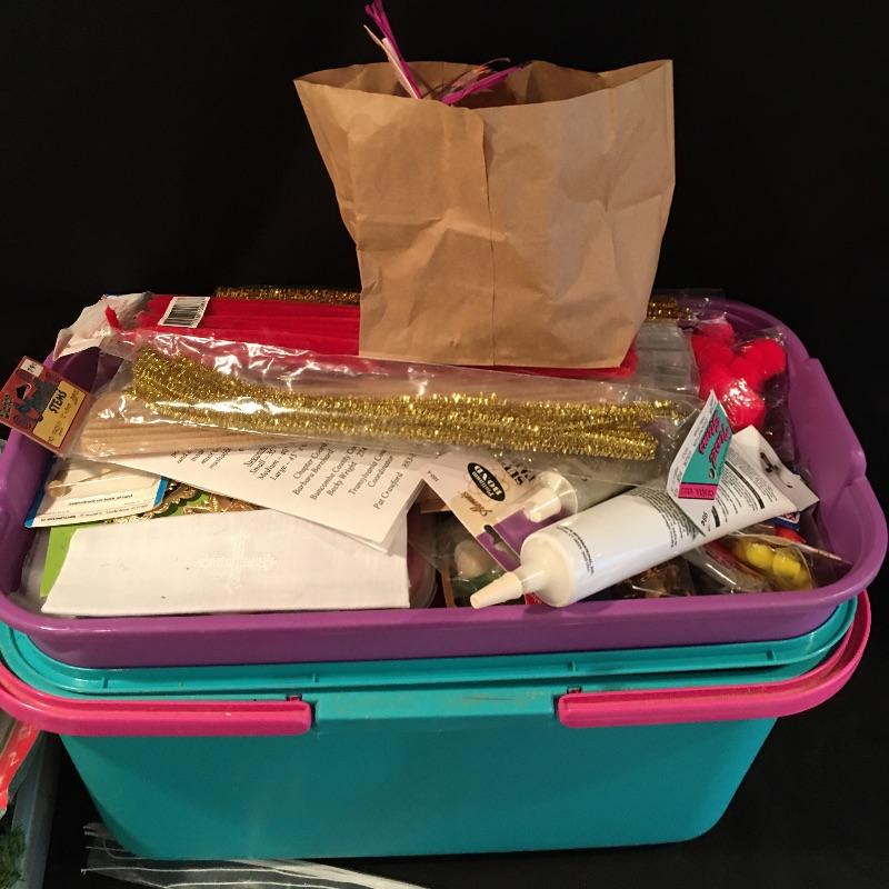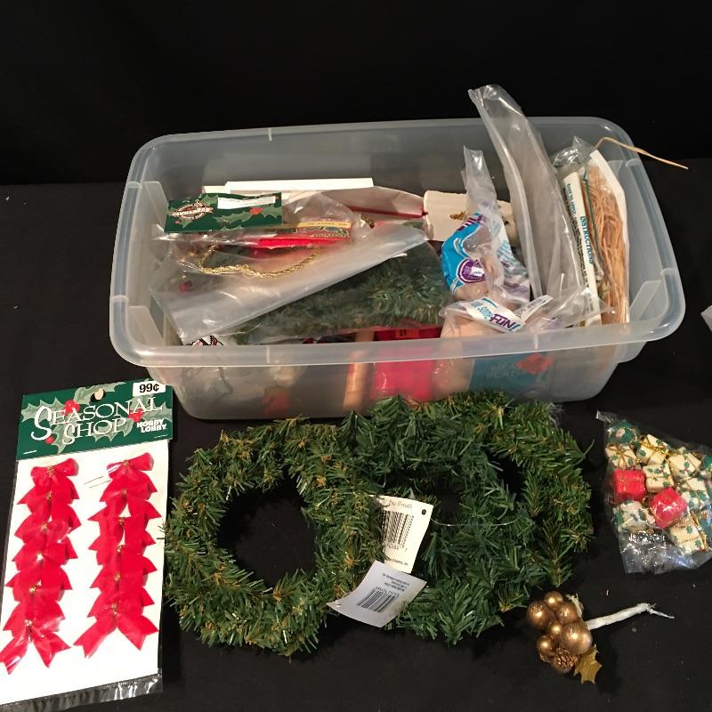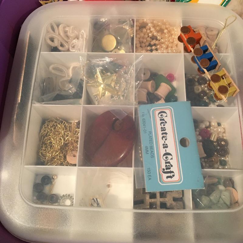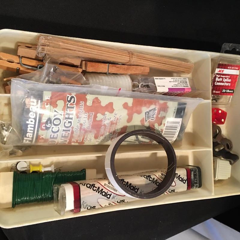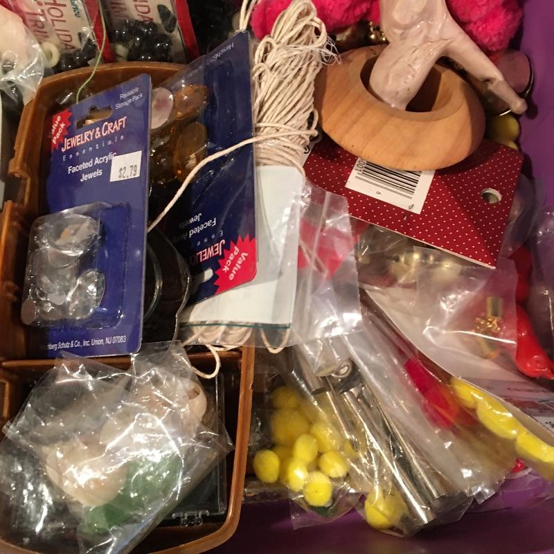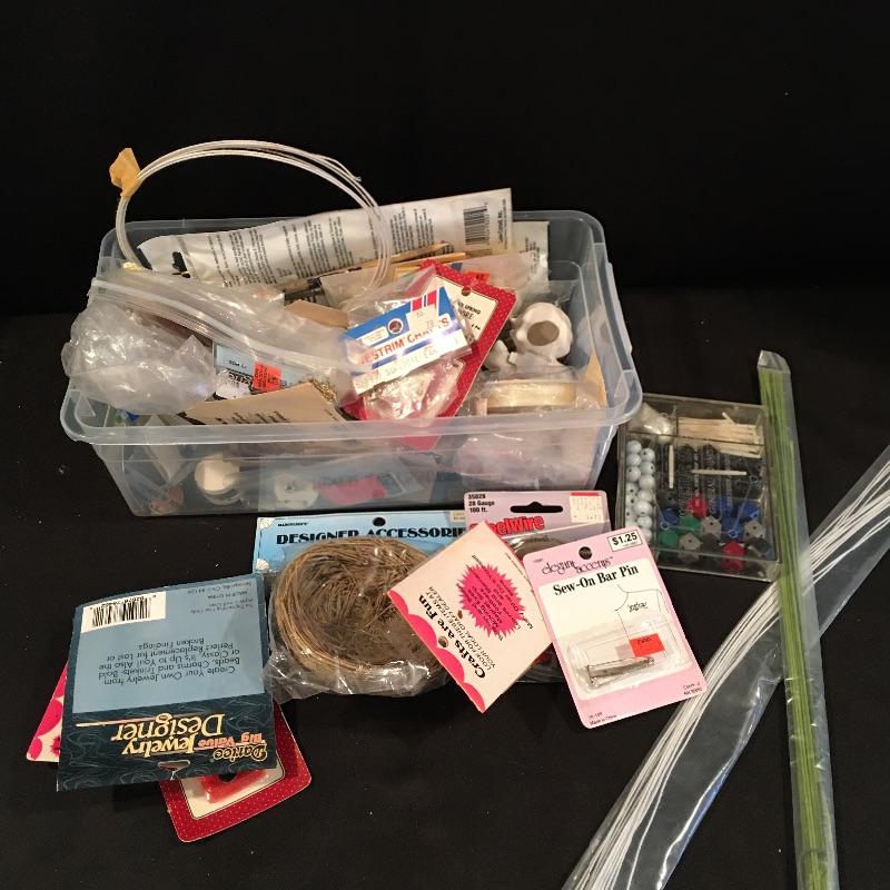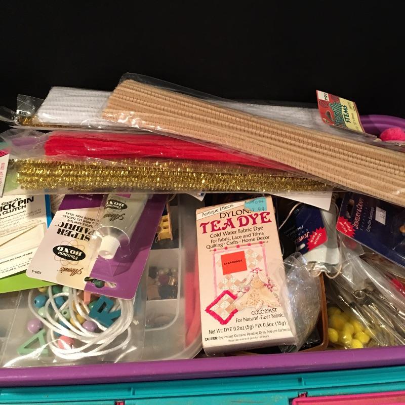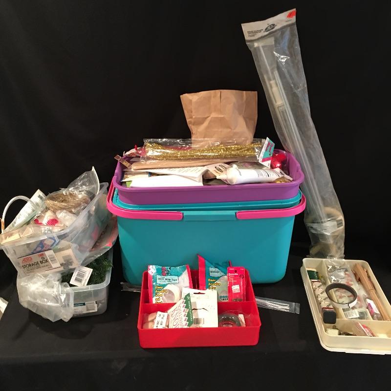 Crafting supplies includes umbrella frame, glue, pipe cleaners, flower arranging, beading and jewelry supplies, paint brushes, Christmas craft supplies, plastic box with lid and carrying handles and more.