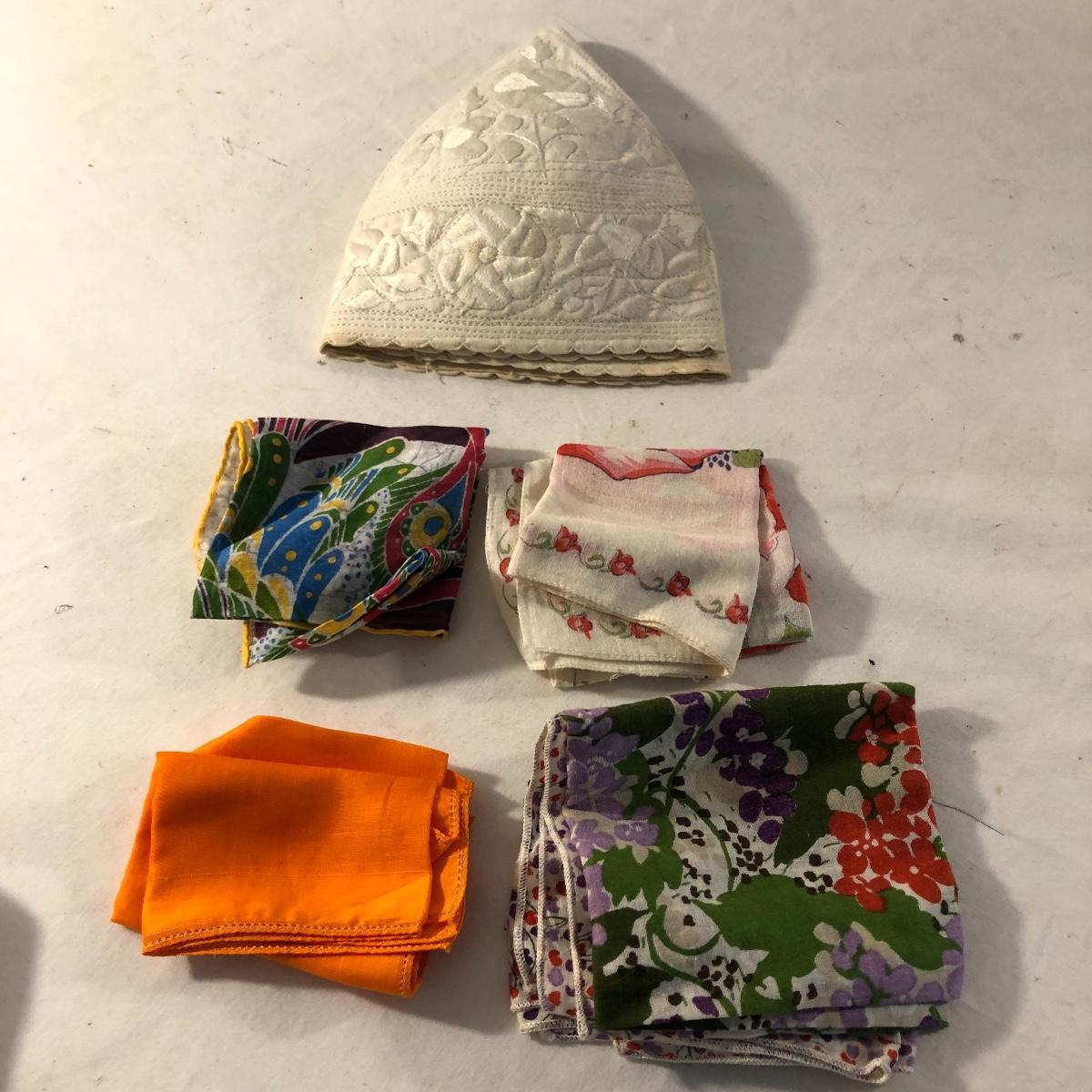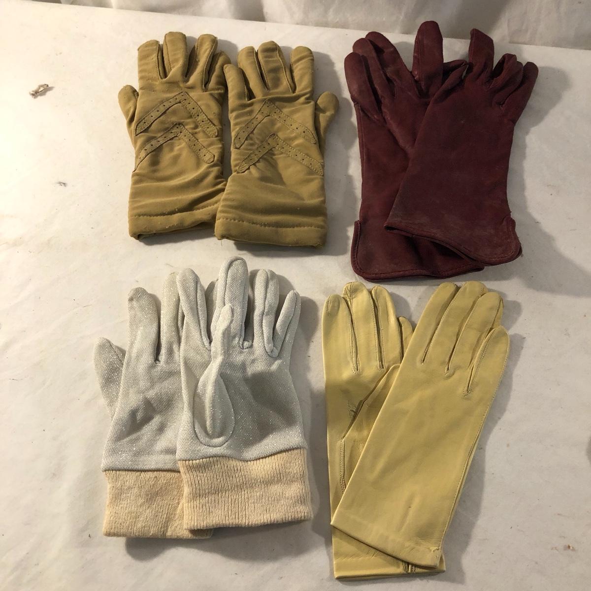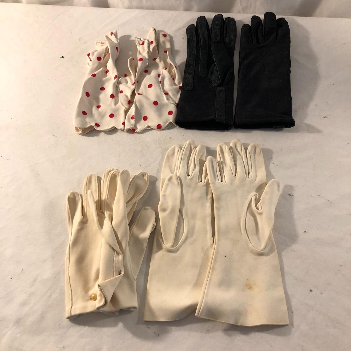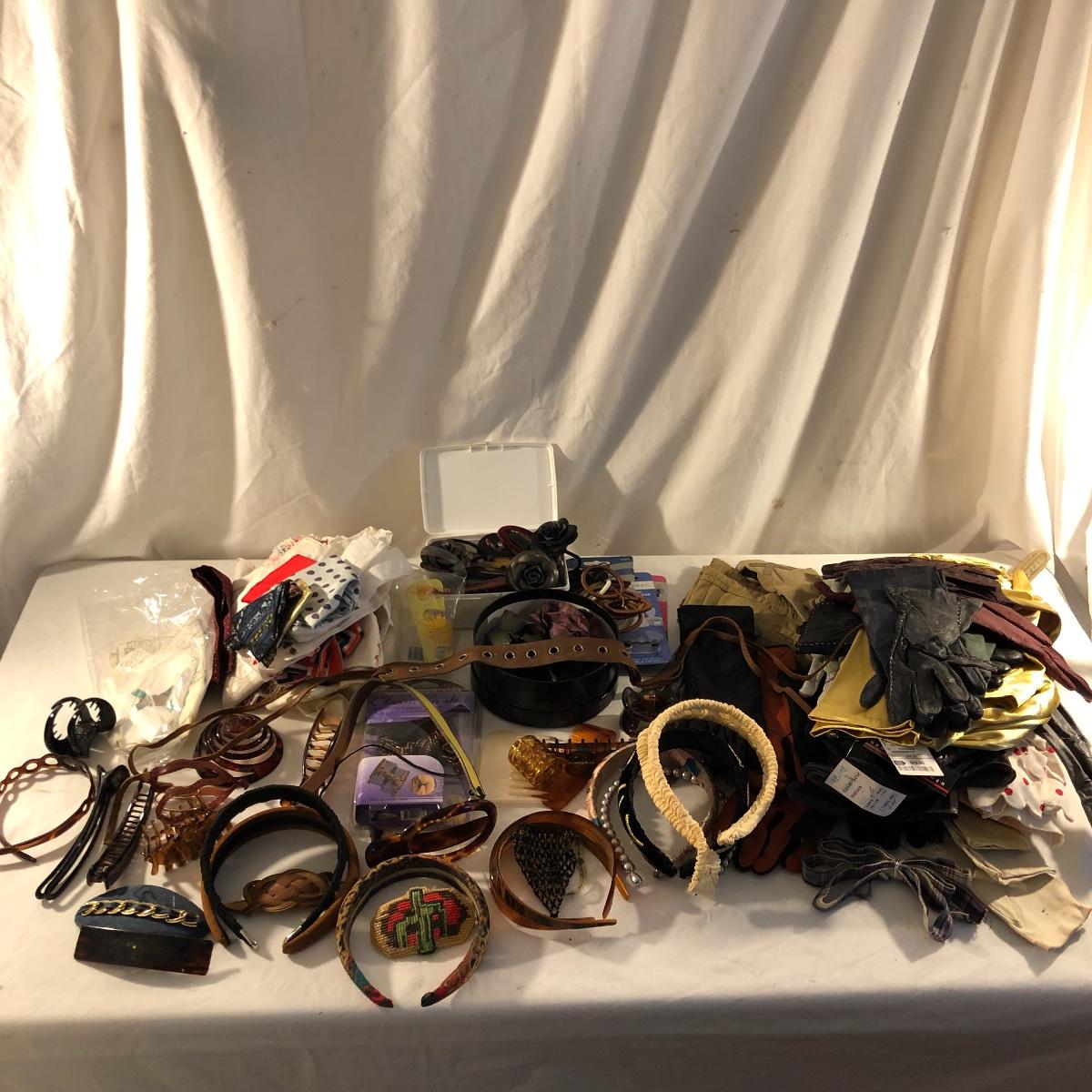 Lot includes a selection of size small gloves in a variety of materials that includes leather, cloth, suede and more. Also includes a assortment of hair accessories including bands, clips and ties in plastic, metal and cloth. Last but not least is a nice selection of handkerchiefs. Shipping Available.