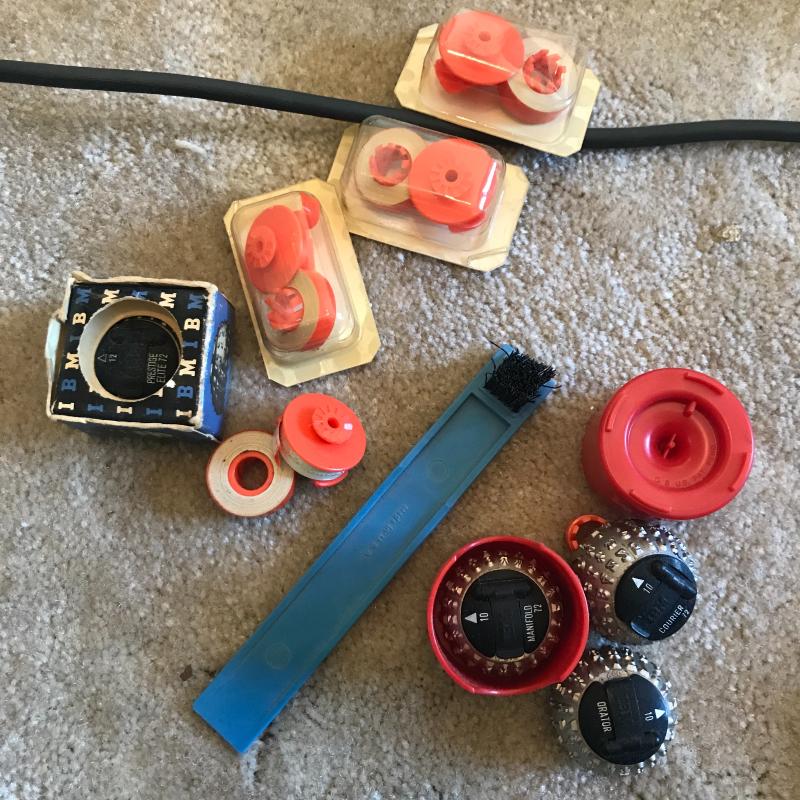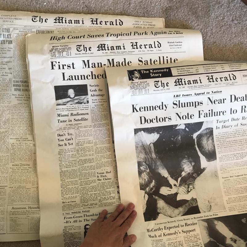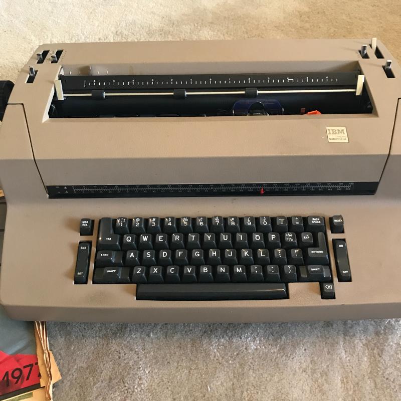 IBM Correcting Selectric II Electric Typewriter with cover and extra film cartridge and other parts. Needs work. Lot also includes a vintage Atlanta Journal newspaper from 1977 featuring Elvis Presley death as well as 12 double sided Miami Herald Newspaper Reprints from major headlines throughout the years. No shipping.