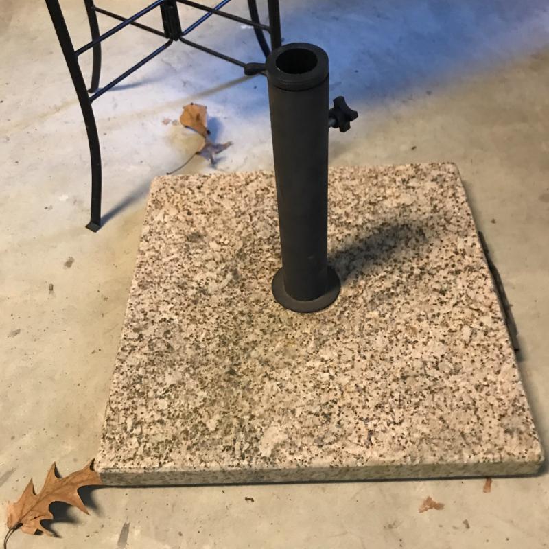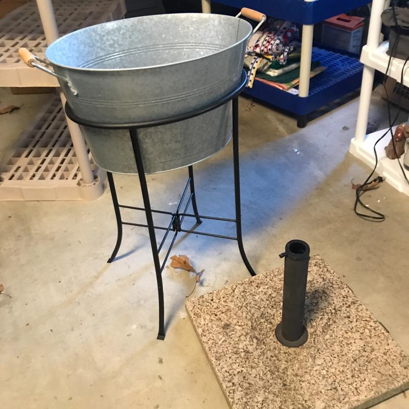 Galvanized ice bucket on metal stand for keeping drinks cold at your next party. This lot also includes a marble umbrella base. On wheels for easy moving. No shipping. Local pick up in Asheville, NC only.