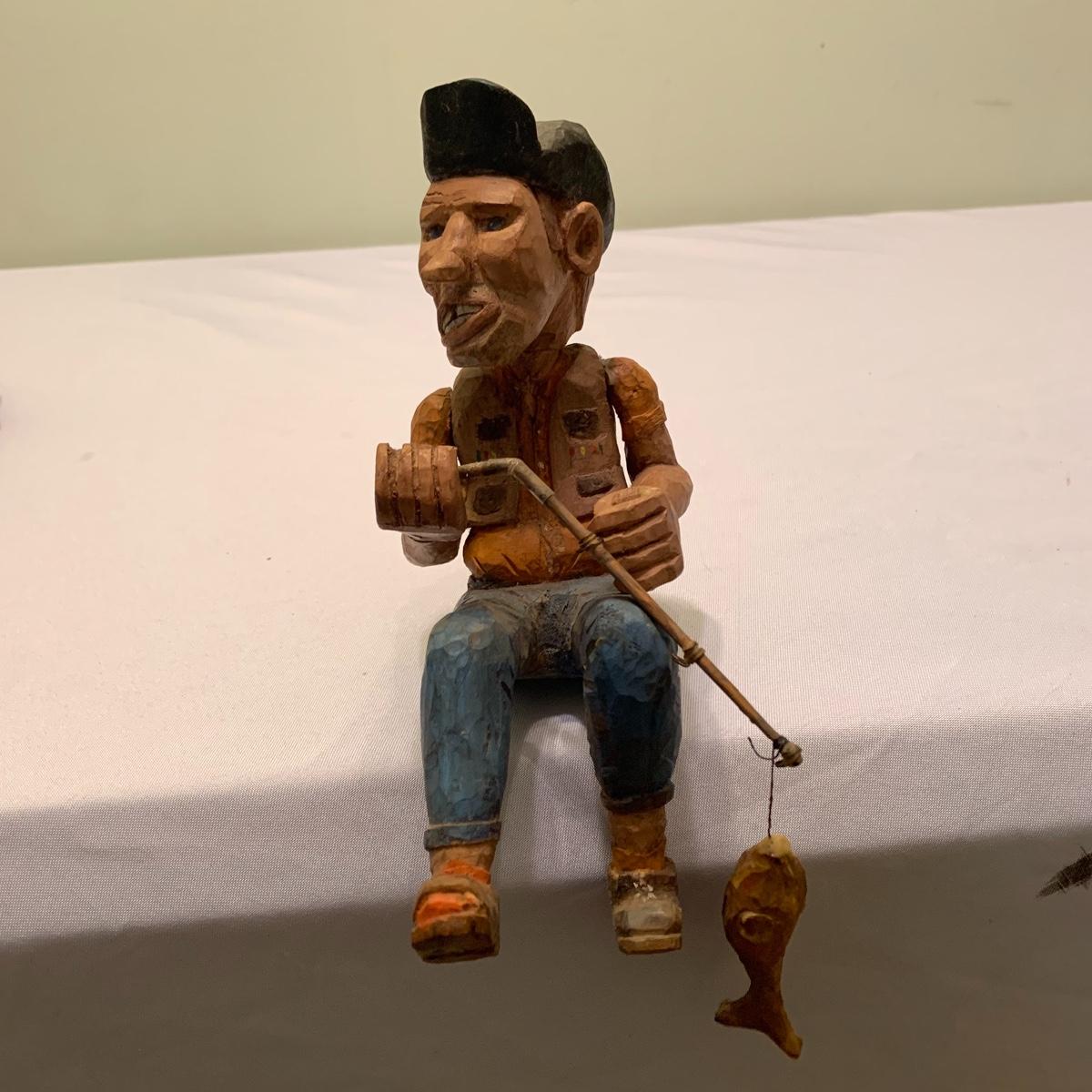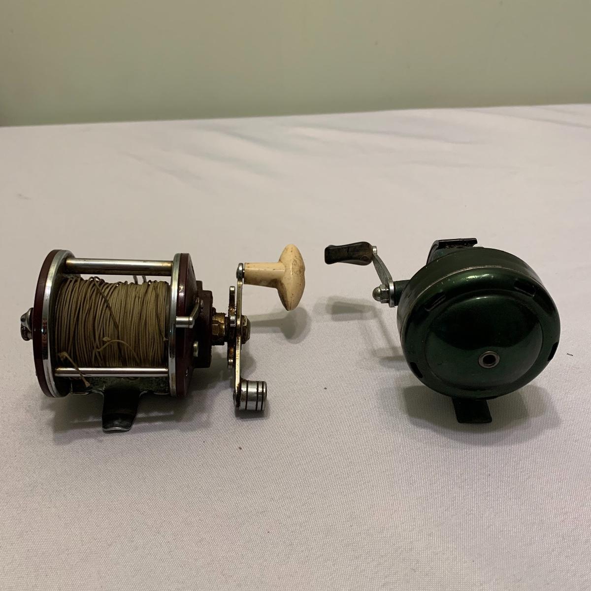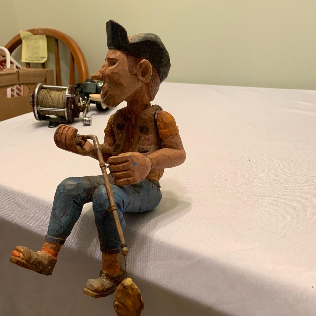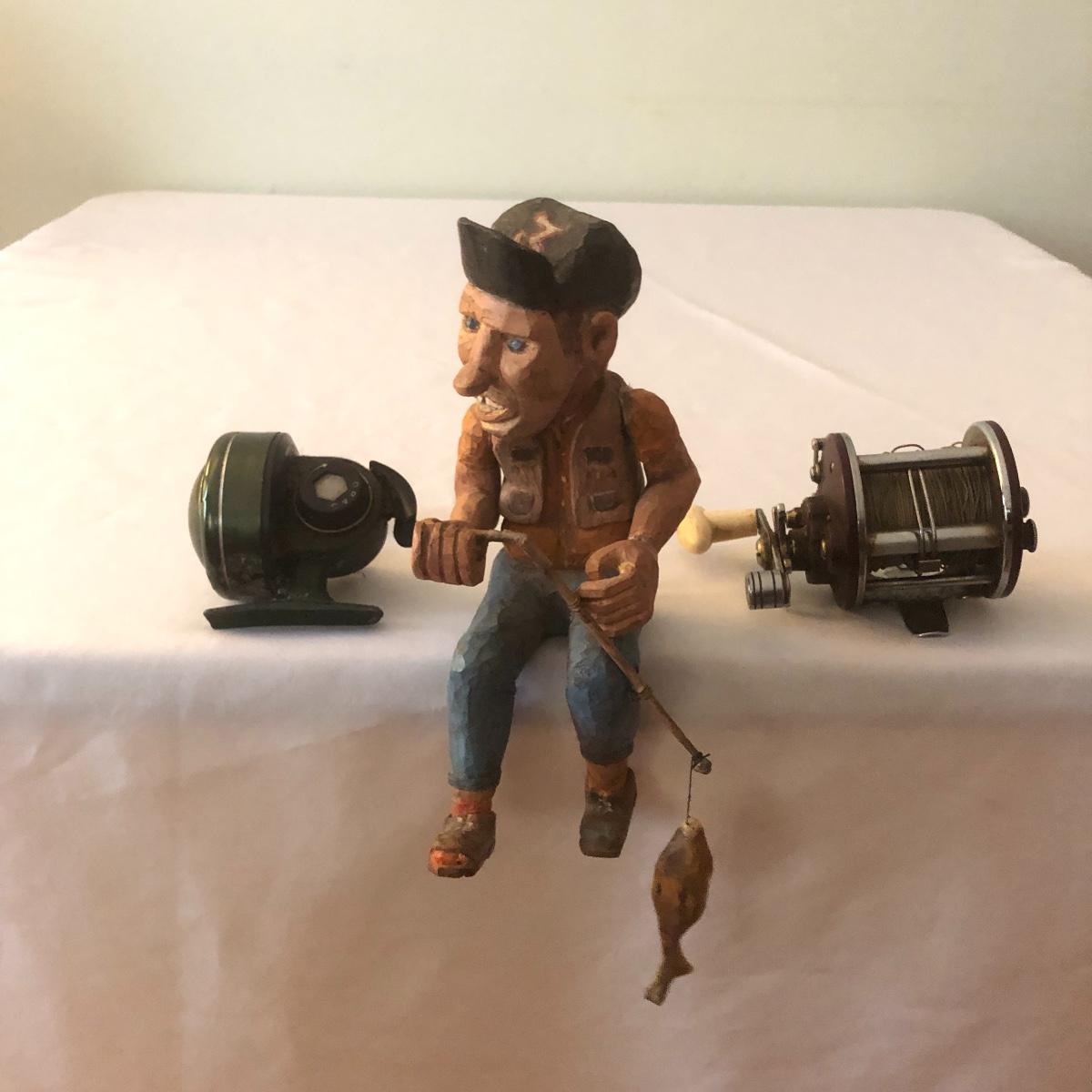 Get some fish on the line with these two fishing reels. Lot includes Johnson Centennial # 120 and Penn Peer # 109 bait casting reel. Also includes a wooden fisherman that has a broken pole.