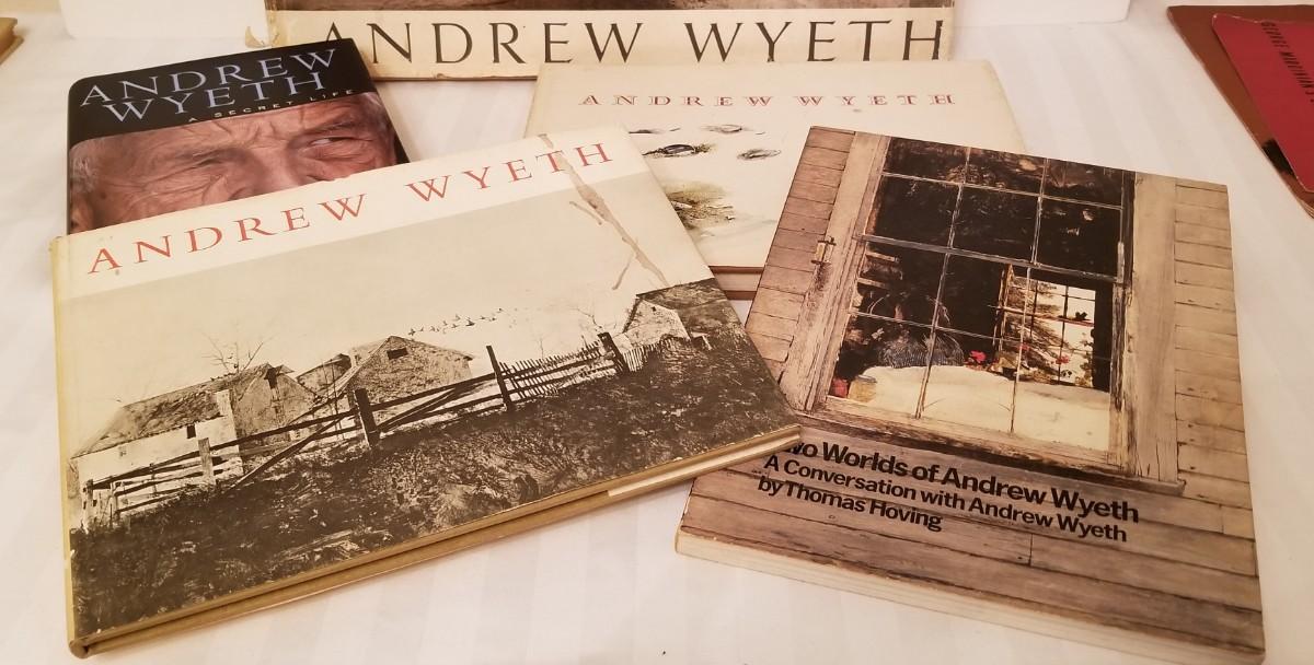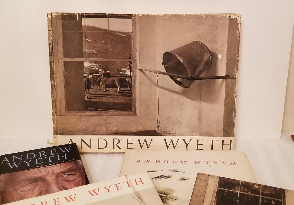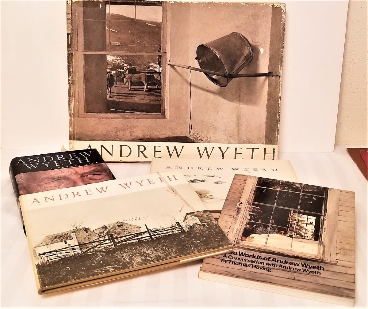 Lot of 5 Andrew Wyeth hardcovers. The tall one in the back is a coffee-table compilation of his works and is a first printing - sold for 50.00 when printed. All have been read and enjoyed - insides are clean and unmarked.