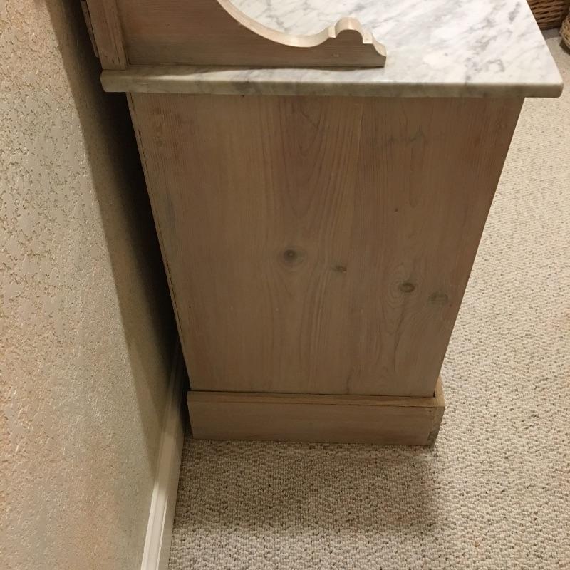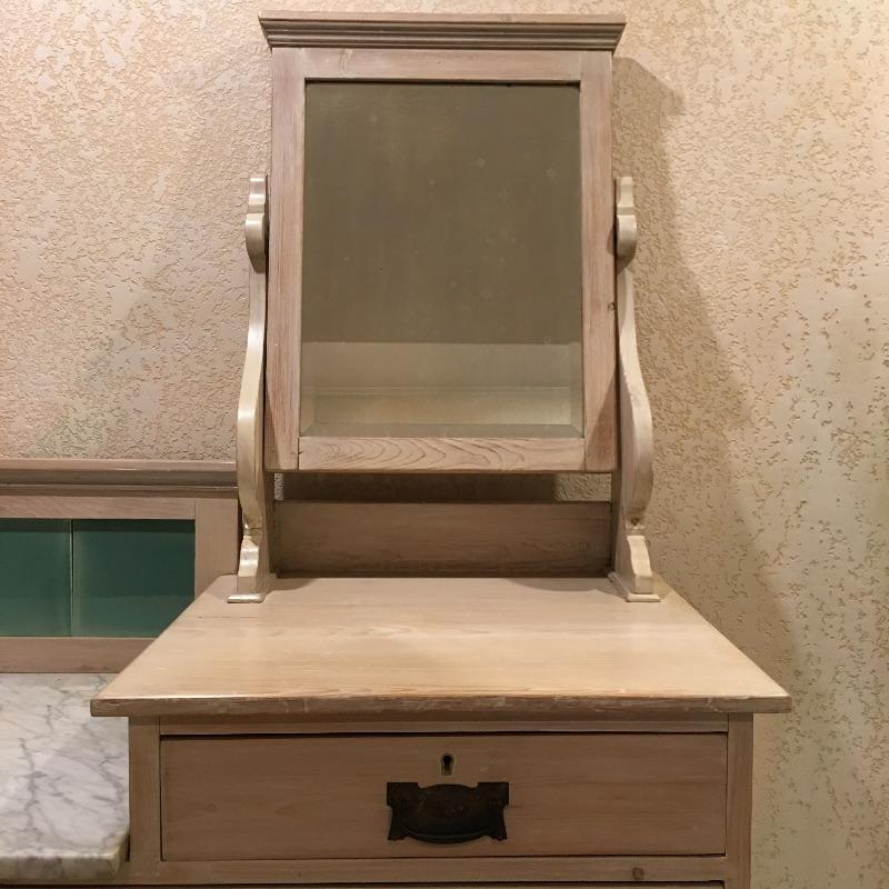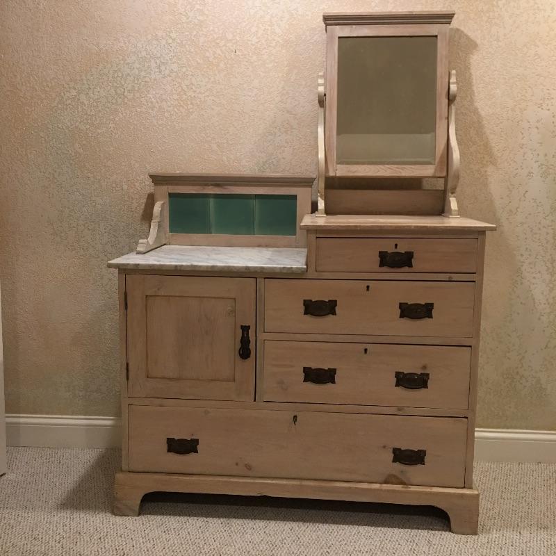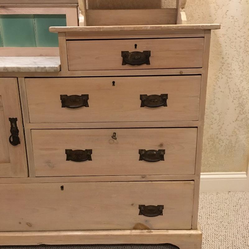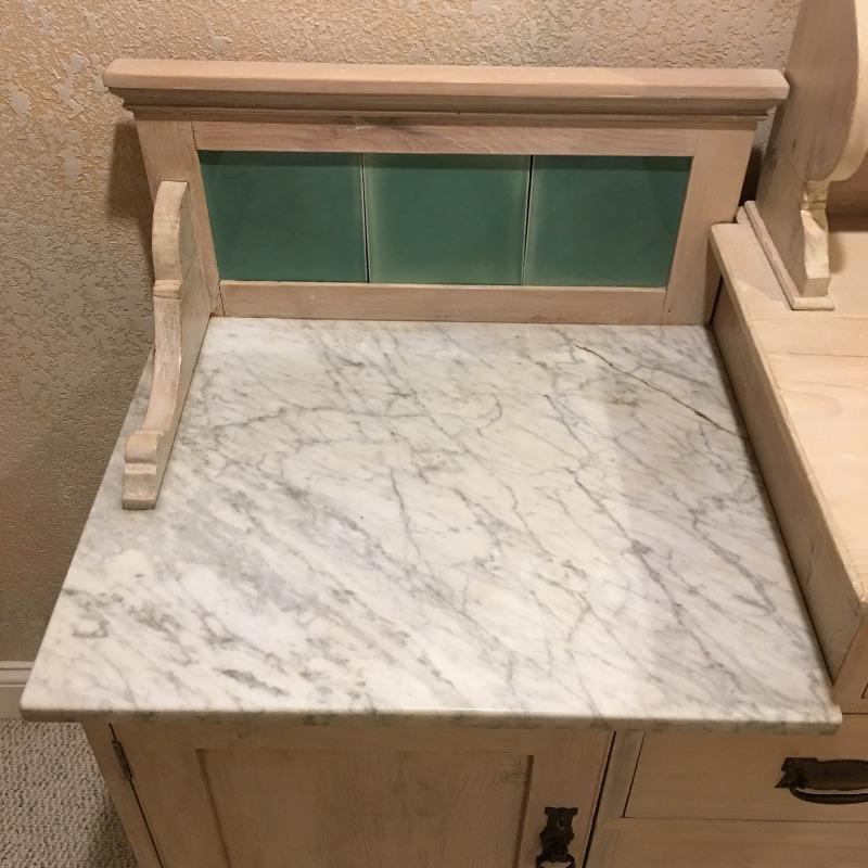Four drawer Marble top vanity with beveled mirror and tile design. Marble top has crack - see pictures. Vanity has key and measures 18” x 41.5” x 61”.