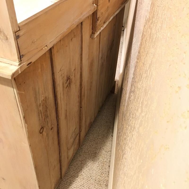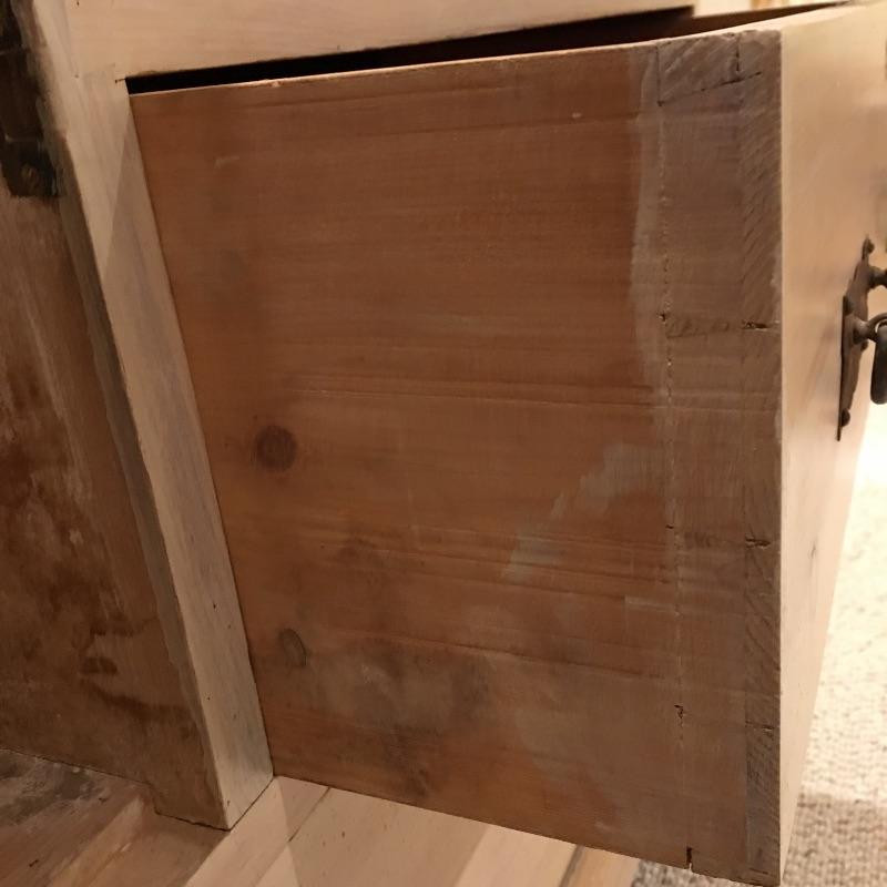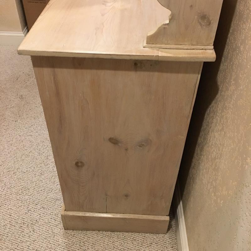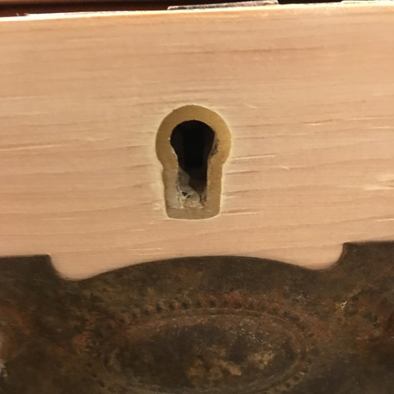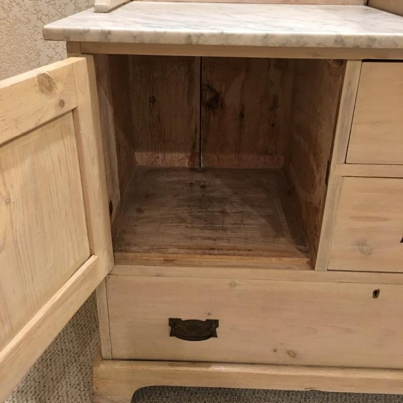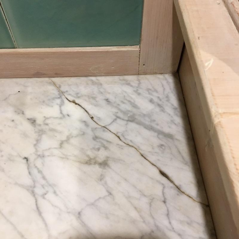 Four drawer Marble top vanity with beveled mirror and tile design. Marble top has crack - see pictures. Vanity has key and measures 18” x 41.5” x 61”.
