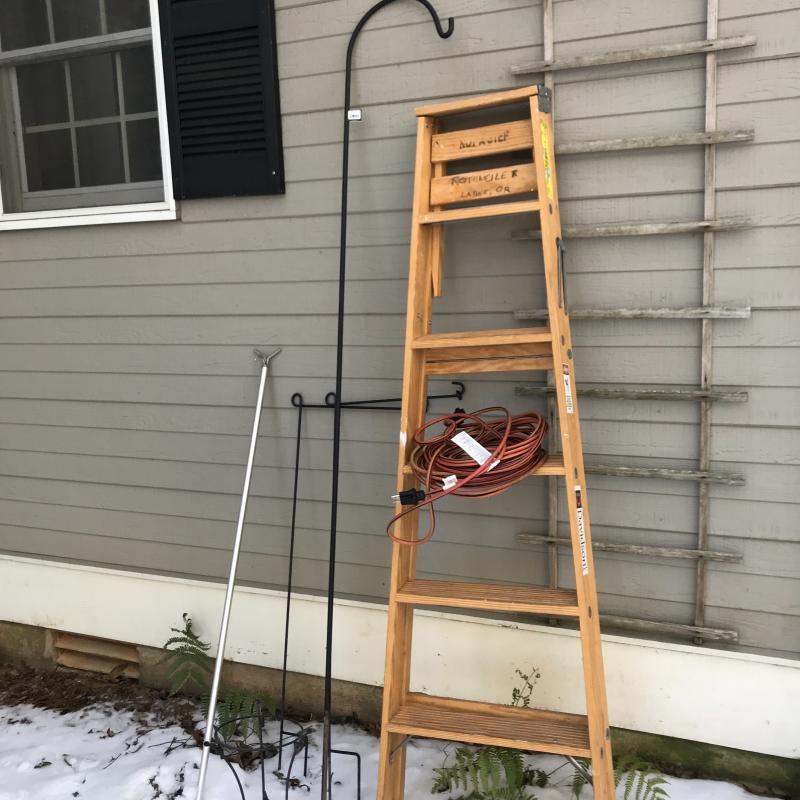 6-foot wooden ladder, bird feeder metal stands, plant stand, electrical cord and pole grabber. No shipping. Local pick up only in Flat Rock, NC.