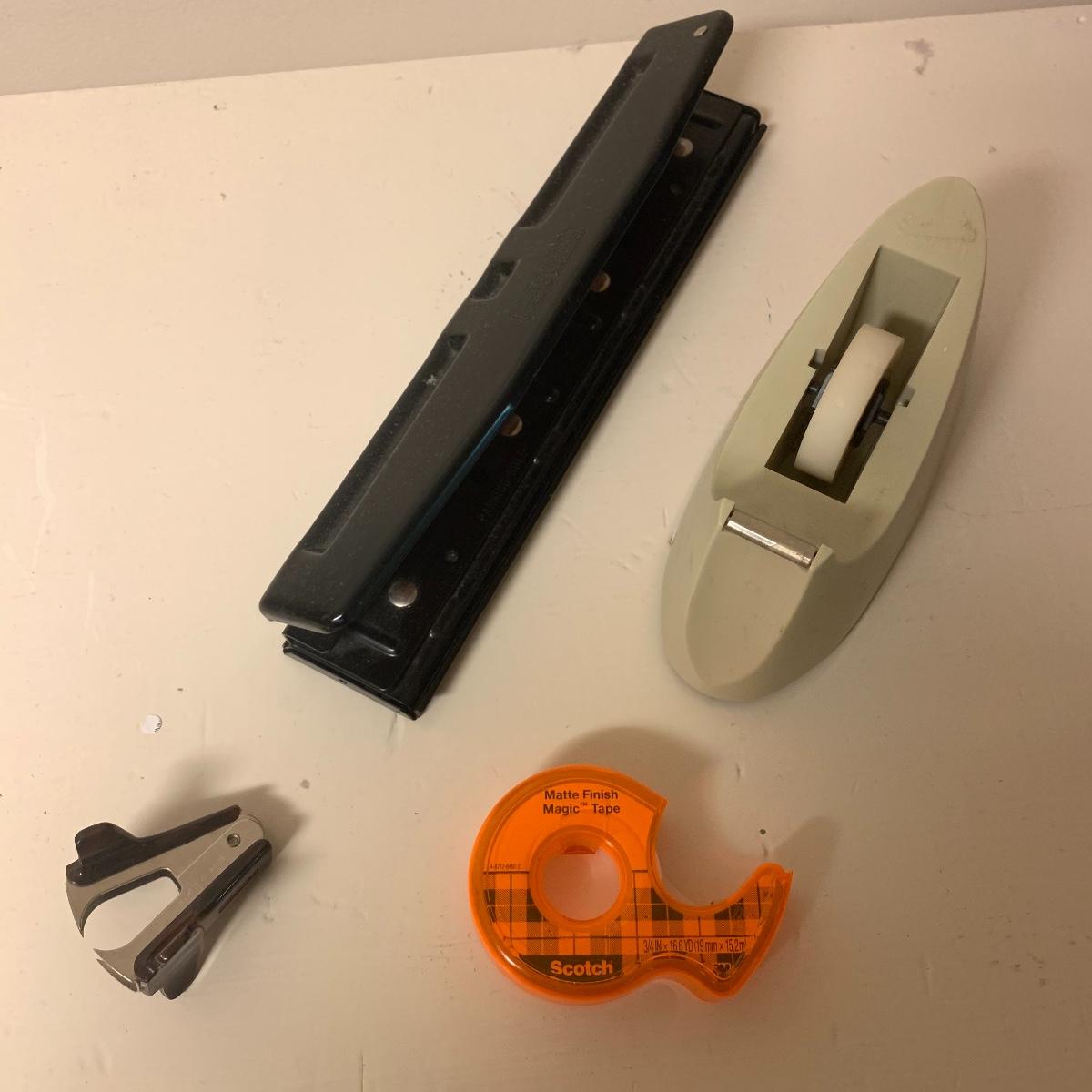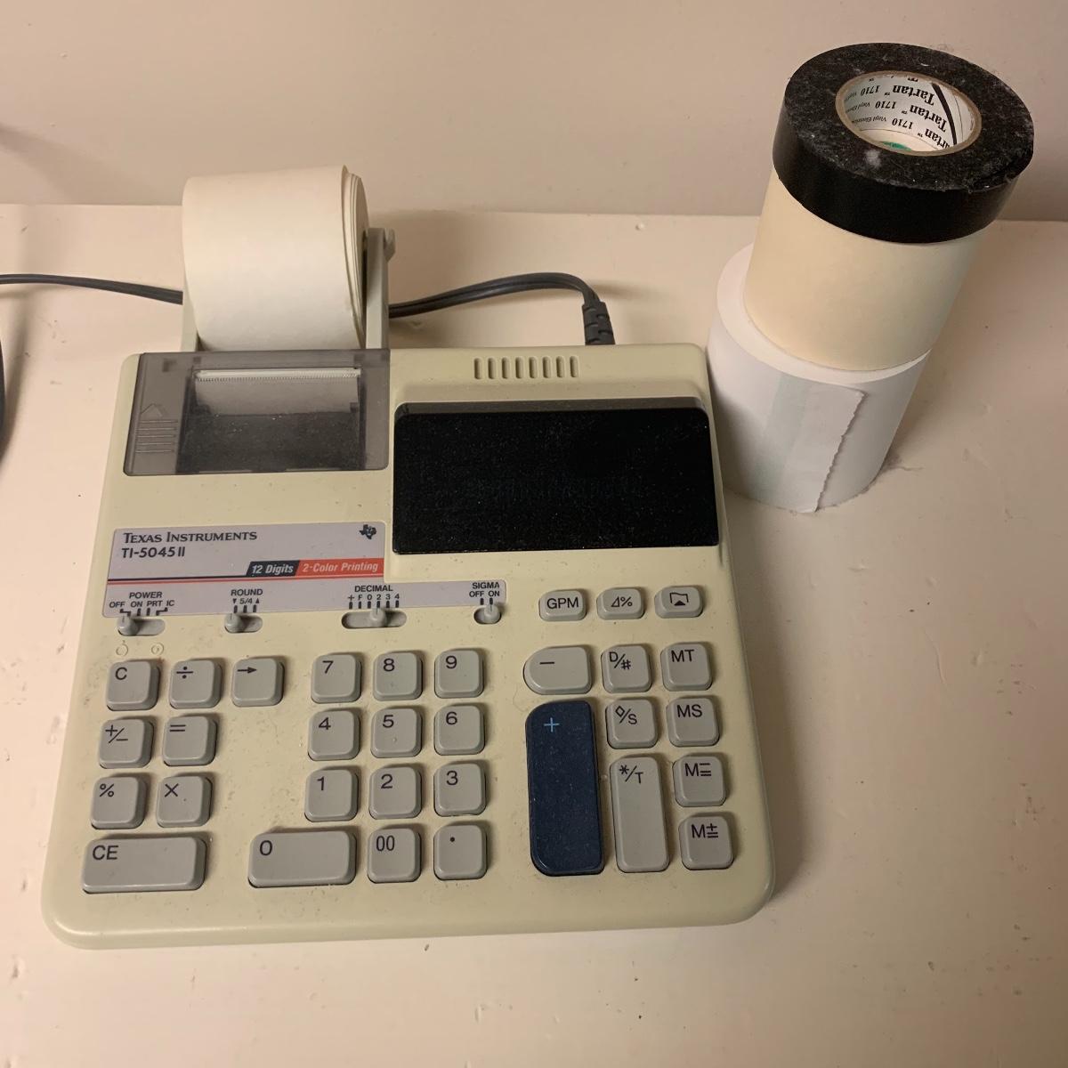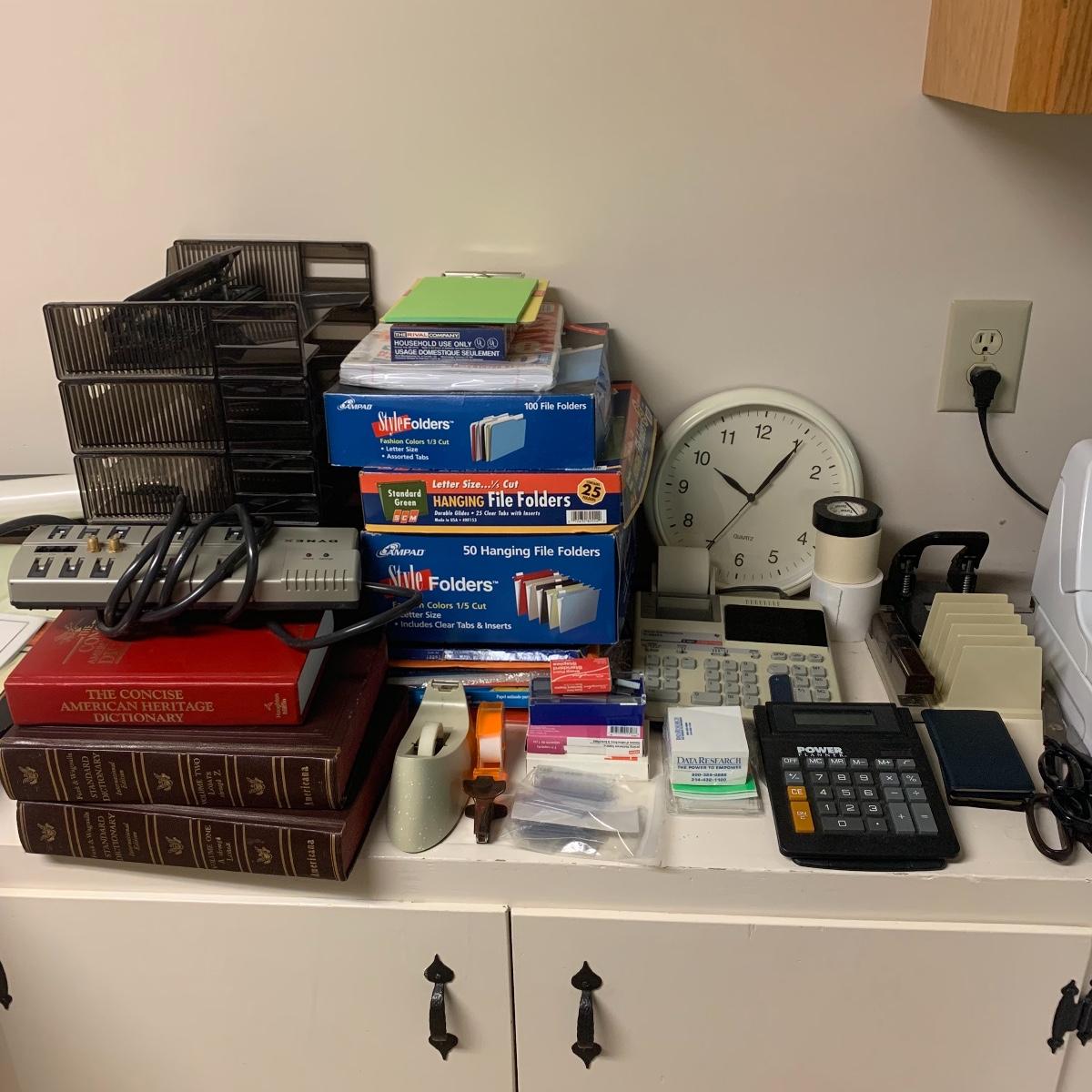 This lot includes desk organizers, scissors, dictionaries, cards and envelopes, photo paper, carbon paper, calculators, file folders, a clock, a power strip and more. The lot also includes a Texas Instruments TI-5045II calculator. Cannot confirm the Texas Instruments calculator works. The clock appears to be working. The dictionaries included in the lot are The Concise American Heritage Dictionary and a two volume set of the Funk & Wagnalls Standard Dictionary A-Z.