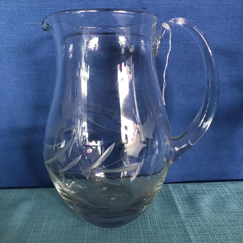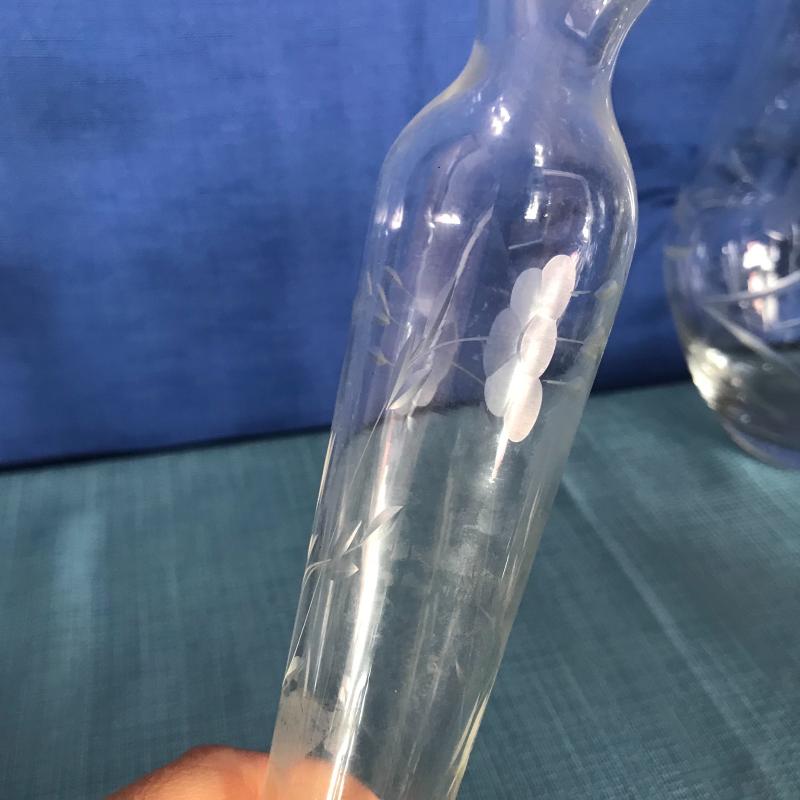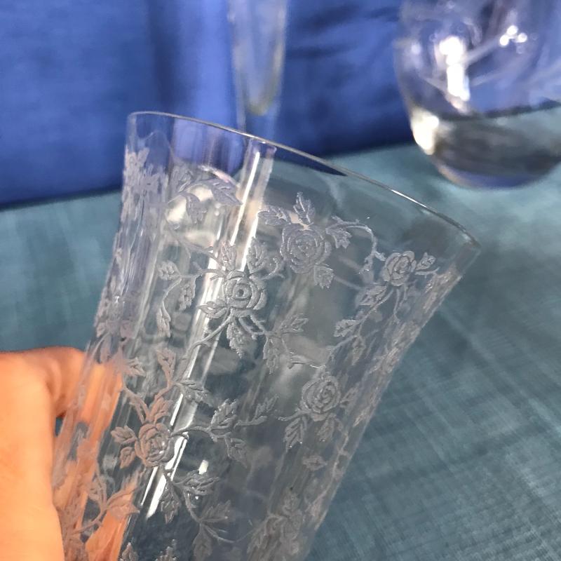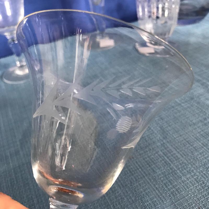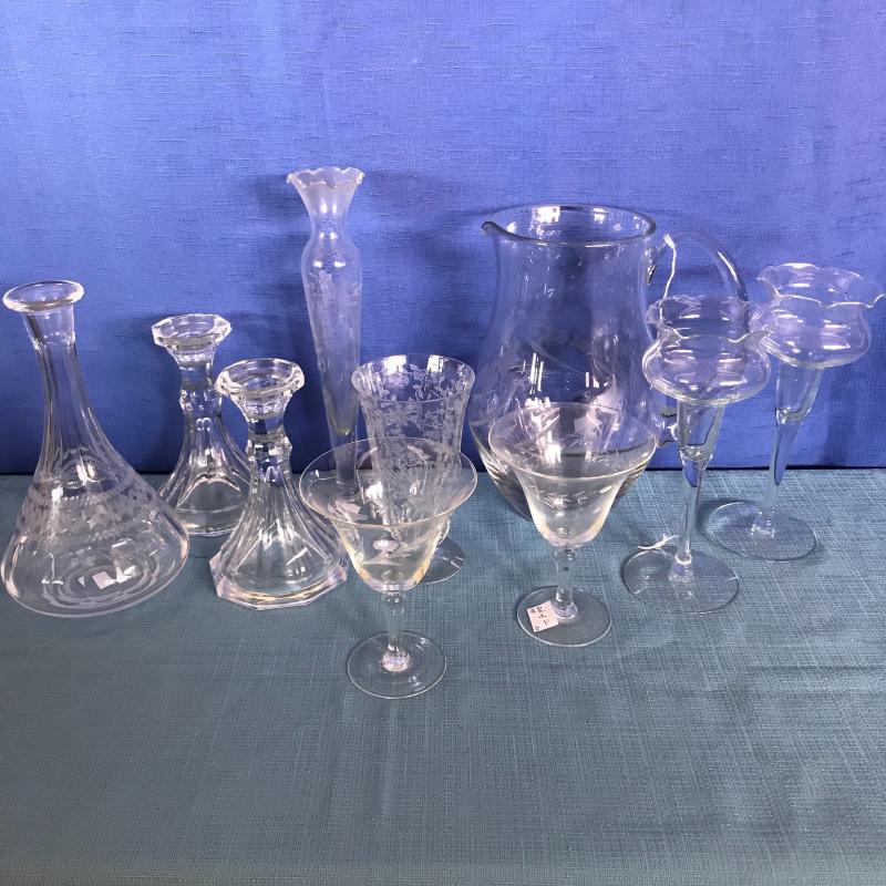 Lot includes pitcher (approx. 9”h), pair of candlesticks, decanter (with no top), vase, pair of goblet-like glasses, pair of cordial glasses, and single glass. Most are etched. See pics. No shipping available. Local pickup only in Maggie Valley, NC.