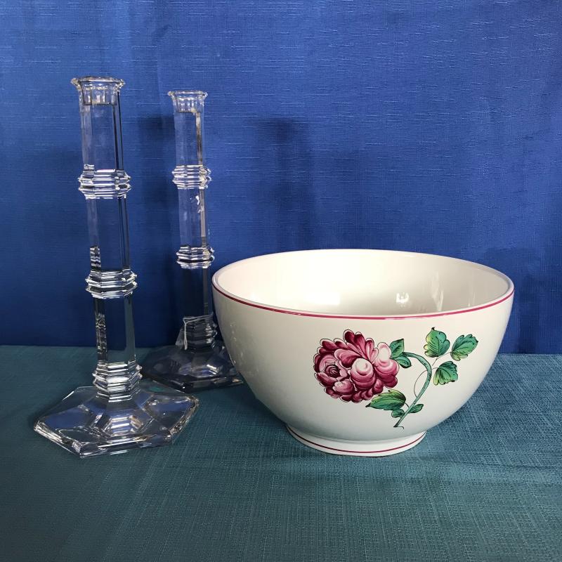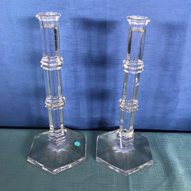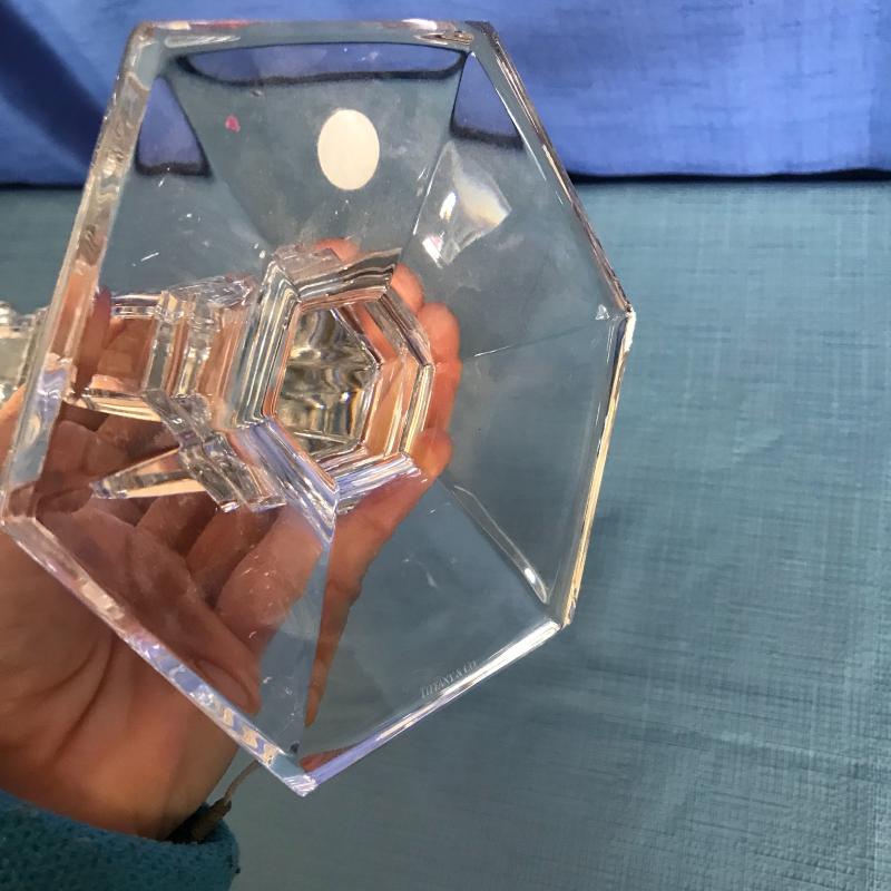Lot includes Tiffany and Co. bowl (9.5” diameter), and Tiffany and Co. pair of glass candlestick holders (approx. 11” tall). No shipping available. Shipping available or local pickup in Maggie Valley, NC.