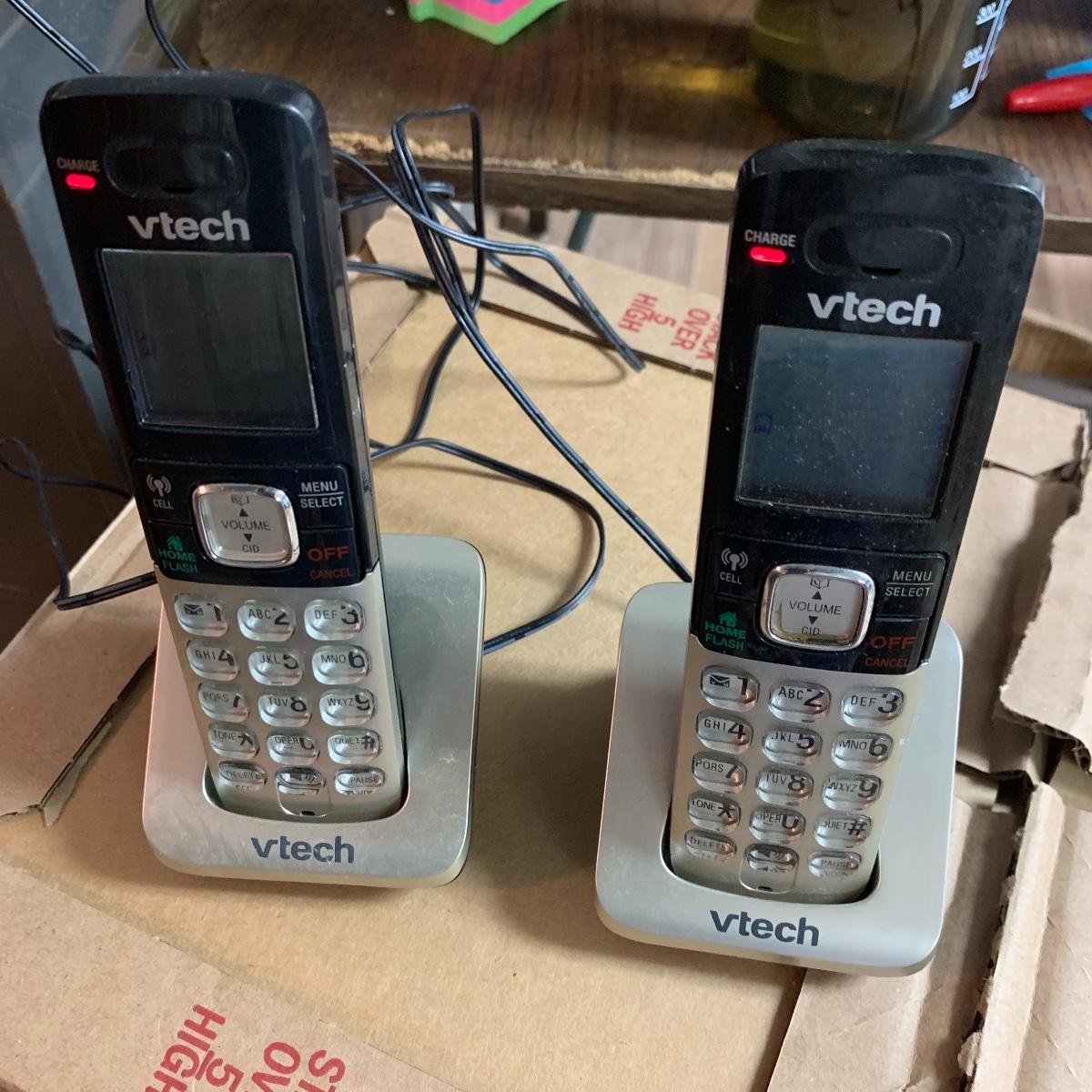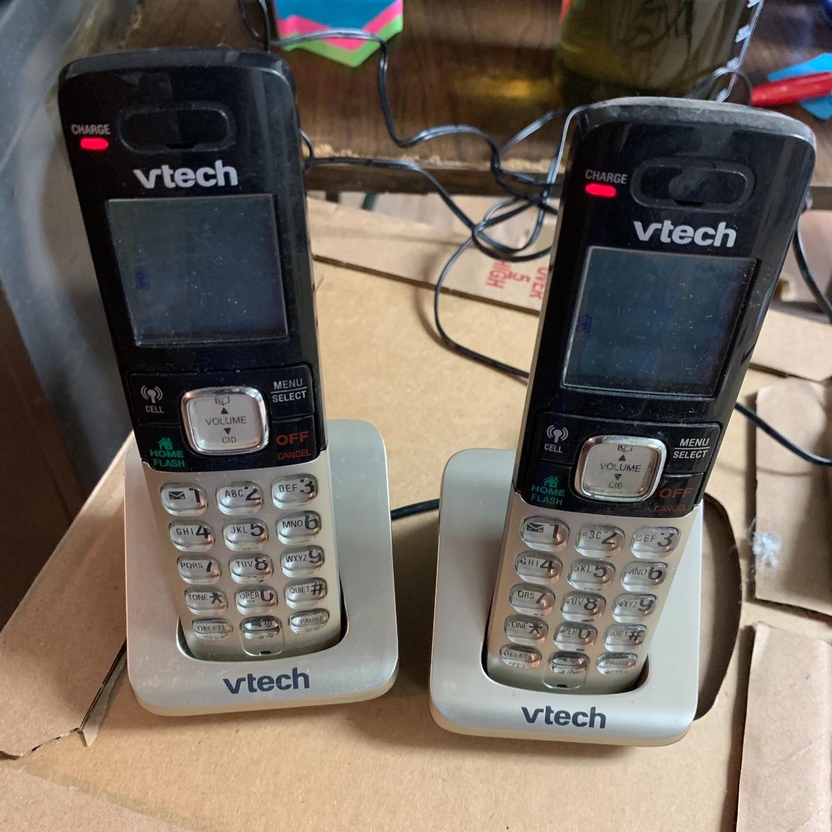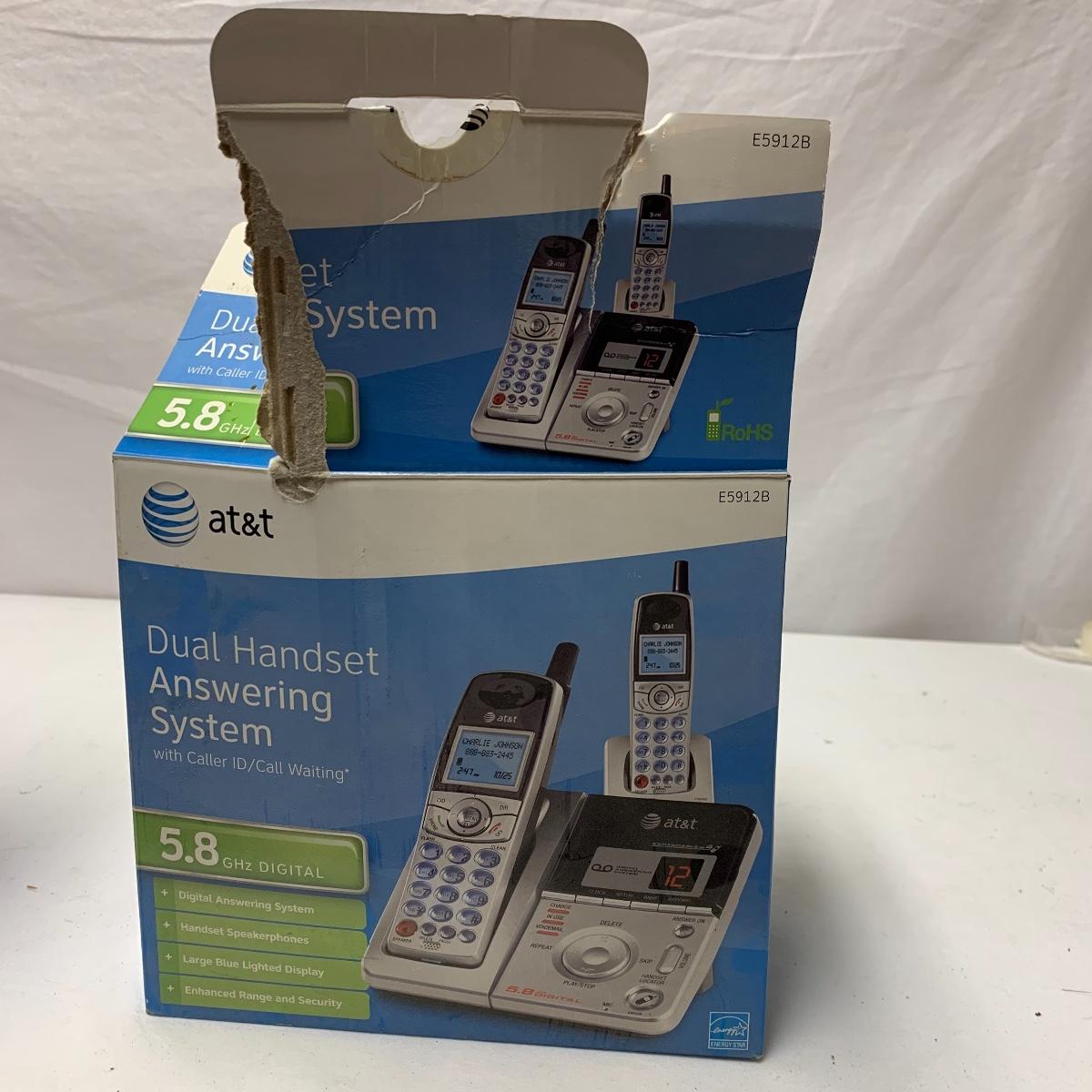 The other vtech system is model IA5874. It has two handsets and a digital answering system. The AT&T set is model E5912B Dual Handset Answering System with caller ID and call waiting. All systems and charging docks power on when plugged in. The cute yellow floral vintage bin they are stored in is also included. Local pickup only.