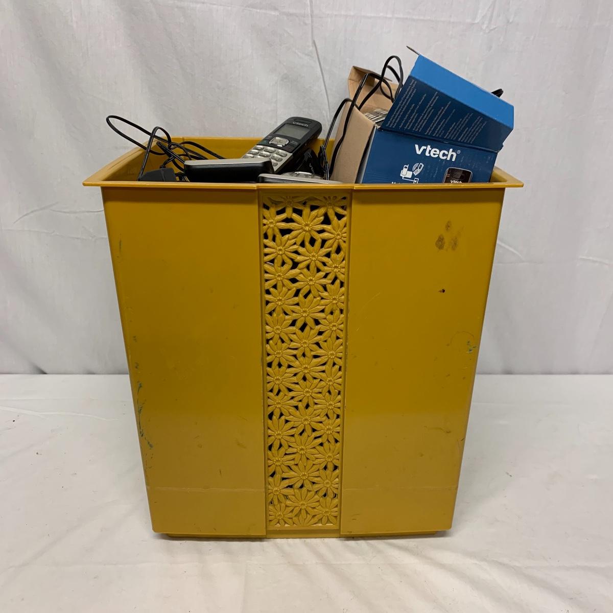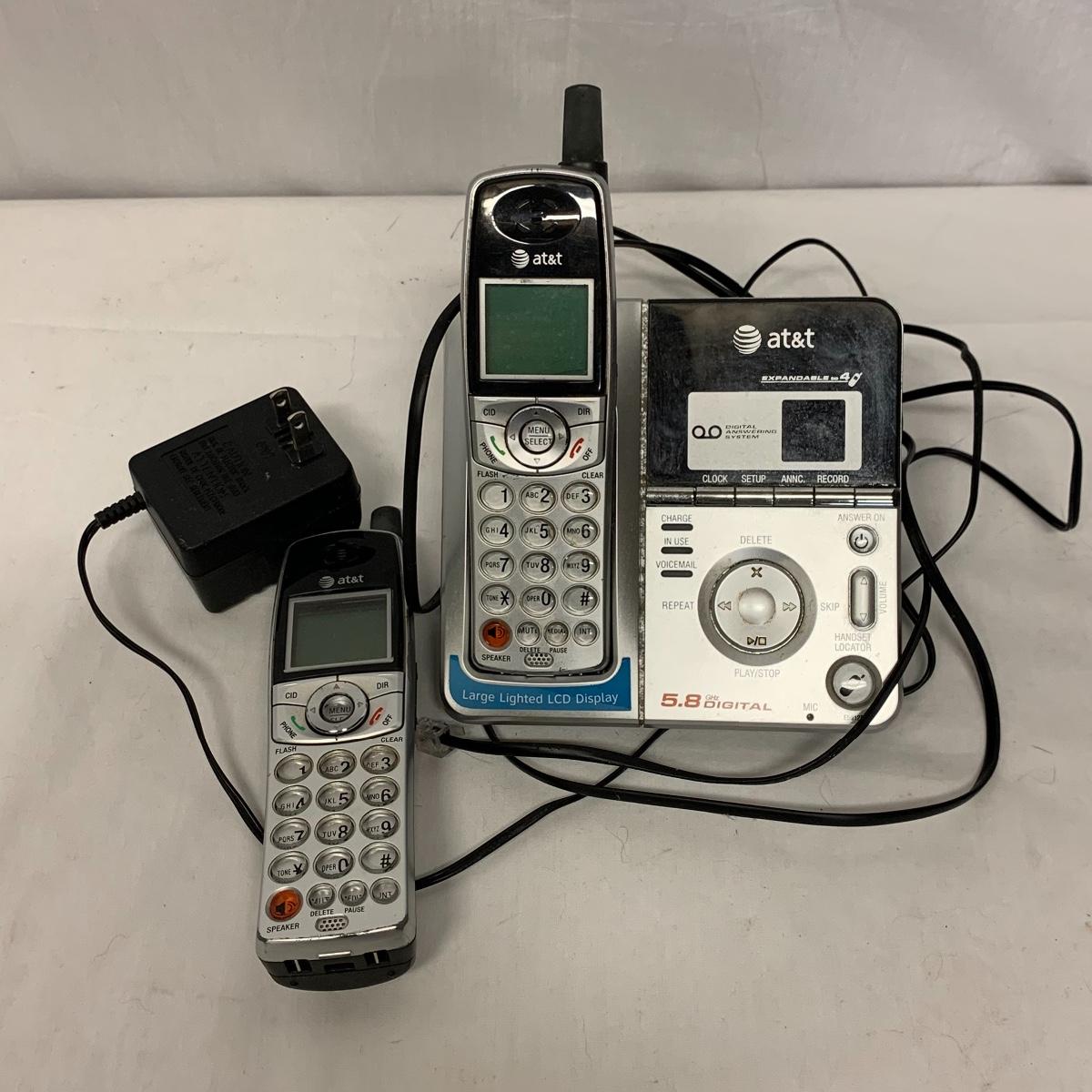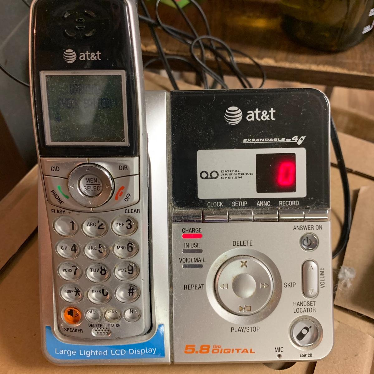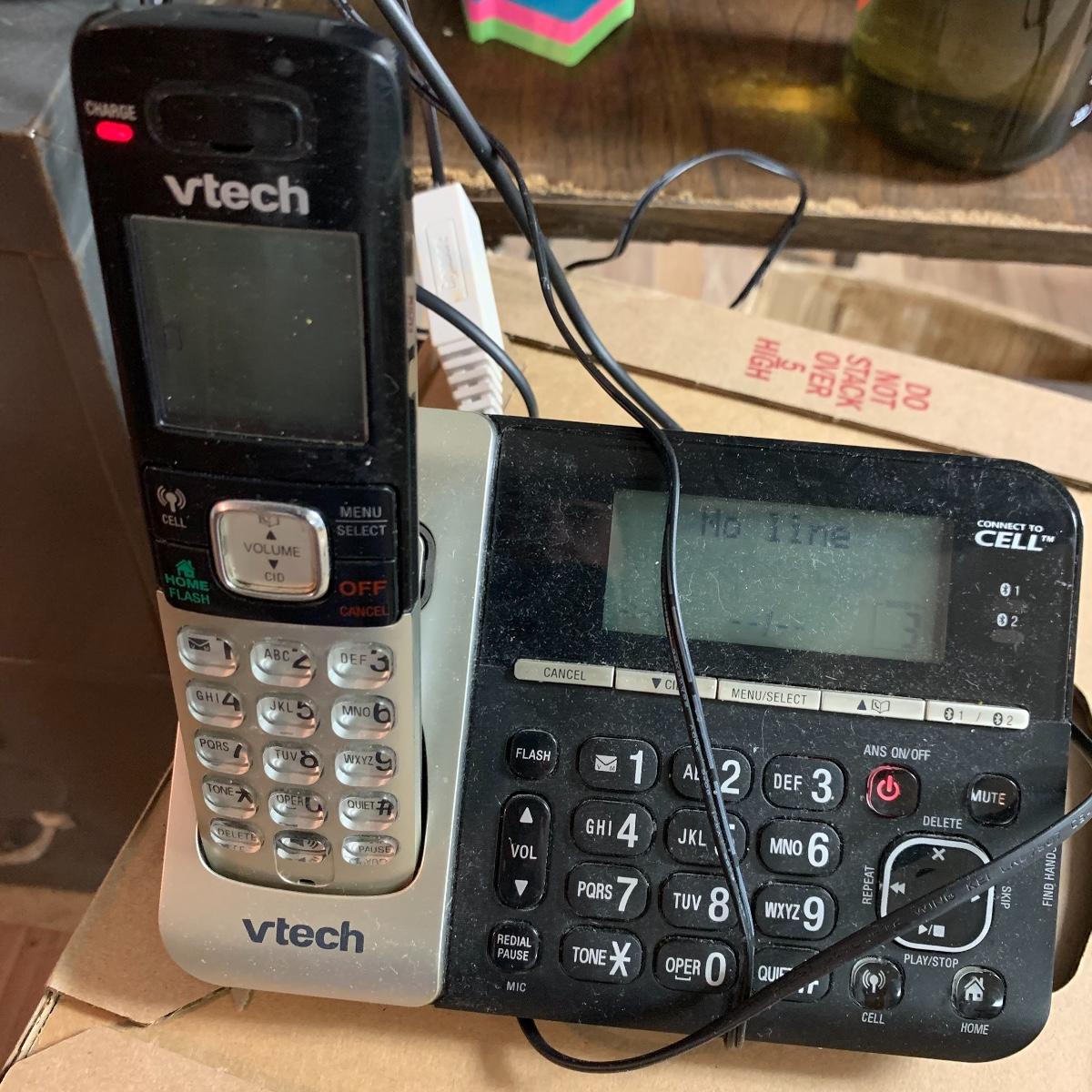 The other vtech system is model IA5874. It has two handsets and a digital answering system. The AT&T set is model E5912B Dual Handset Answering System with caller ID and call waiting. All systems and charging docks power on when plugged in. The cute yellow floral vintage bin they are stored in is also included. Local pickup only.