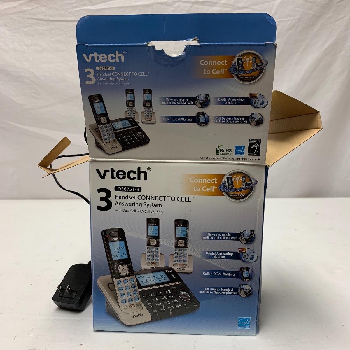 This lot contains three vtech phone systems and an AT&T phone system. Two of the vtech systems are DS6751-3 Handset Connect to Cell Answering Systems with dual caller ID and call waiting. Each of these have three handsets with one main base and answering system for one of the handsets and two other charging docks for the other two handsets.