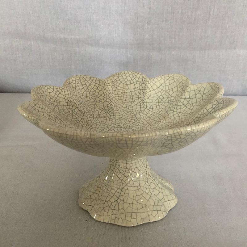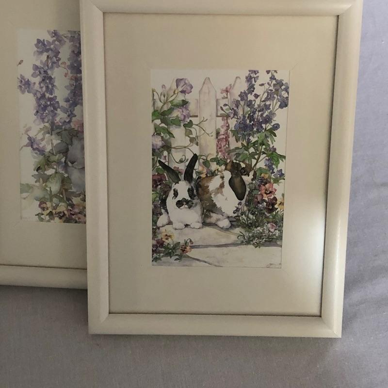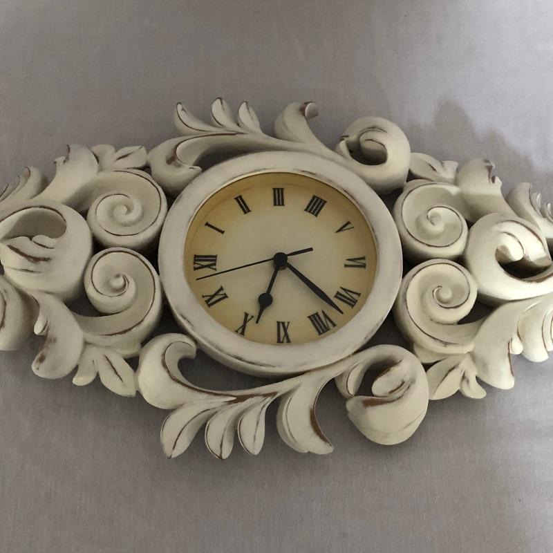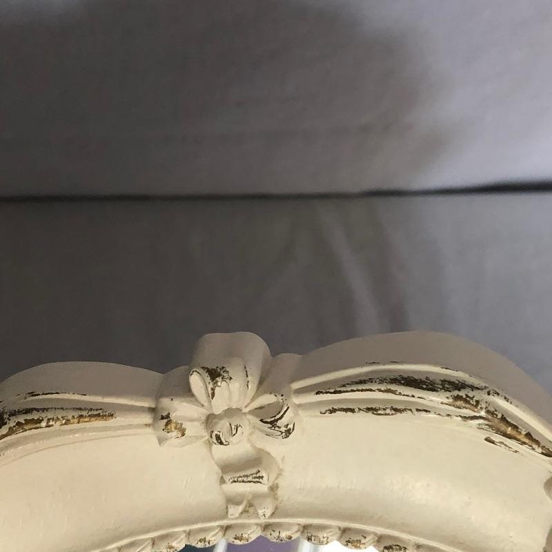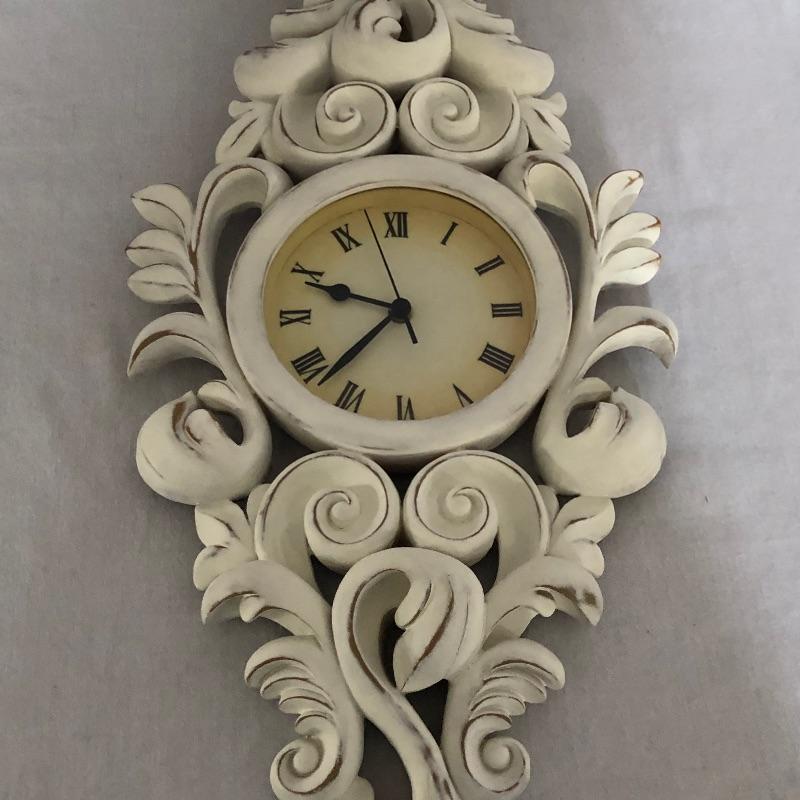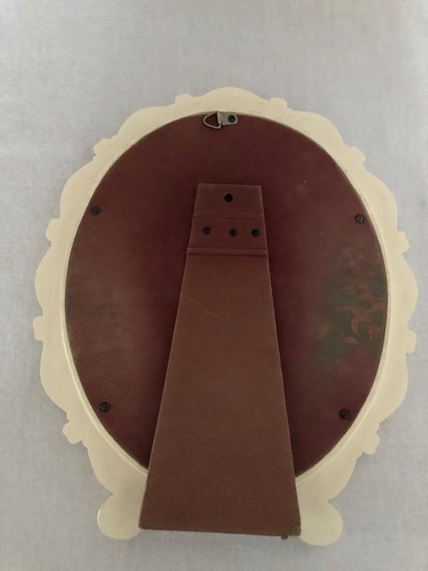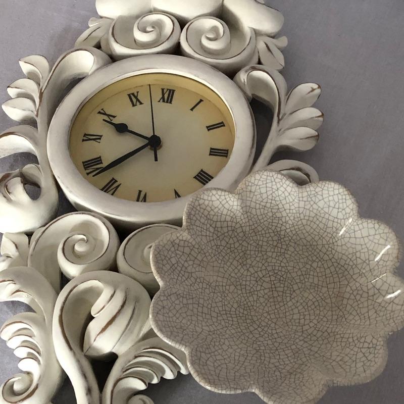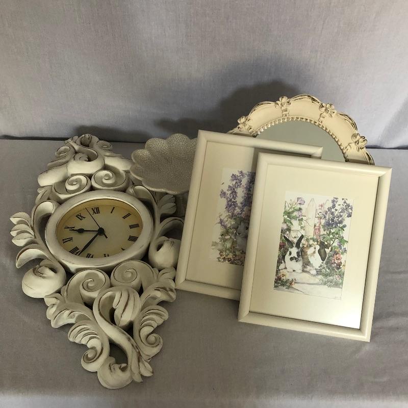 Unique collection including an ornate slightly shabby chic painted wood wall clock, oval shaped mirror ready to hang or stand on a table, patterned dish with pedestal, and two framed pieces of art with spring motif.