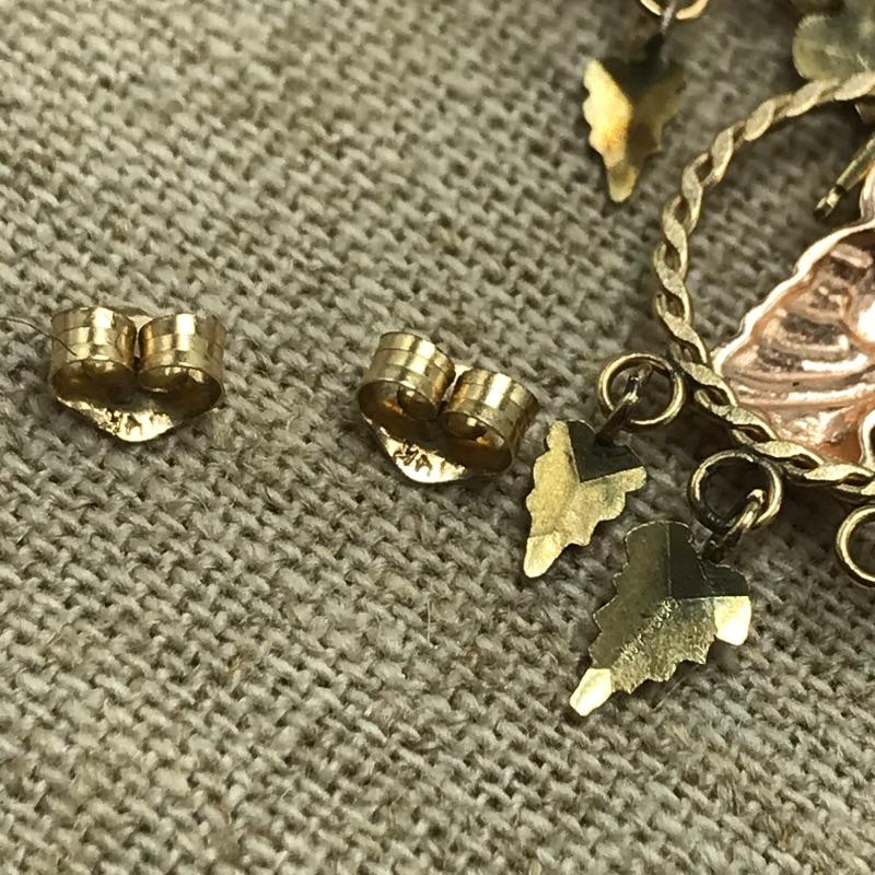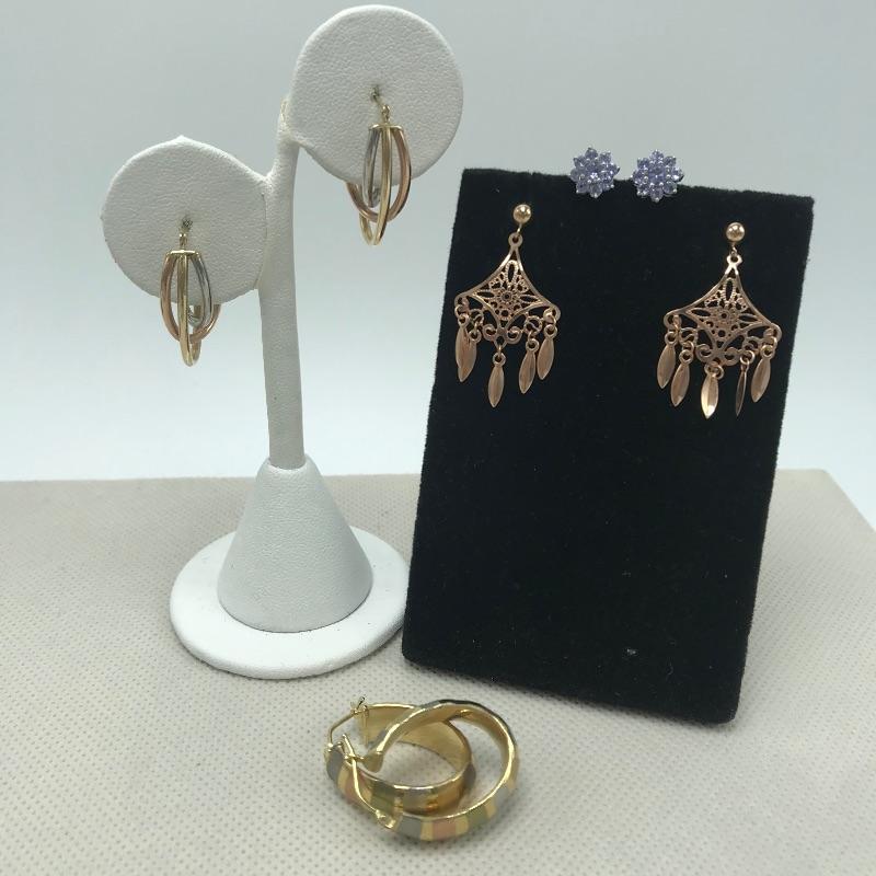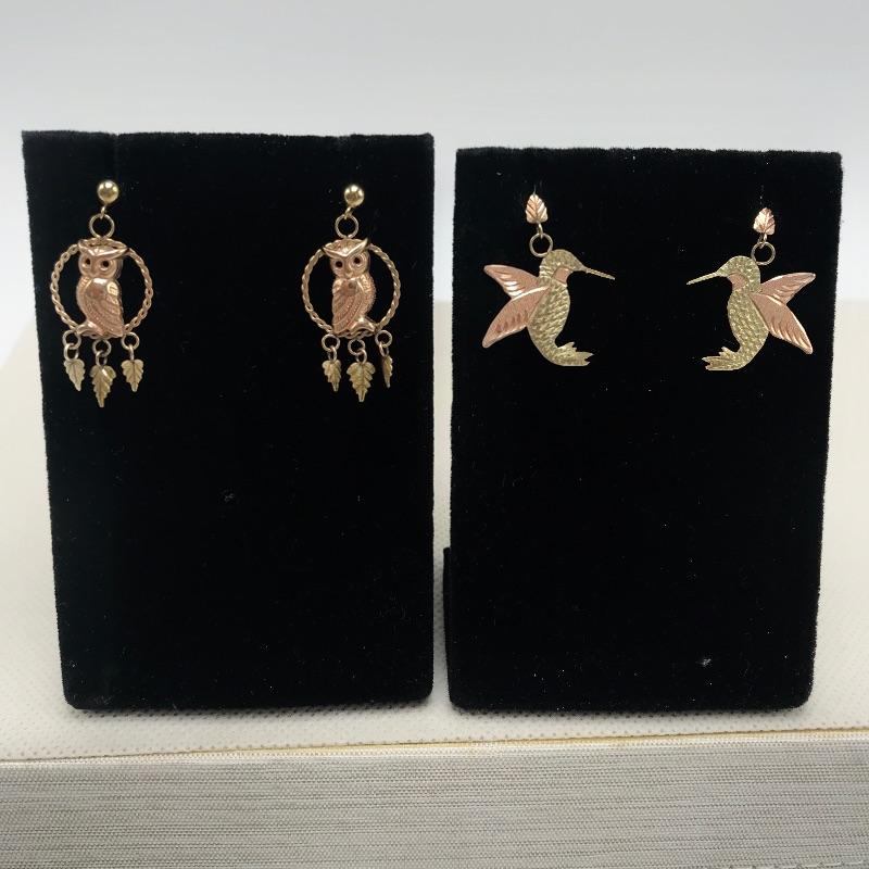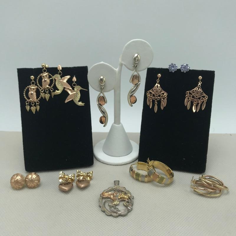 Precious metal earrings and pendant! Pendant is a mix of a few metals, hummingbird and owl earrings appear to be marked 10K with 14K backs. The group photographed with the amethyst colored gems are all marked 14K. The heart/bow earrings and circle studs do not appear to have markings. Starting price based on melt value.