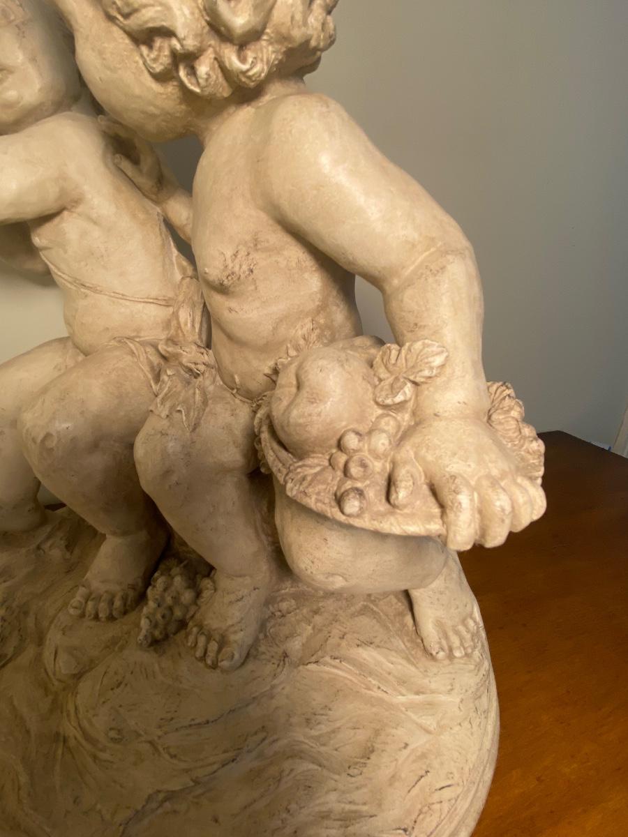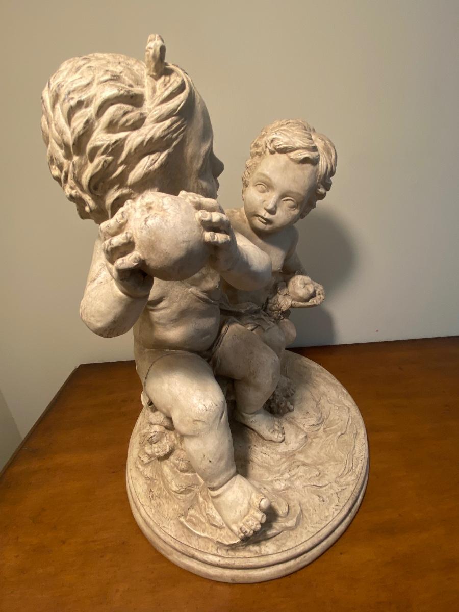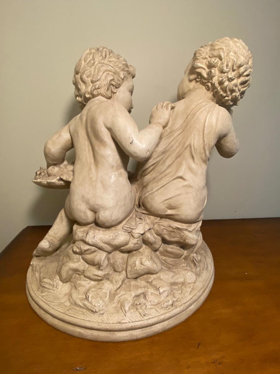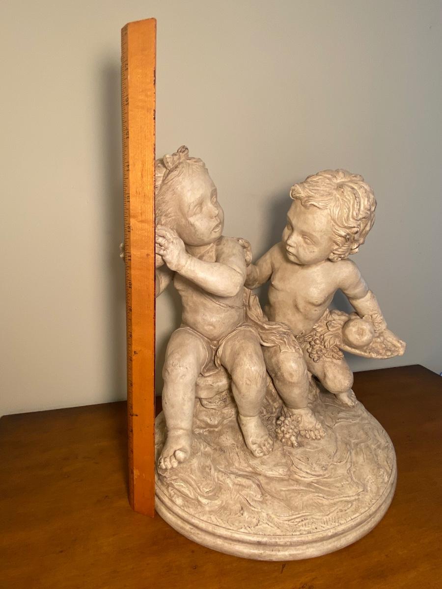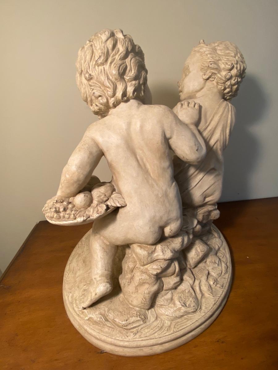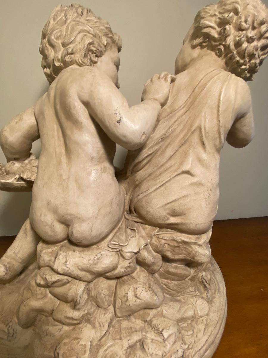 Sculpture has been kept inside. Materials seem to be a metal with Chalkware overlay. Piece is heavy.