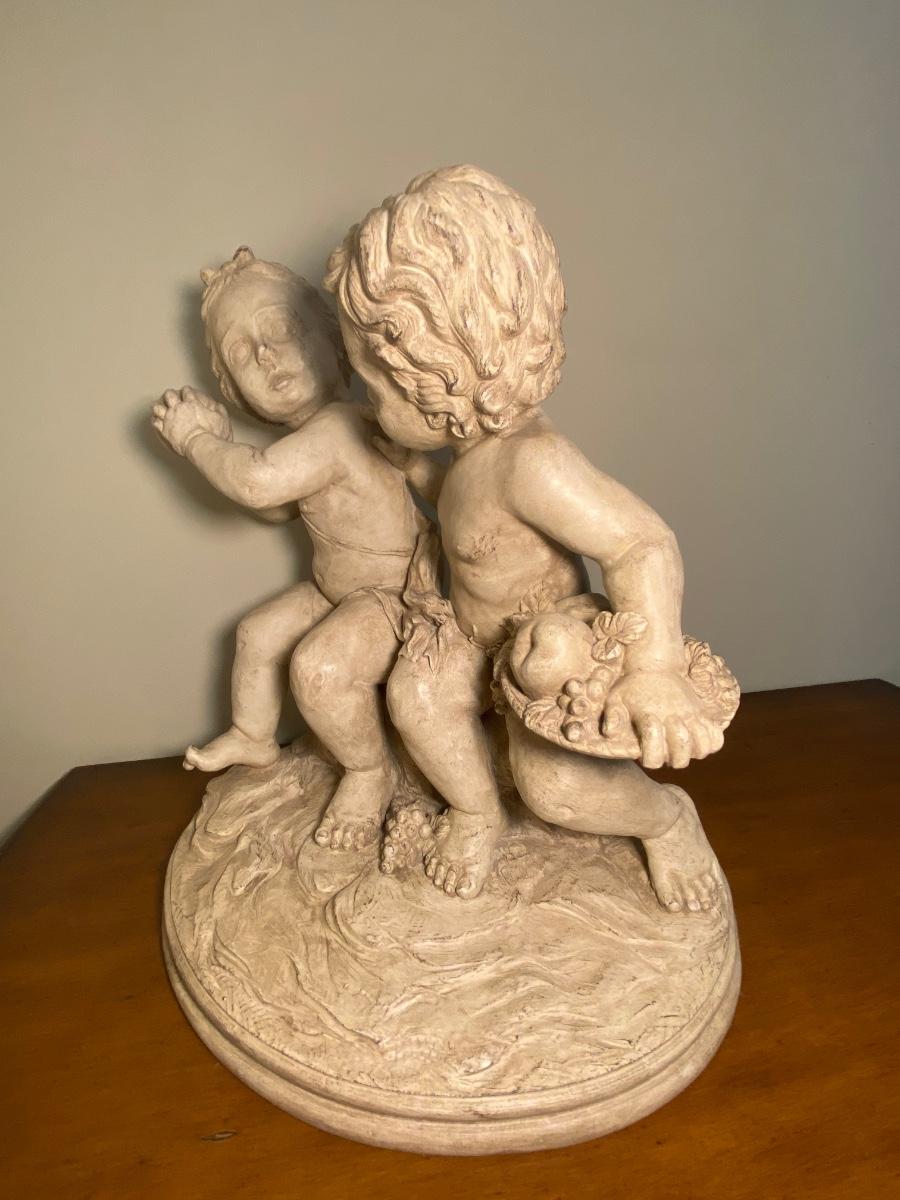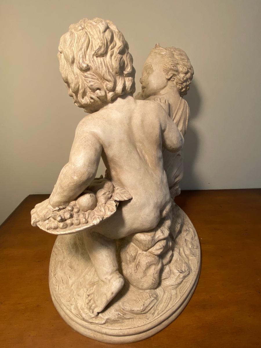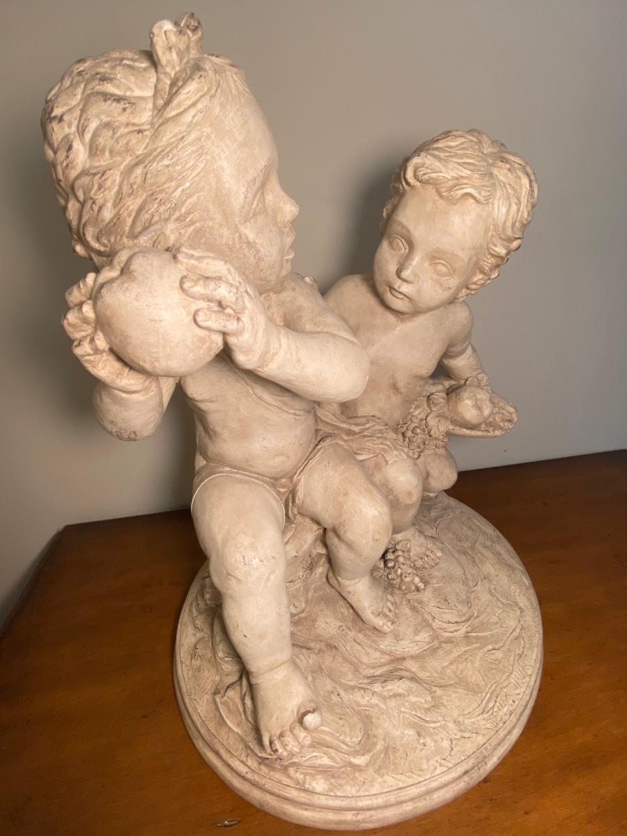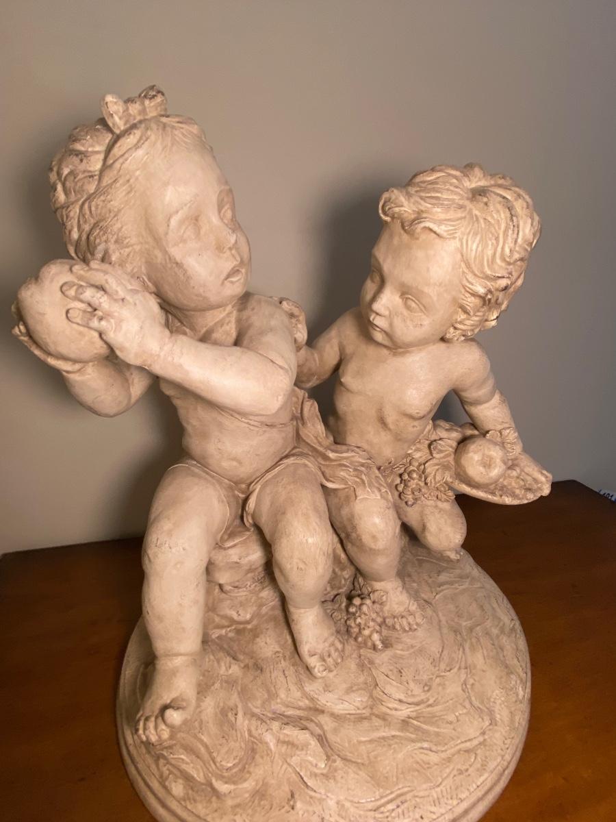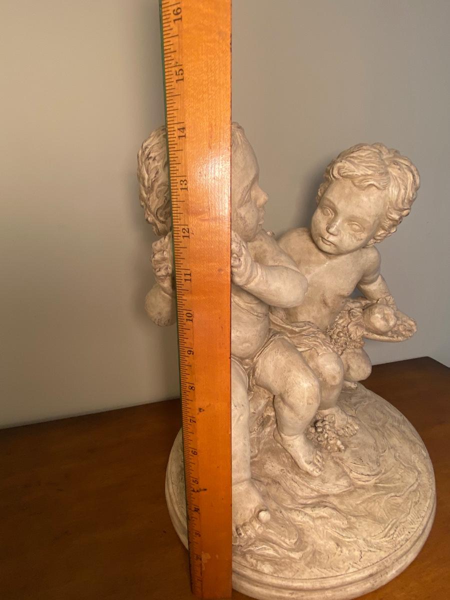 Sculpture has been kept inside. Materials seem to be a metal with Chalkware overlay. Piece is heavy.