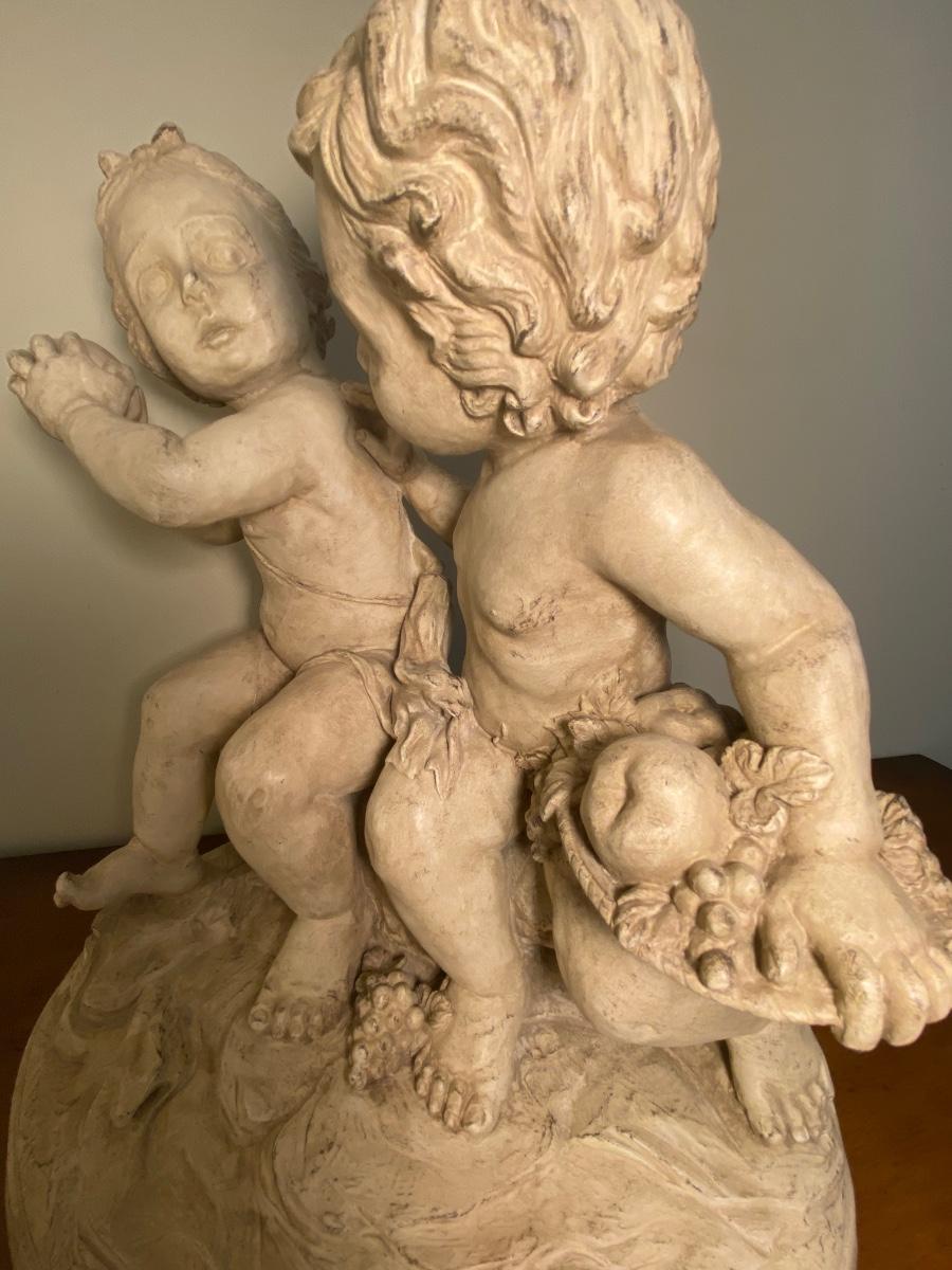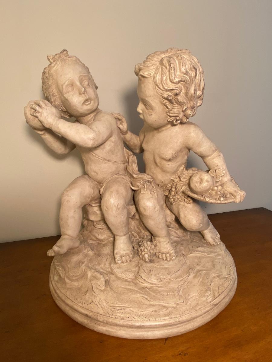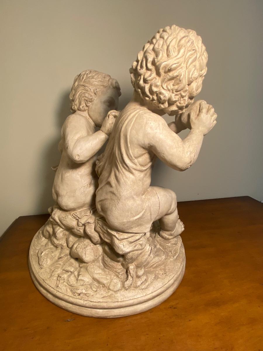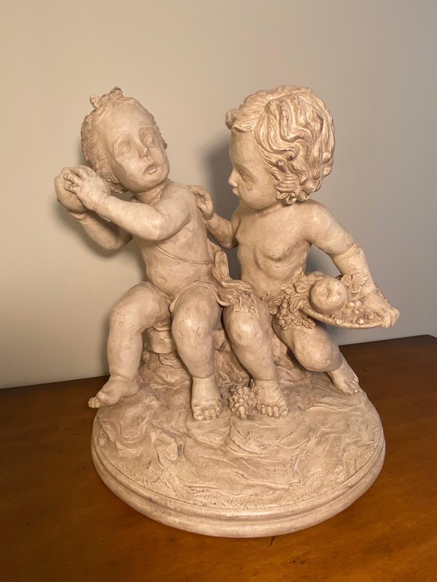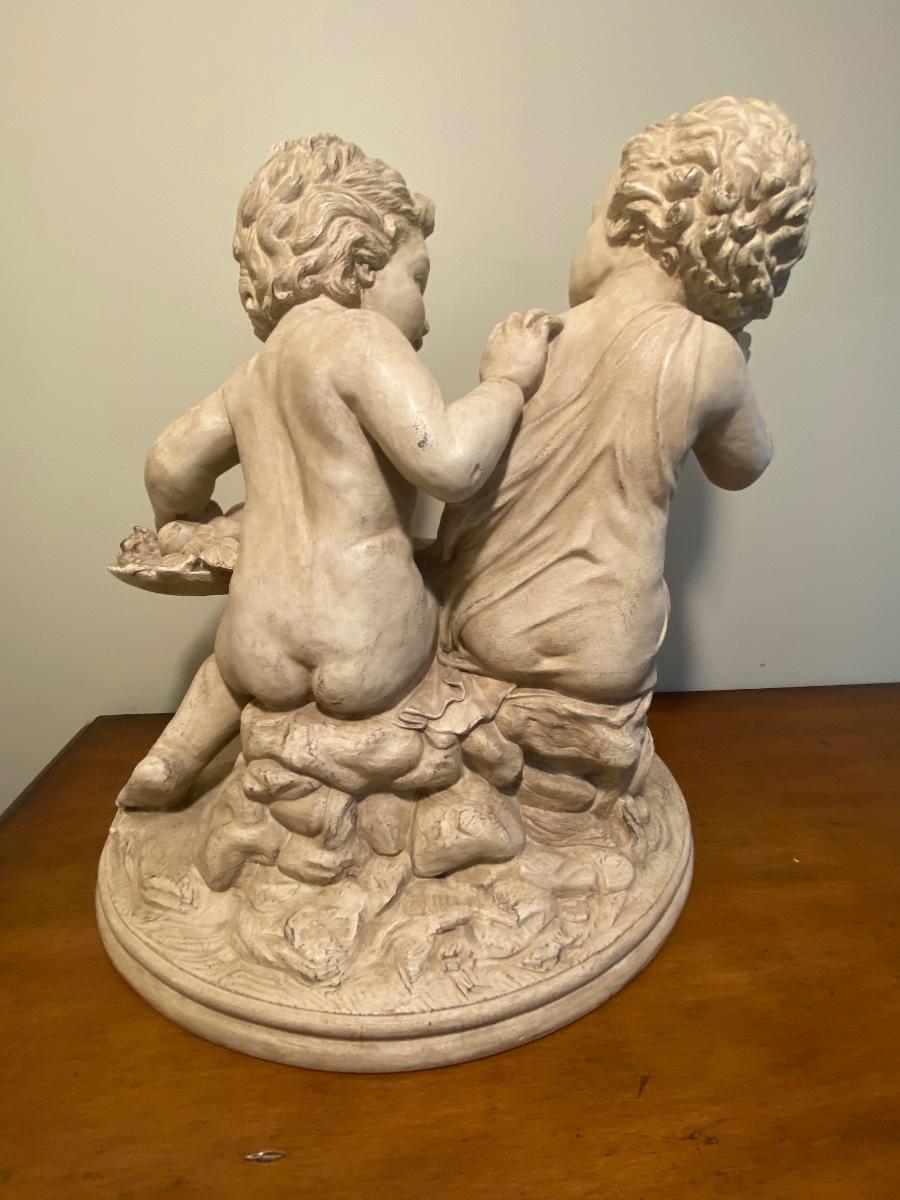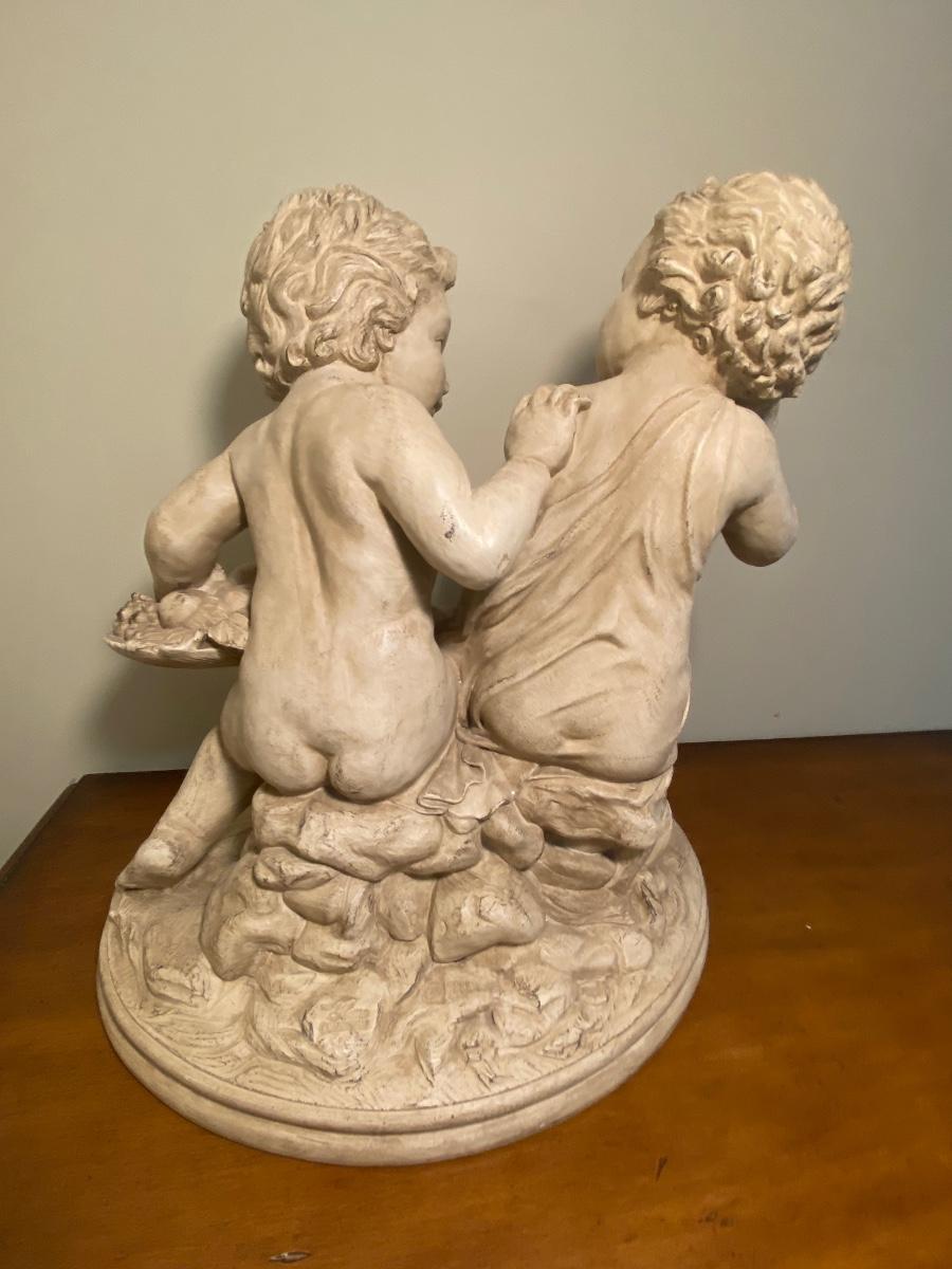 Sculpture has been kept inside. Materials seem to be a metal with Chalkware overlay. Piece is heavy.